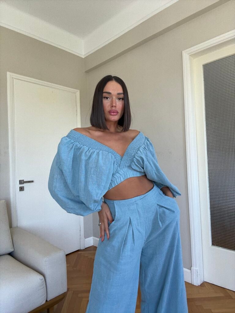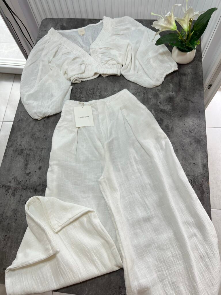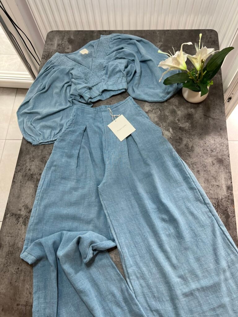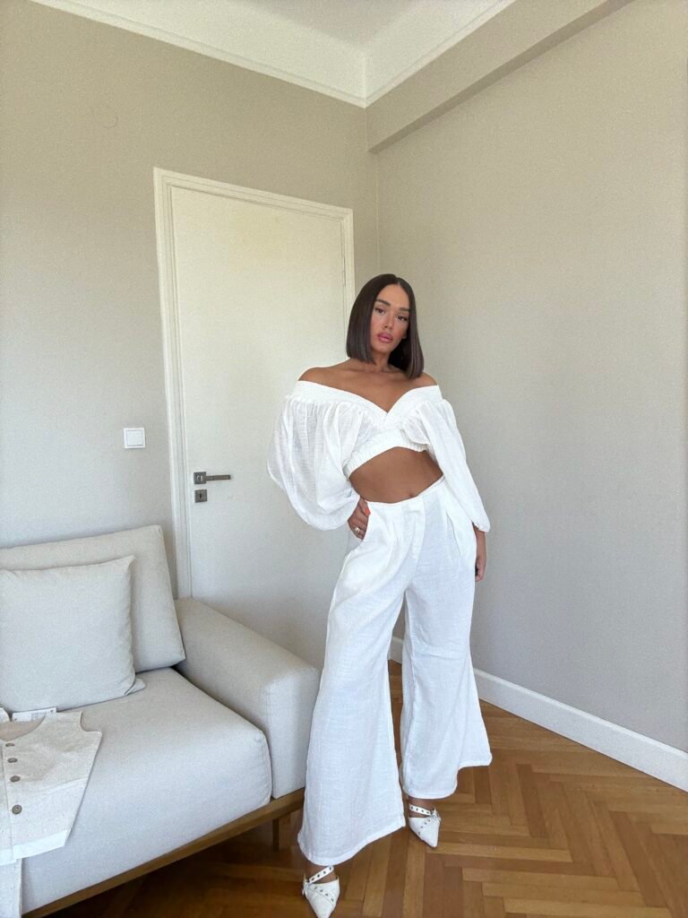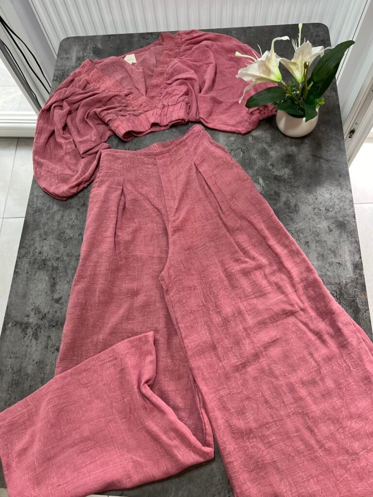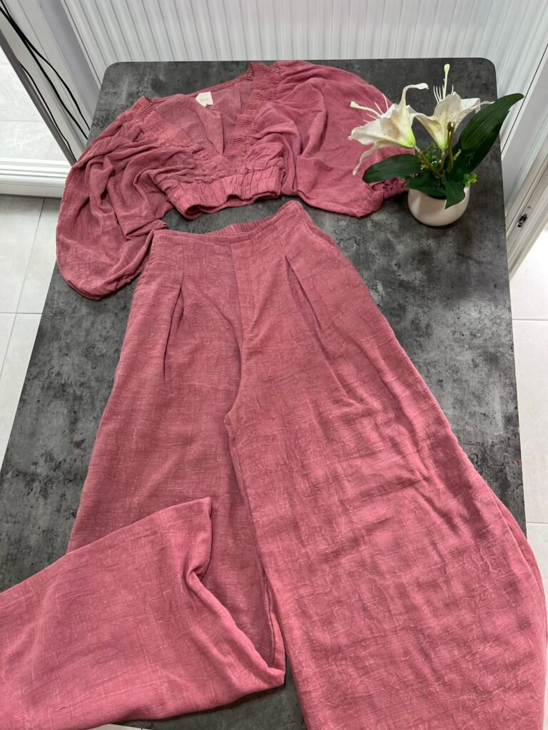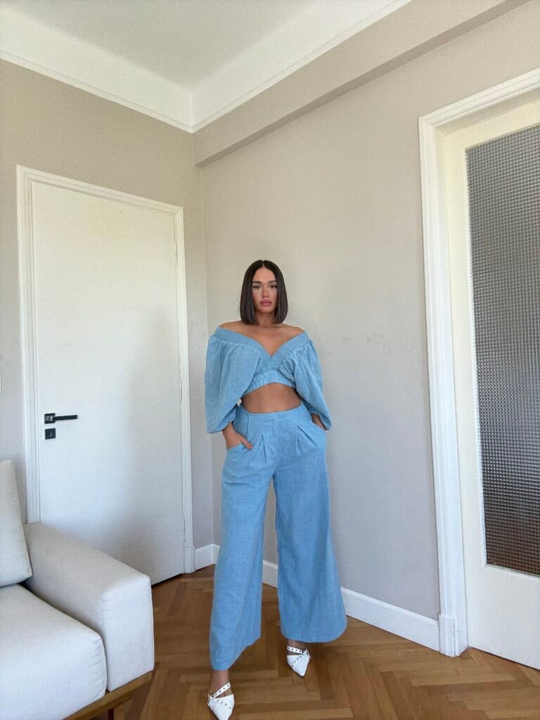 Pantallona të gjata me bel të lartë me punim pencash. Me llastik pas në bel. Përmbajnë xhepa funksionale. Crop top me mengë të shkurtra në punim llastiku. Në formë V ekspozon dekoltene.