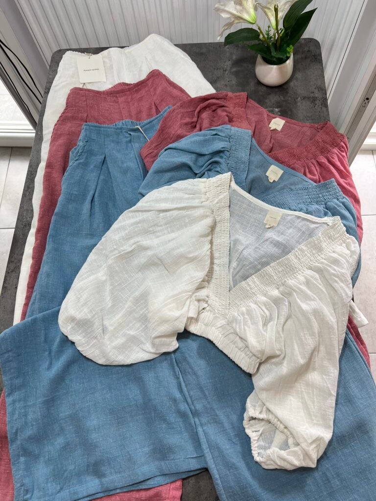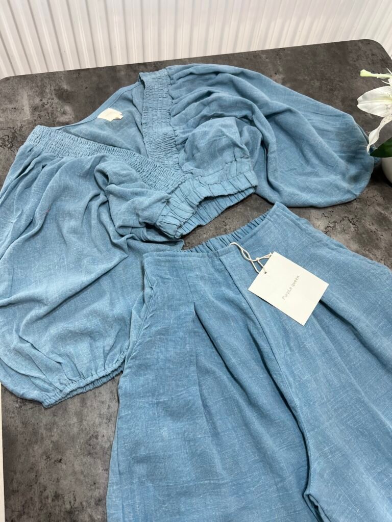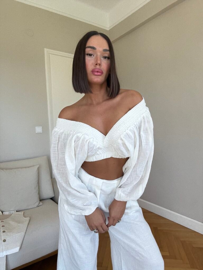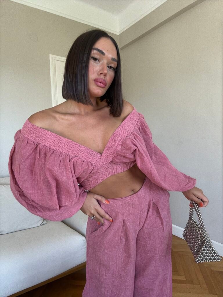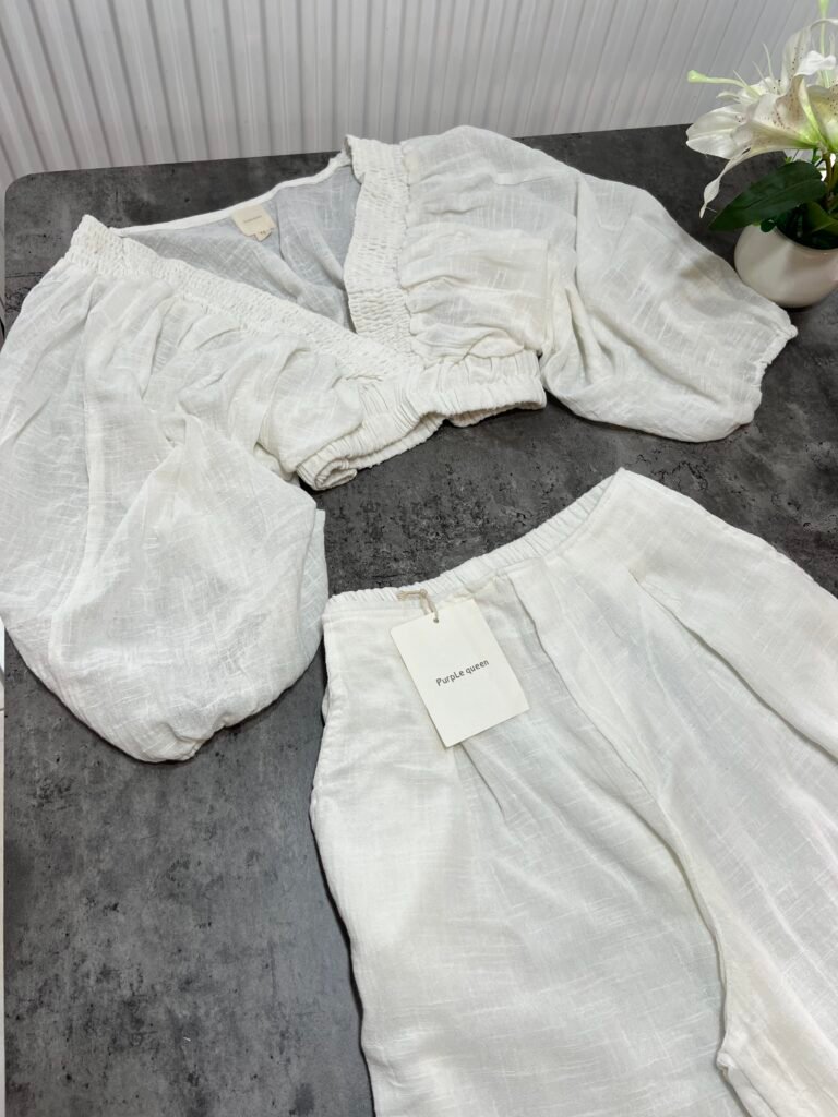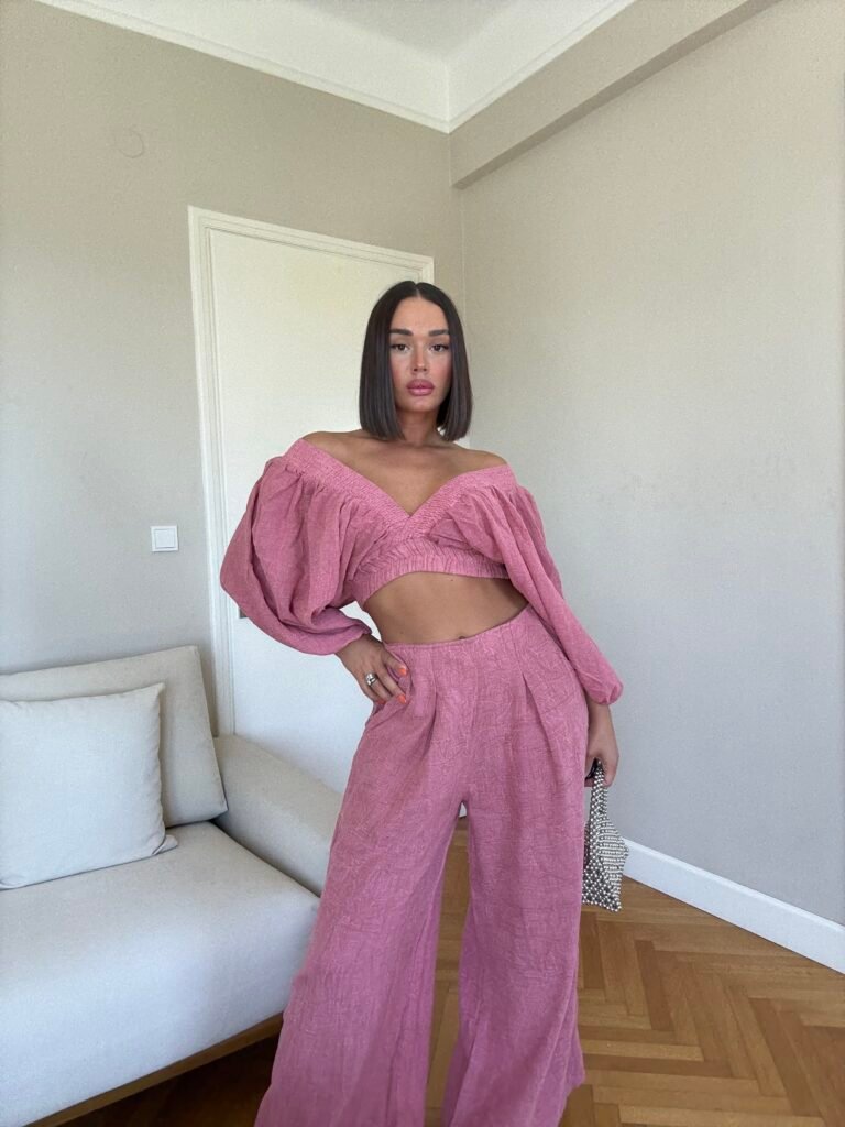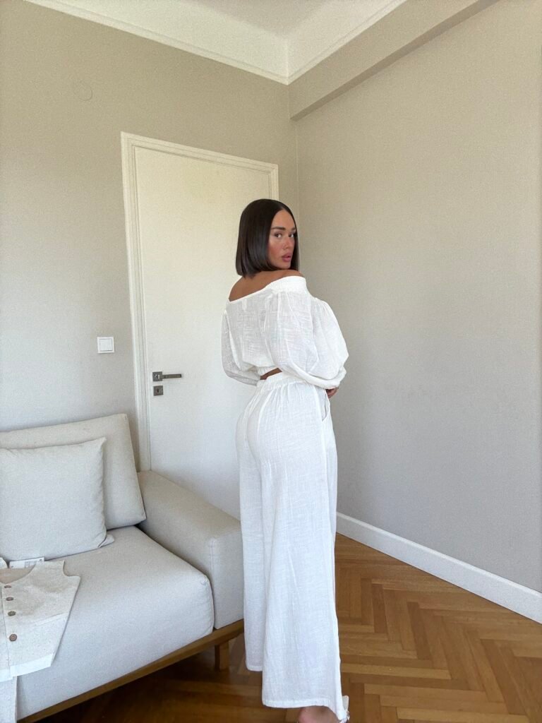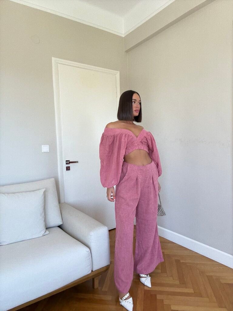 Pantallona të gjata me bel të lartë me punim pencash. Me llastik pas në bel. Përmbajnë xhepa funksionale. Crop top me mengë të shkurtra në punim llastiku. Në formë V ekspozon dekoltene.