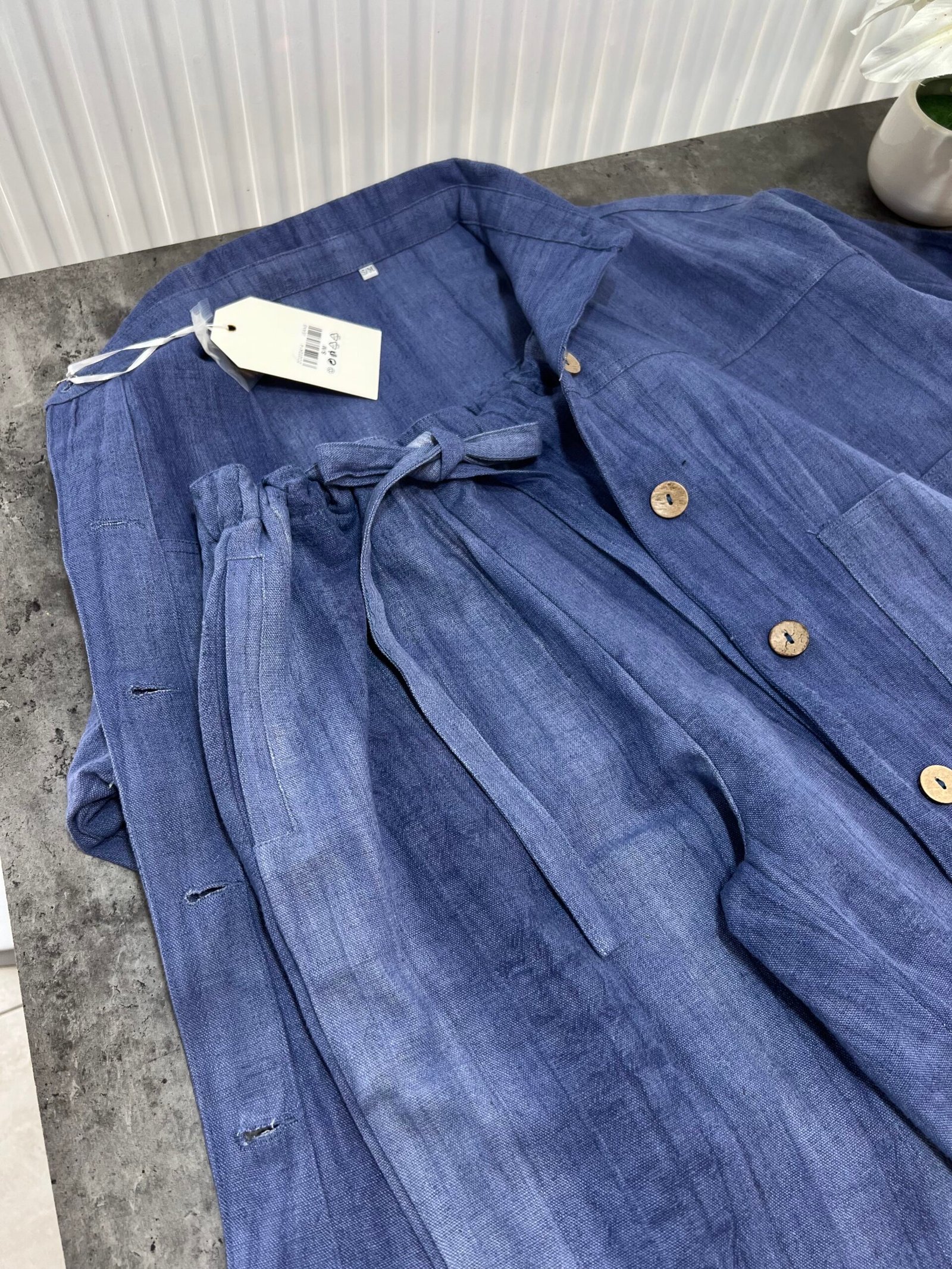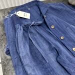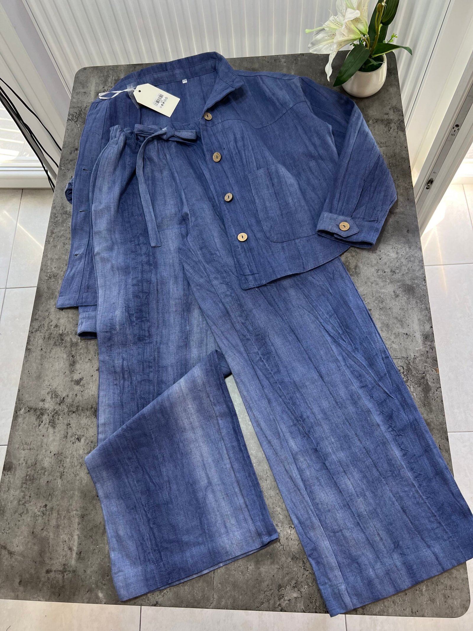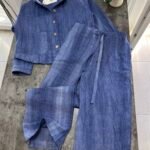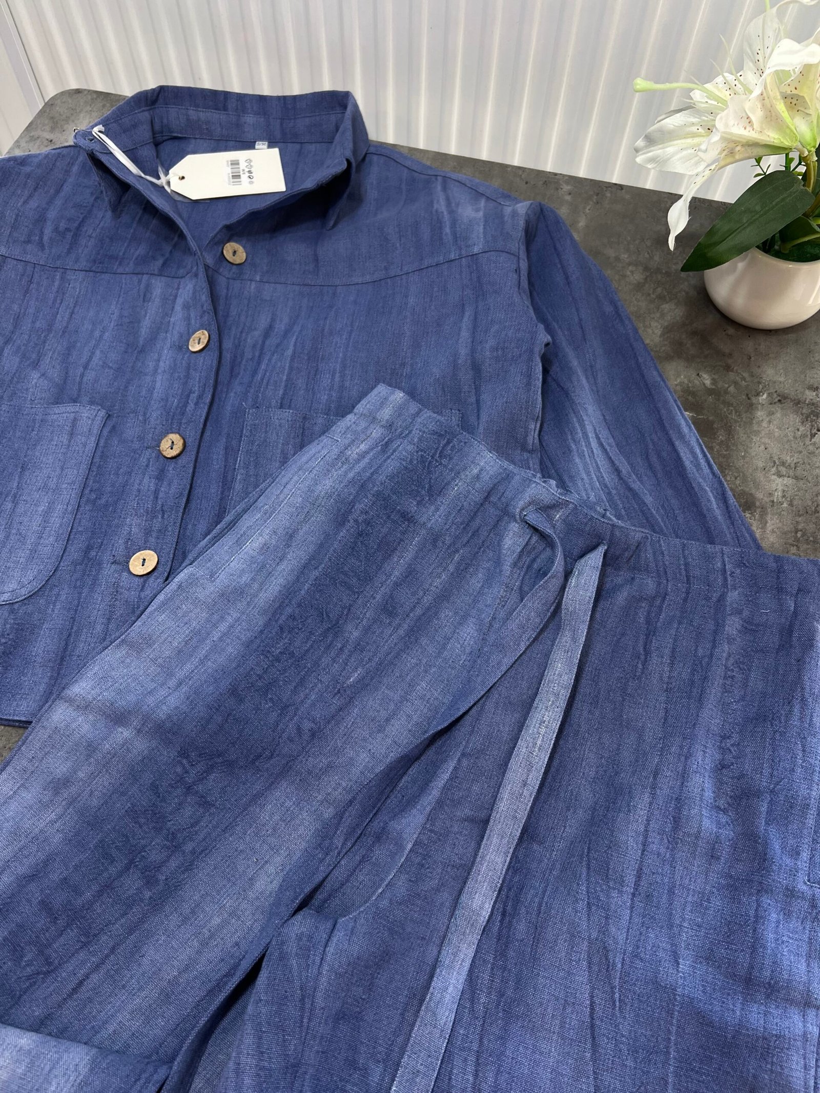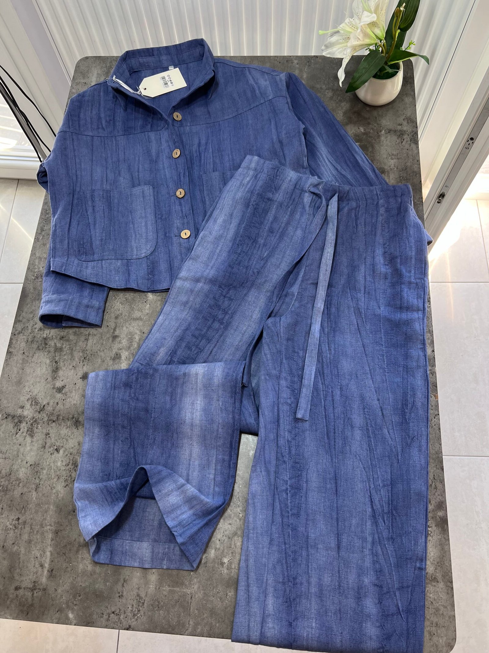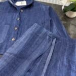 Në material të ndërthurur midis linosë dhe pambukut. Pantallona të gjata me bel të larte me llastik dhe lidhëse. Përmbajnë xhepa funksionale me prerje elegante. Kemishë e lirshme me mënge të gjata me mbërthim kopsash,në gjatësi normale.