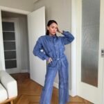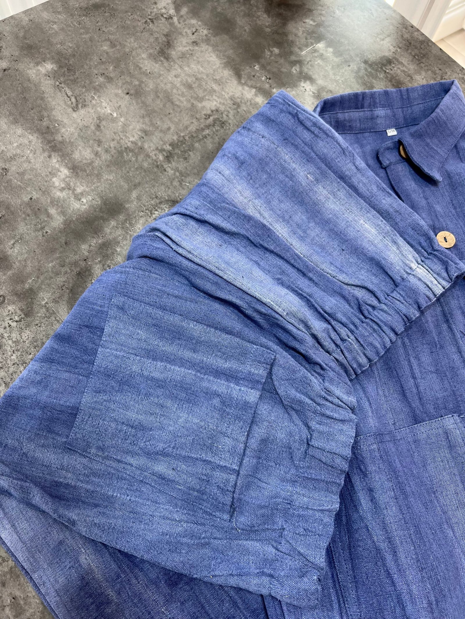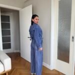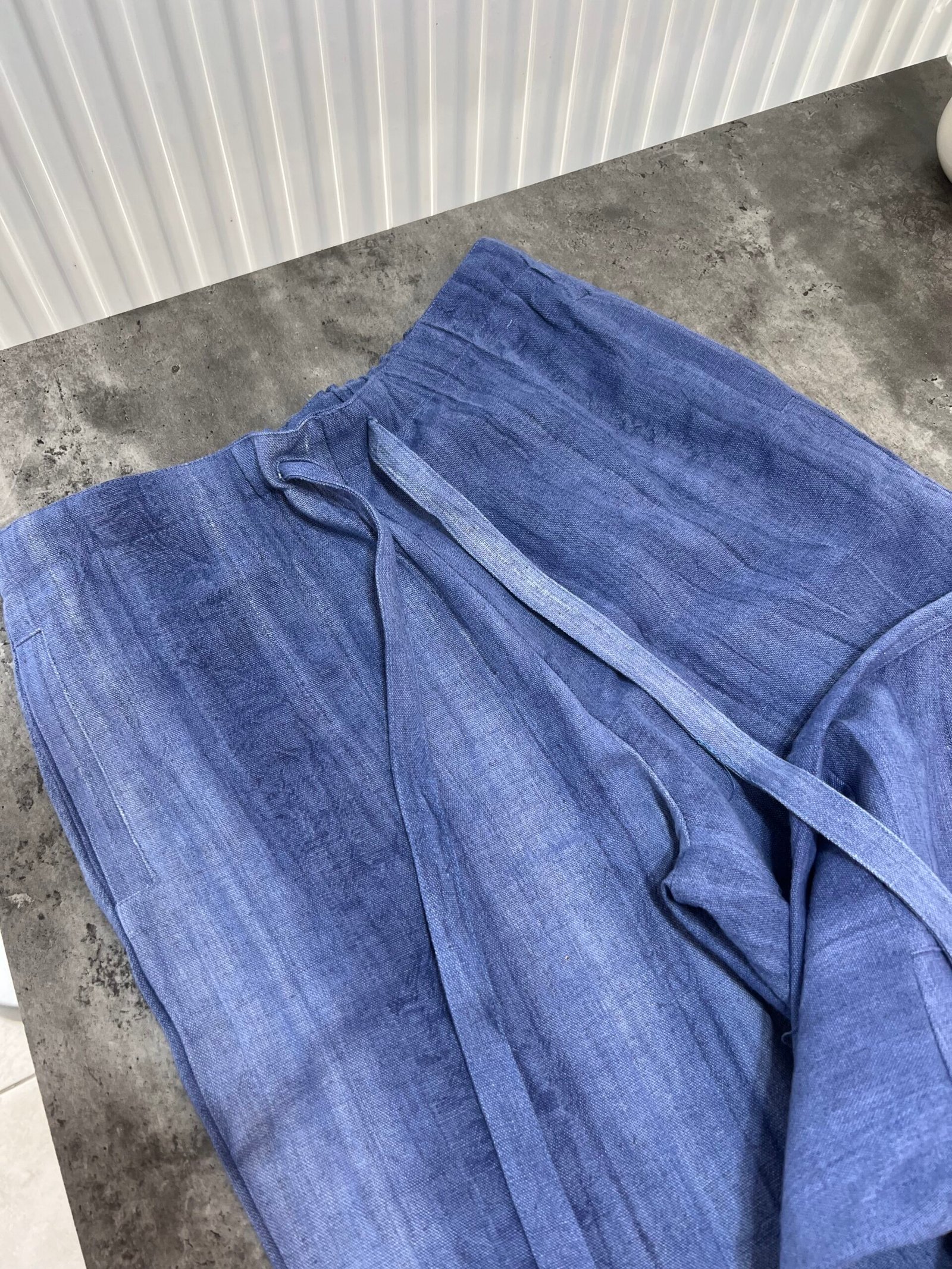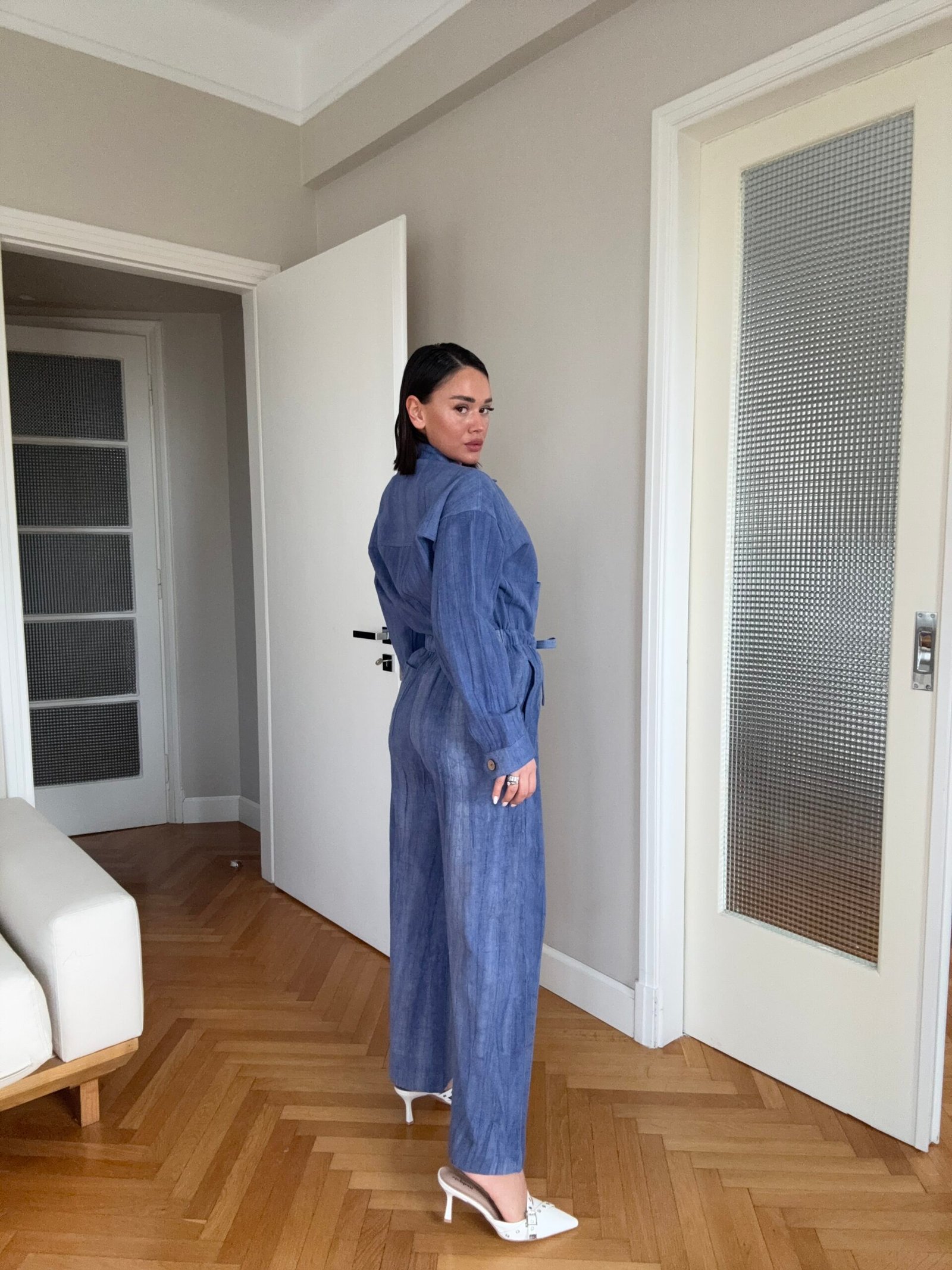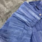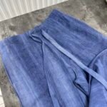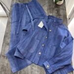 Në material të ndërthurur midis linosë dhe pambukut. Pantallona të gjata me bel të larte me llastik dhe lidhëse. Përmbajnë xhepa funksionale me prerje elegante. Kemishë e lirshme me mënge të gjata me mbërthim kopsash,në gjatësi normale.