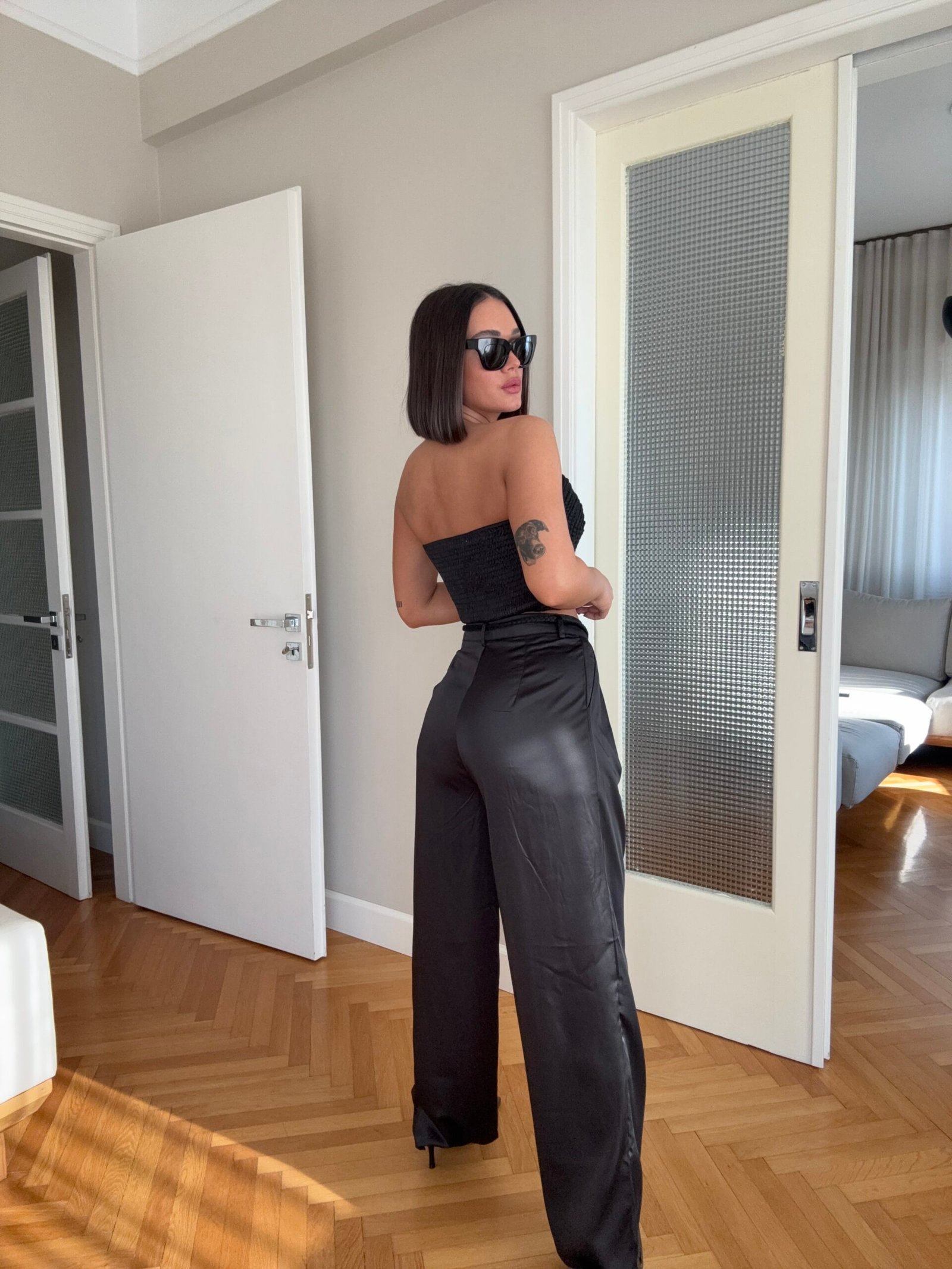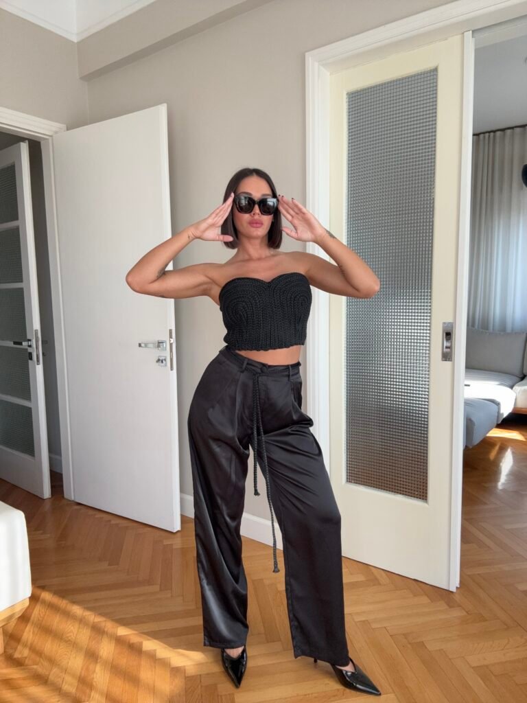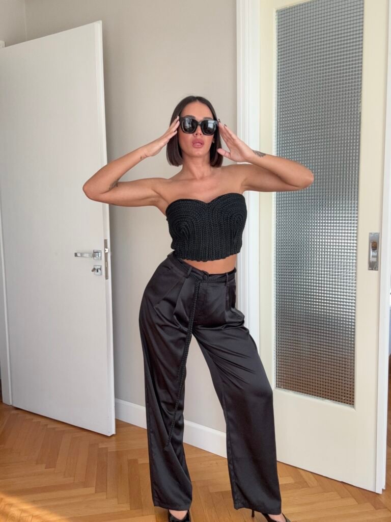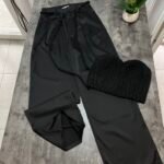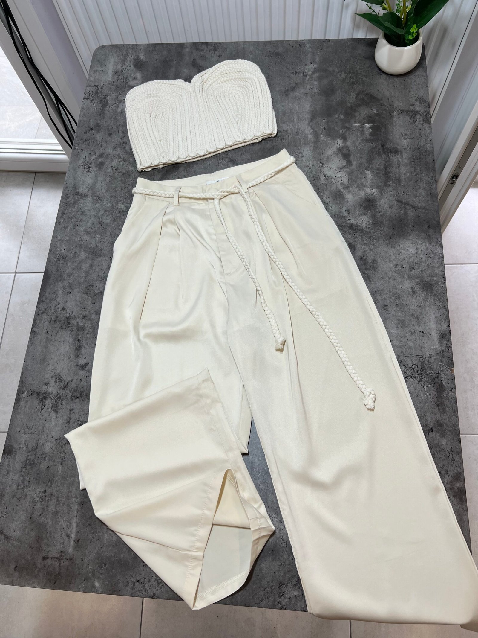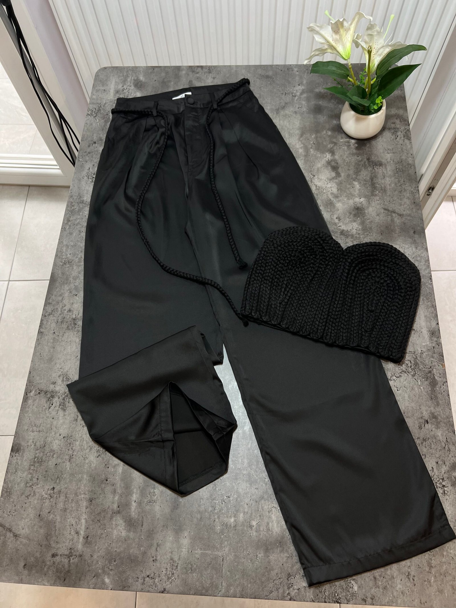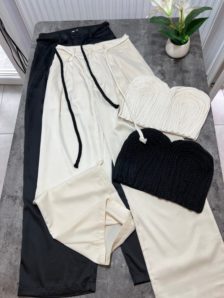 Set 2 pjesesh me pantallona saten dhe bust. Pantallona të gjata me bel te lartë. Në material të derdhur.Qepje me penca. Xhepa funksionale.