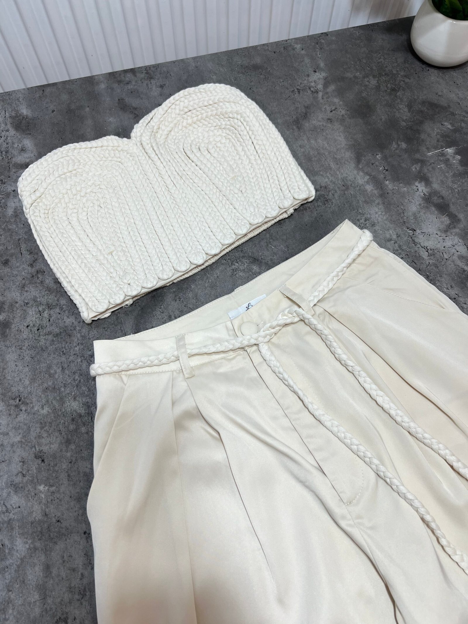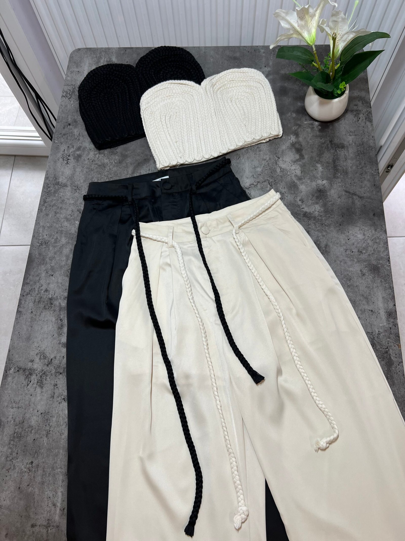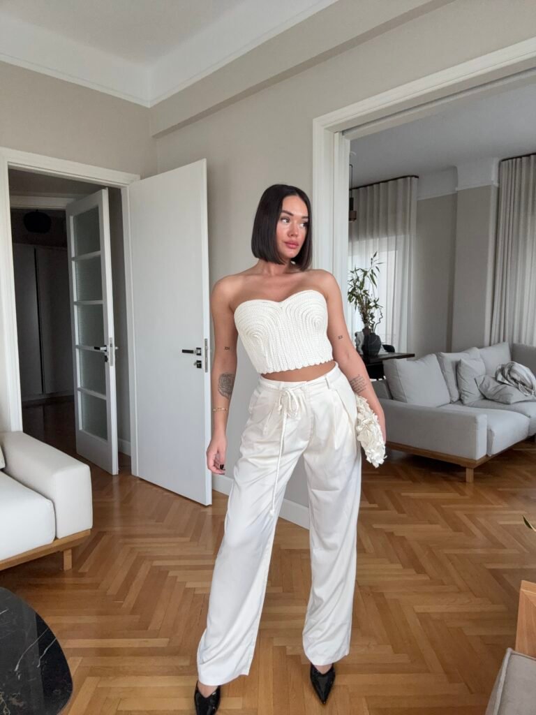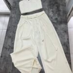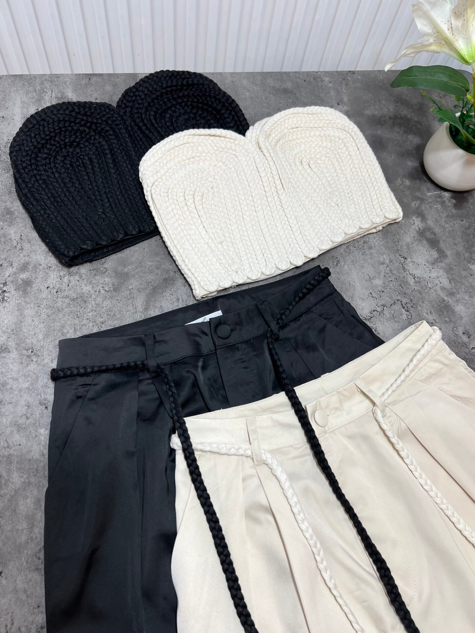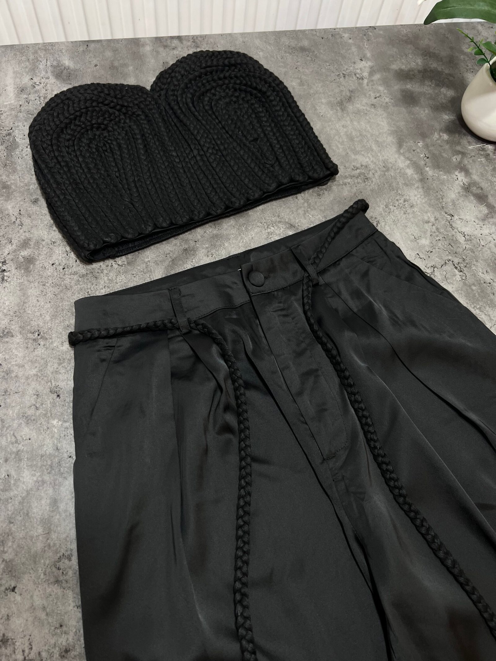 Set 2 pjesesh me pantallona saten dhe bust. Pantallona të gjata me bel te lartë. Në material të derdhur.Qepje me penca. Xhepa funksionale.