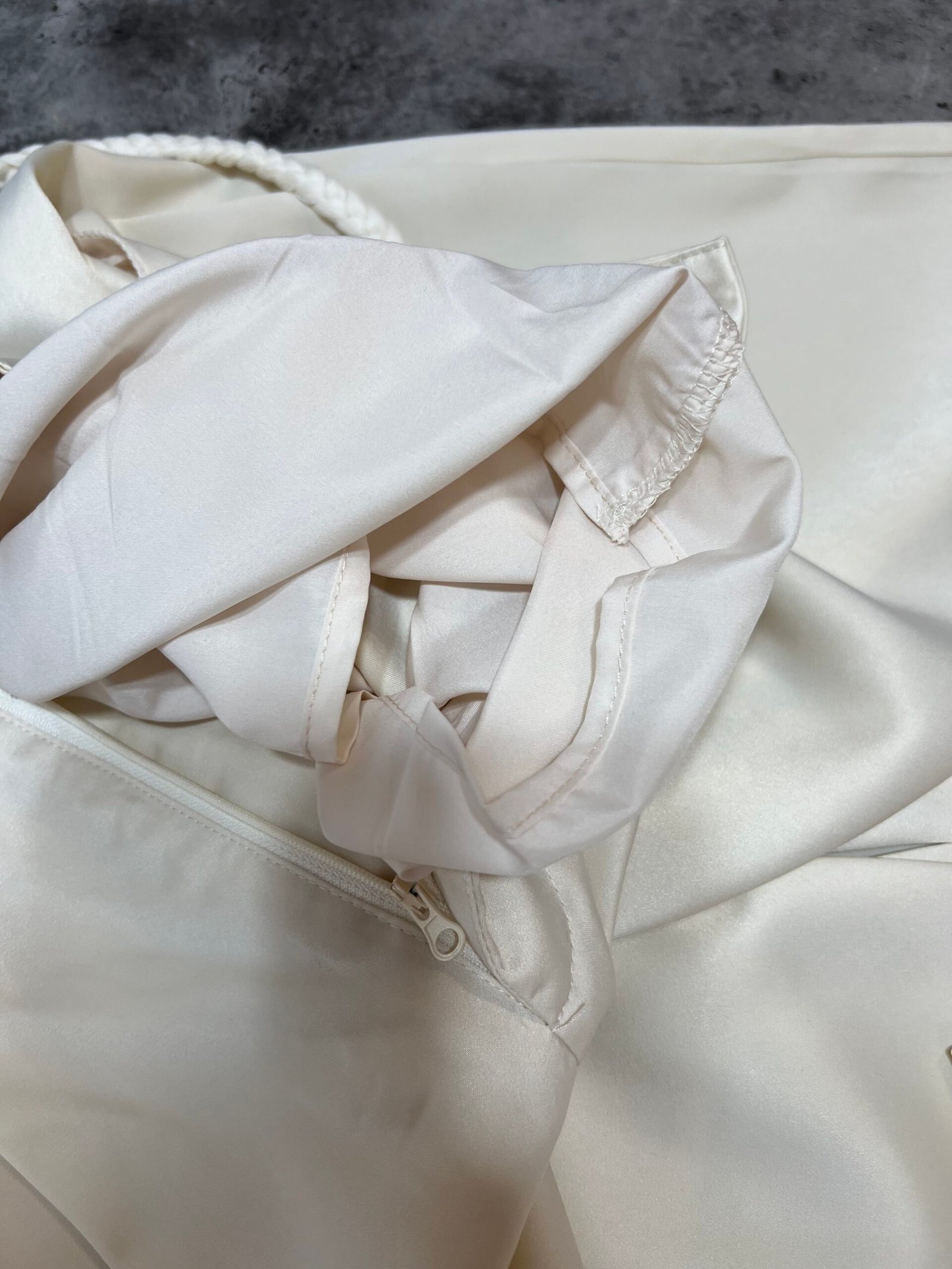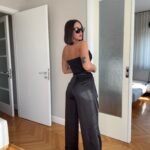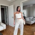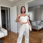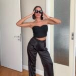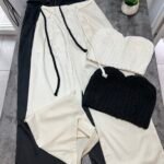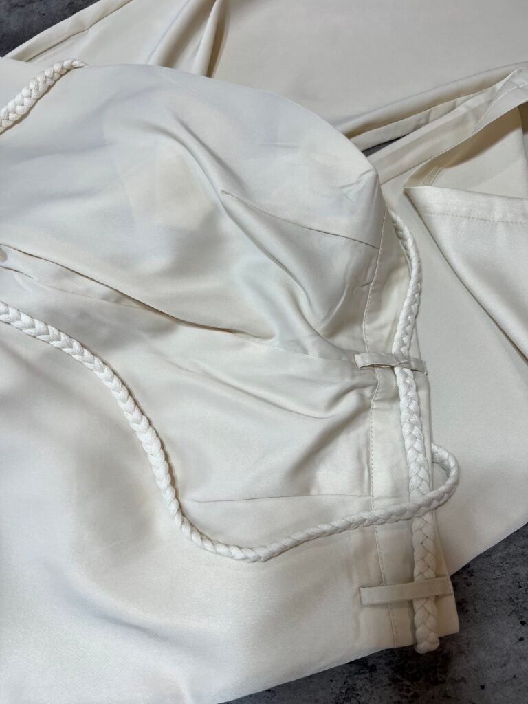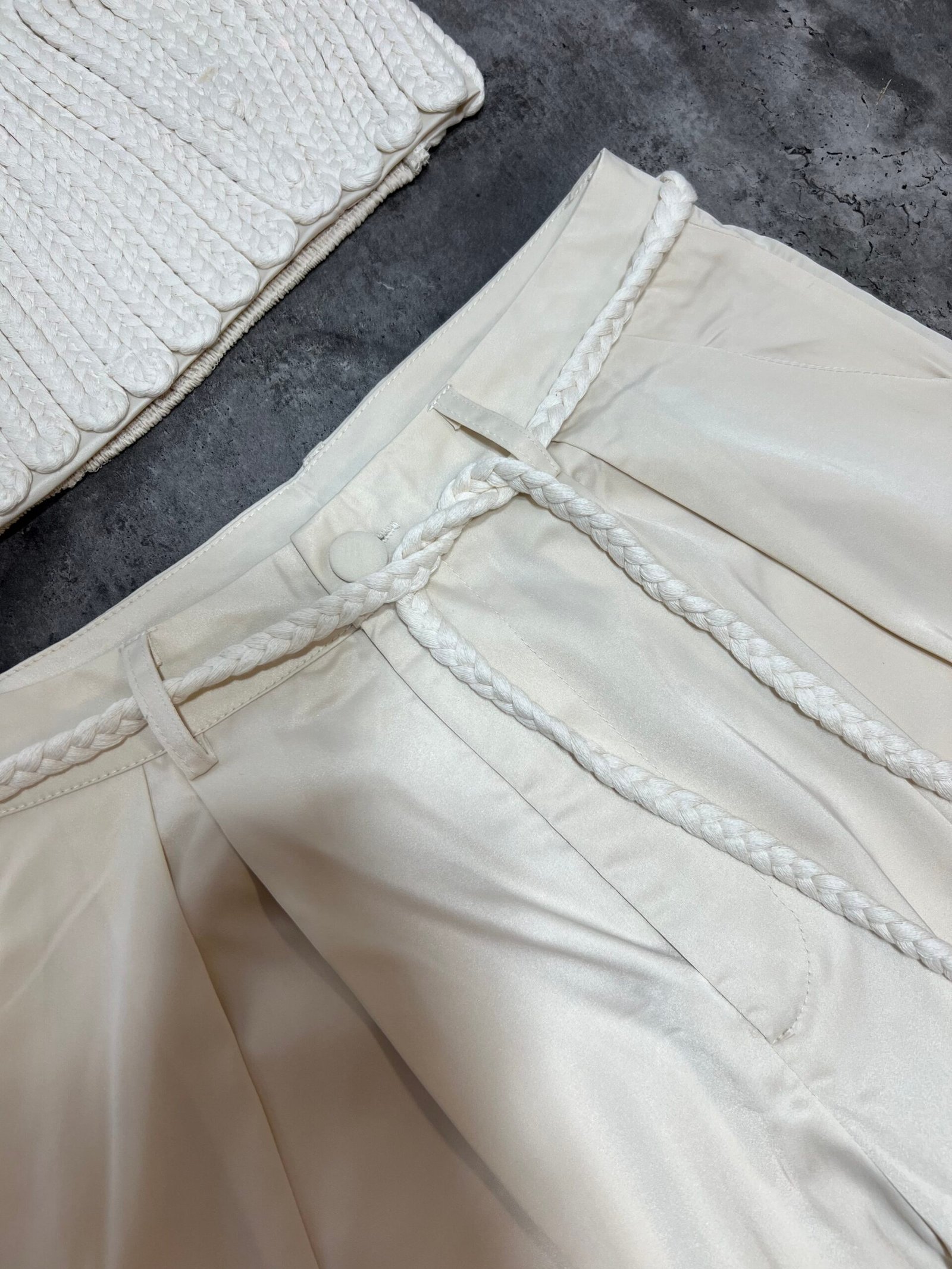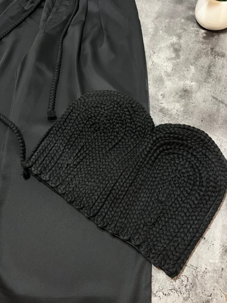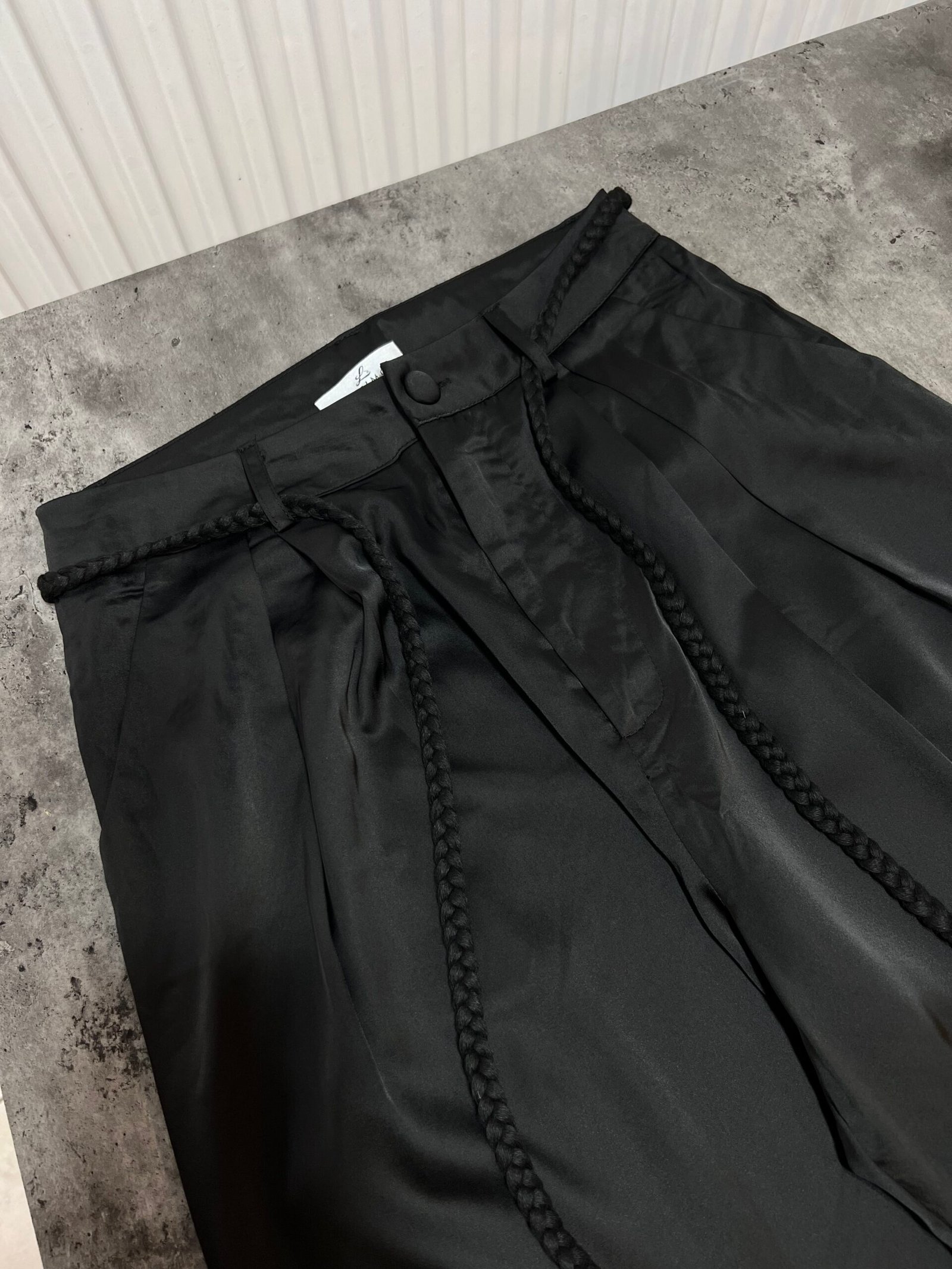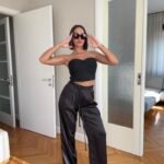 Set 2 pjesesh me pantallona saten dhe bust. Pantallona të gjata me bel te lartë. Në material të derdhur.Qepje me penca. Xhepa funksionale.