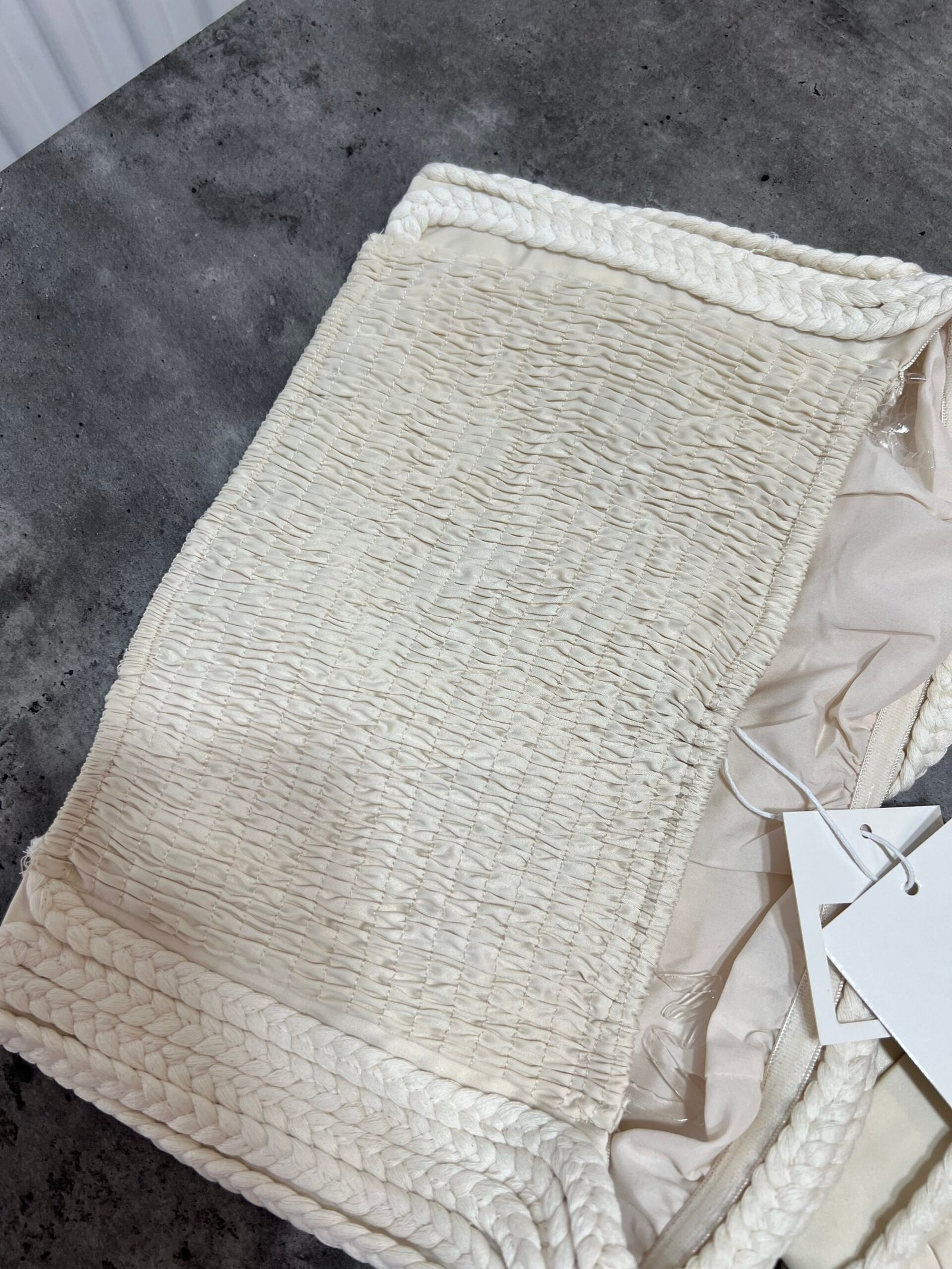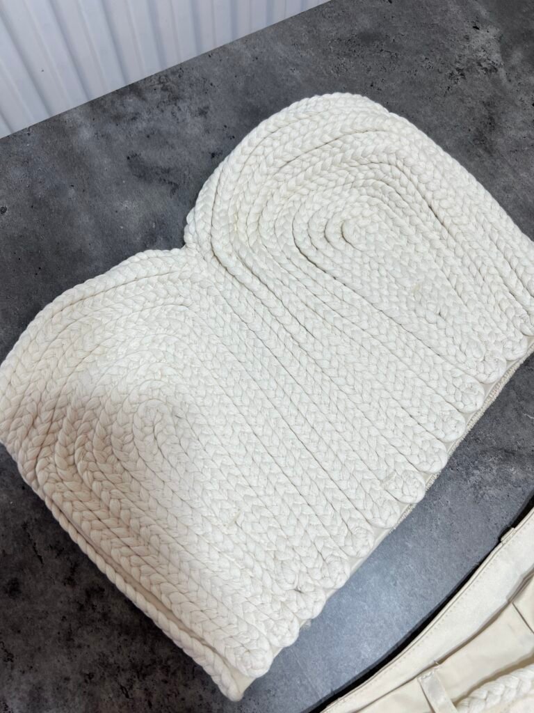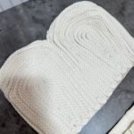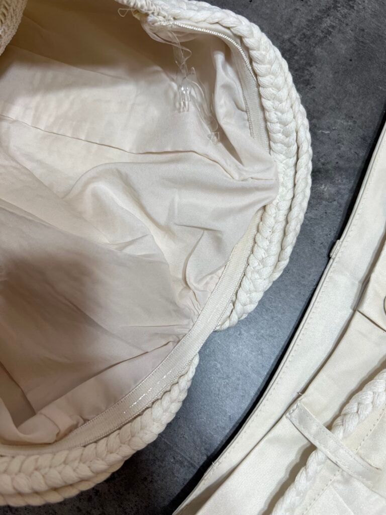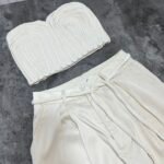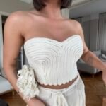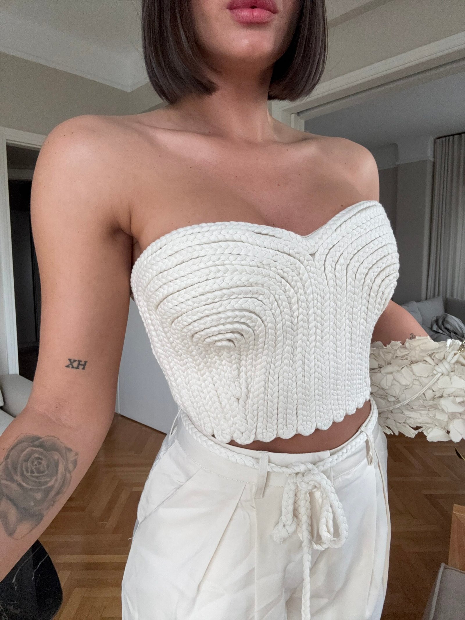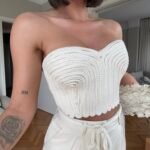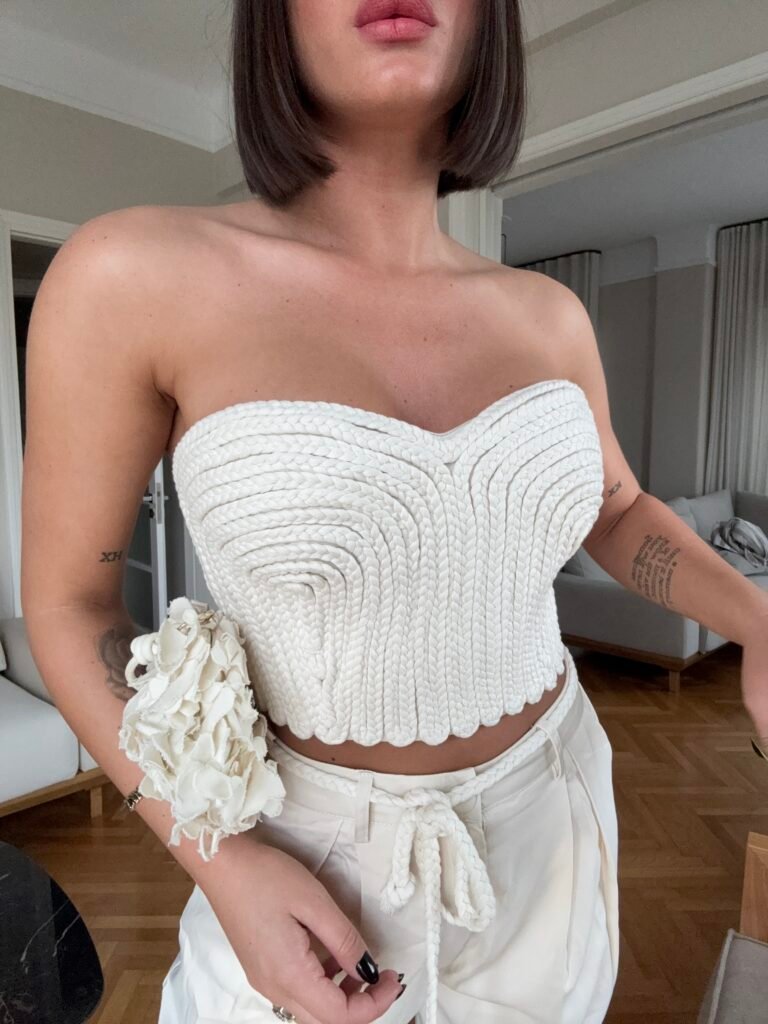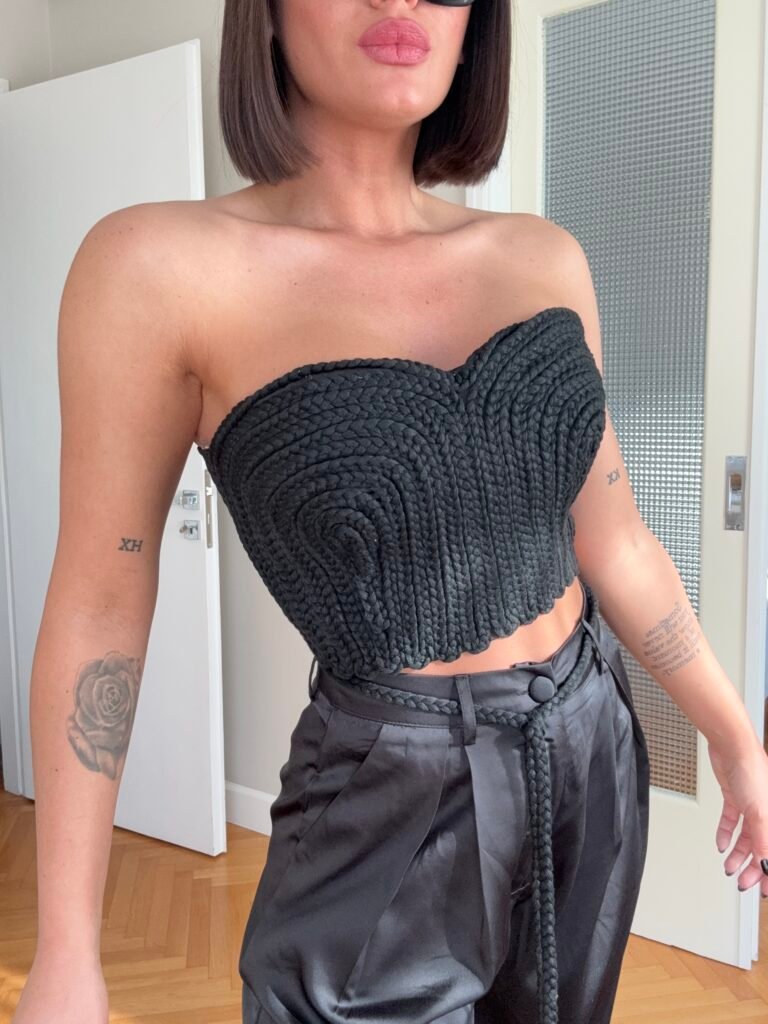Prerje paralel. Rrip i hollë në punim crochet i përfshirë. Bust crop top në punim crochet, material elastik. Me astar brënda. Me punim llastiku pas.