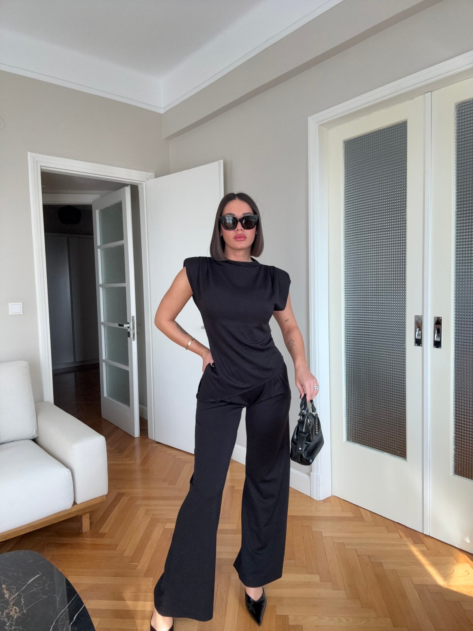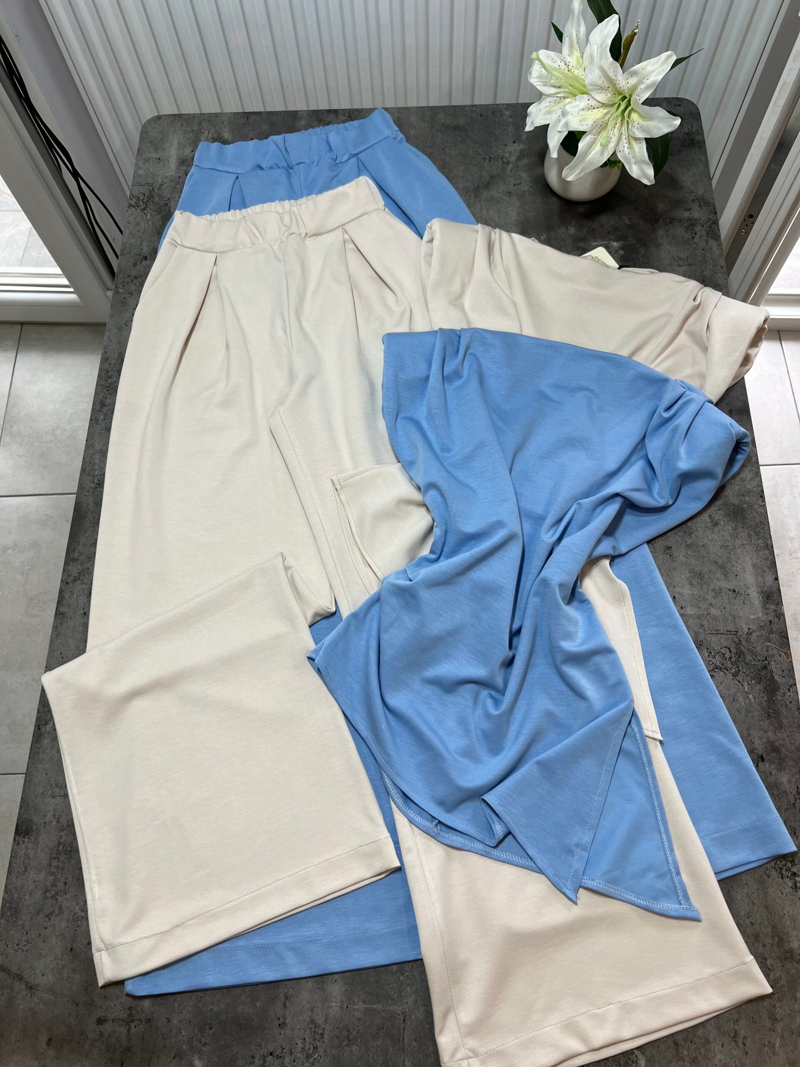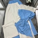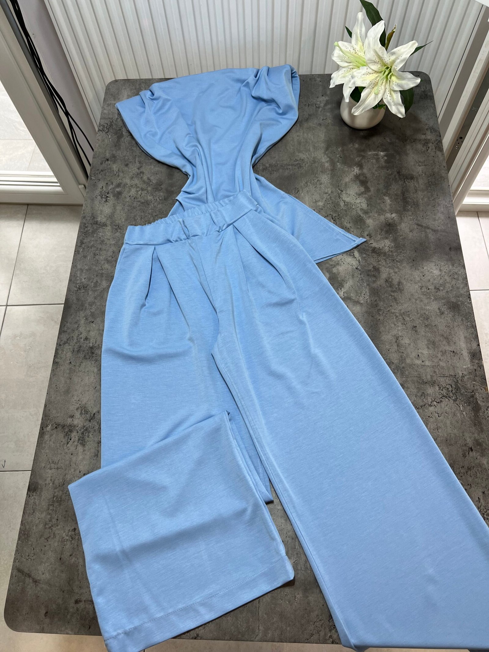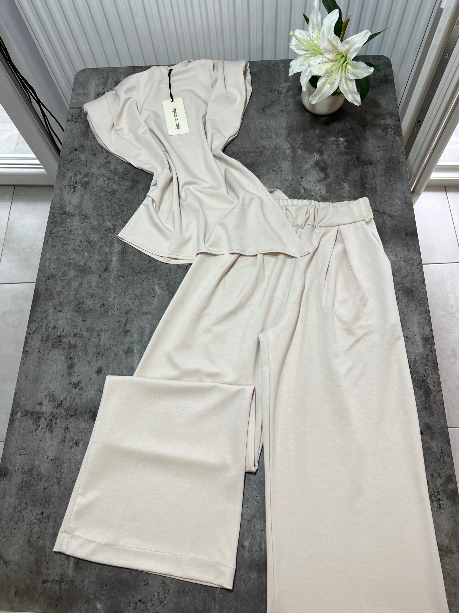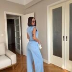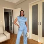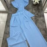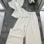 Pantallona të gjata me bel të lartë në prerje paralel. Me llastik në bel në pjesën pas. Përmbajnë xhepa funksionale. Bluze pa krahë me sfungjer në pjesën e supeve. Me mbërthim zinxhiri pas. Gjatësi asimetrike fundore.
