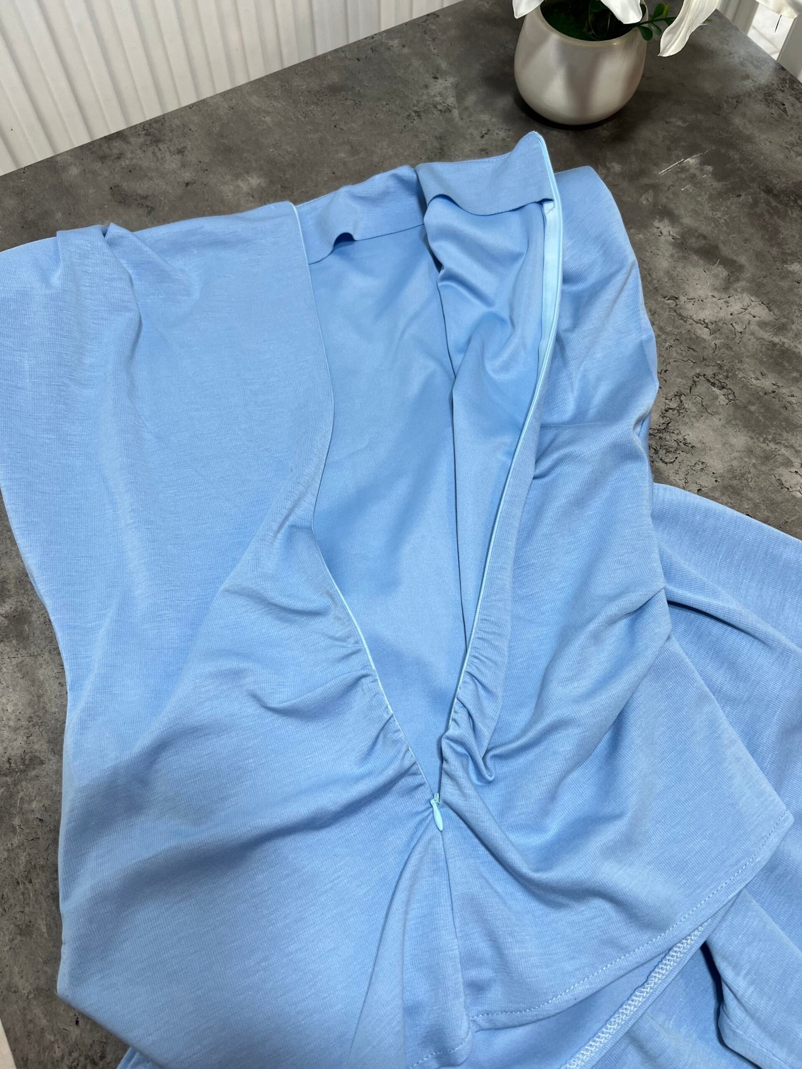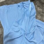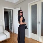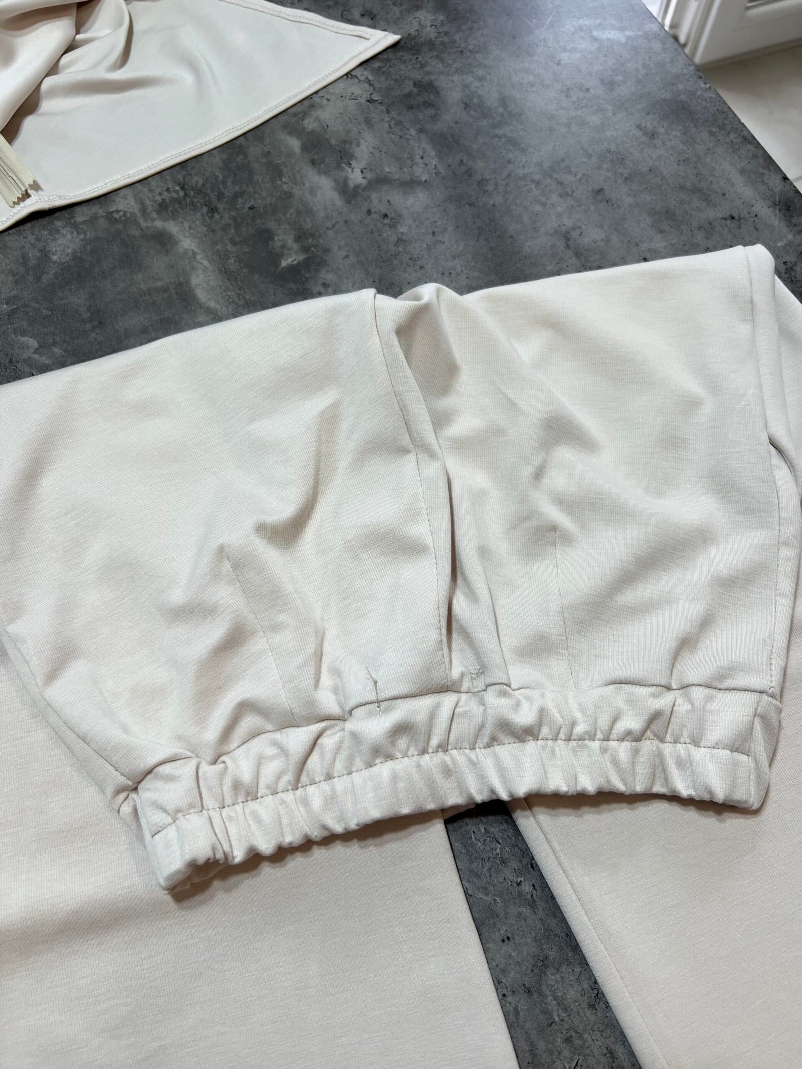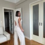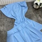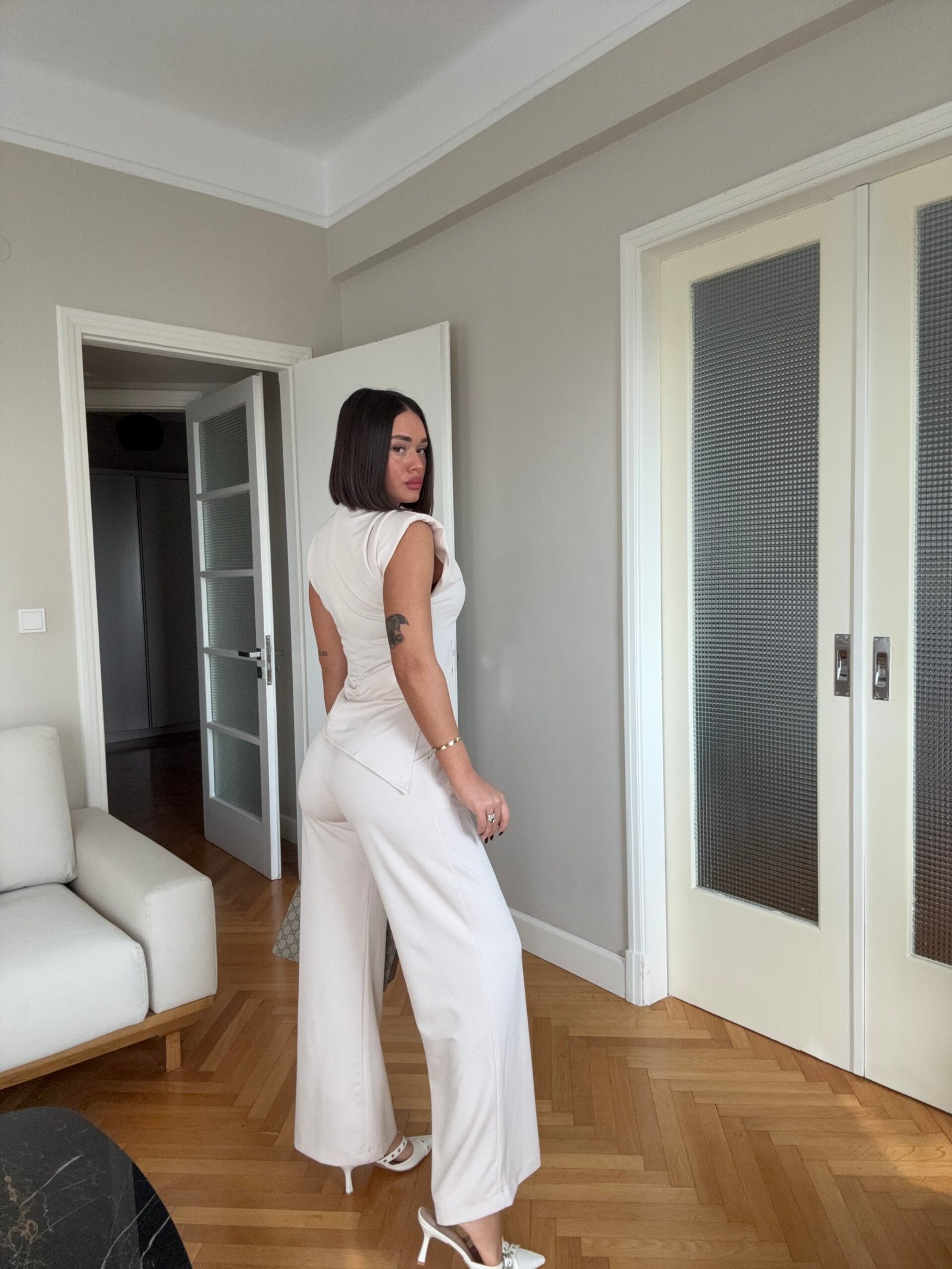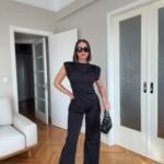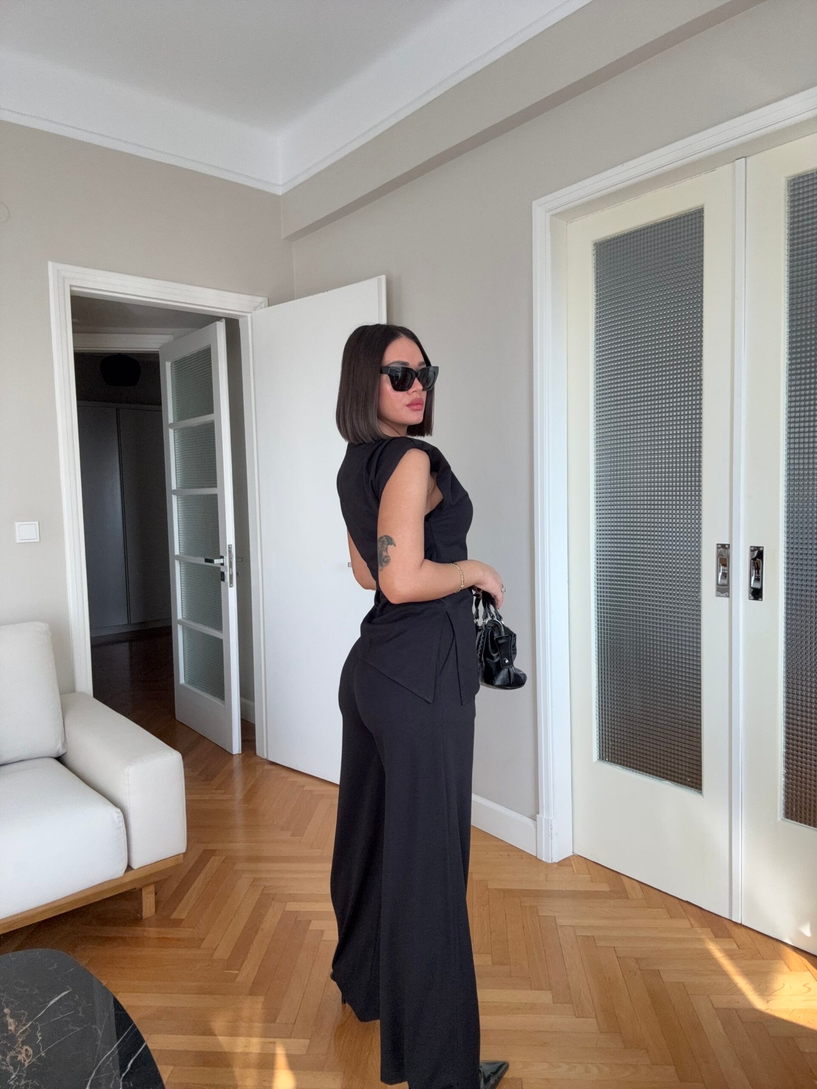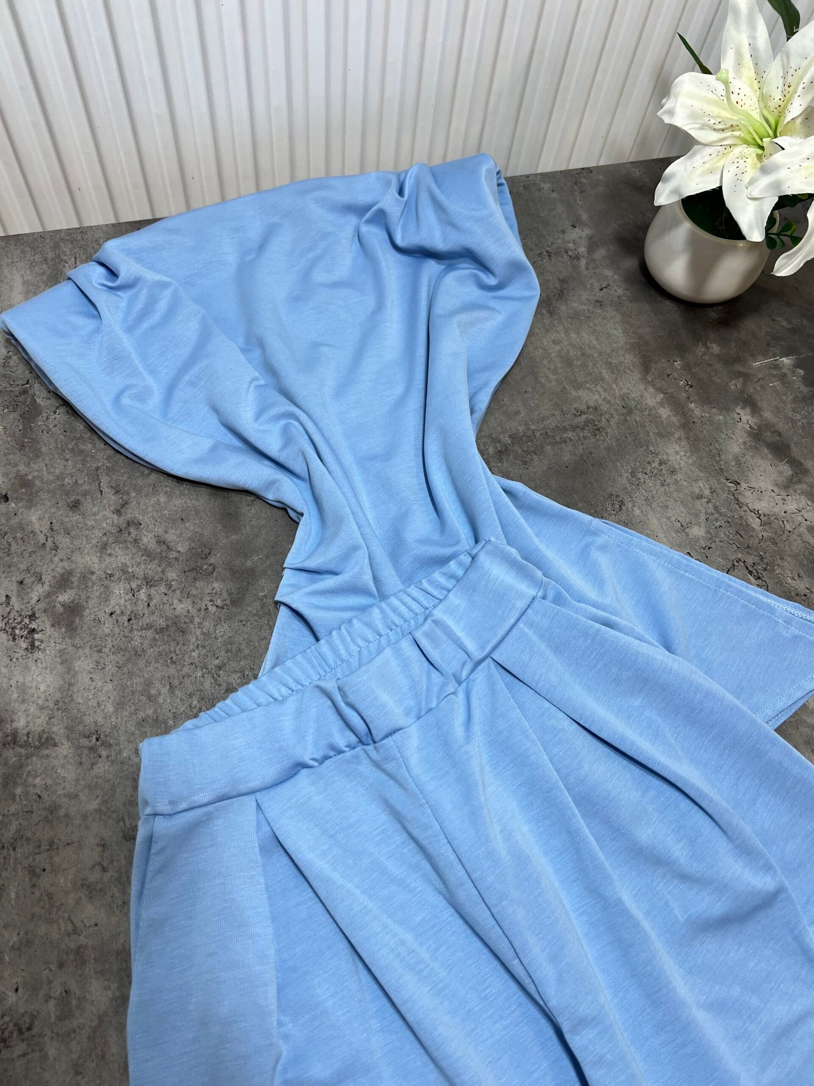 Pantallona të gjata me bel të lartë në prerje paralel. Me llastik në bel në pjesën pas. Përmbajnë xhepa funksionale. Bluze pa krahë me sfungjer në pjesën e supeve. Me mbërthim zinxhiri pas. Gjatësi asimetrike fundore.