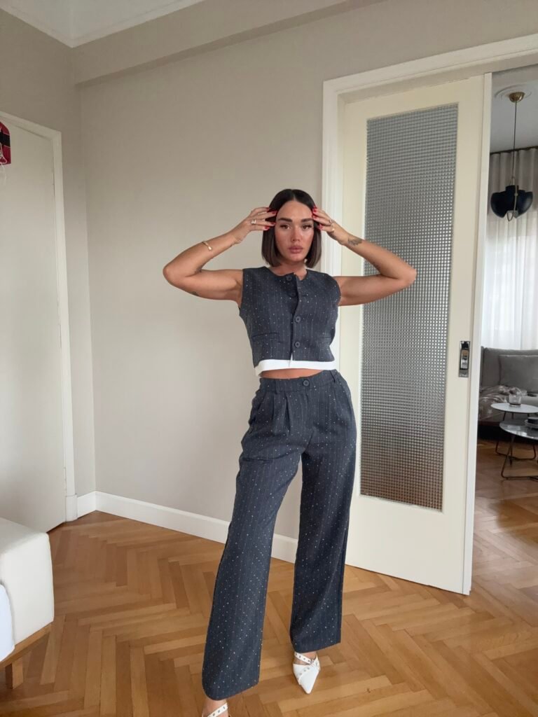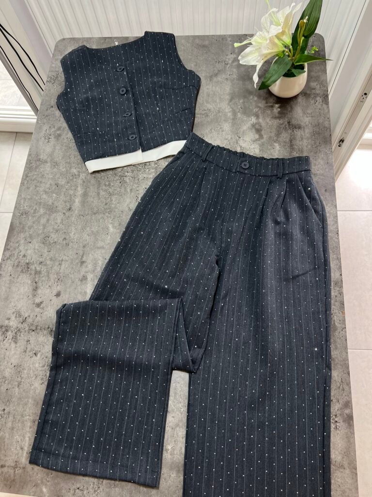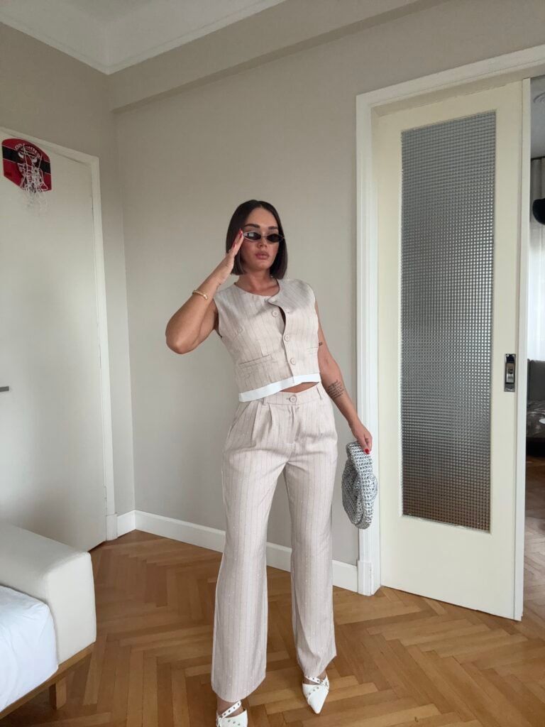 Pantallona me bel të lartë, me llastik pas në bel. Prerje e drejtë. Jelek i shkurtër me astar brënda, me mbërthim kopsash. Me ndërthurje të copës së pambukut në pjesën fundore.