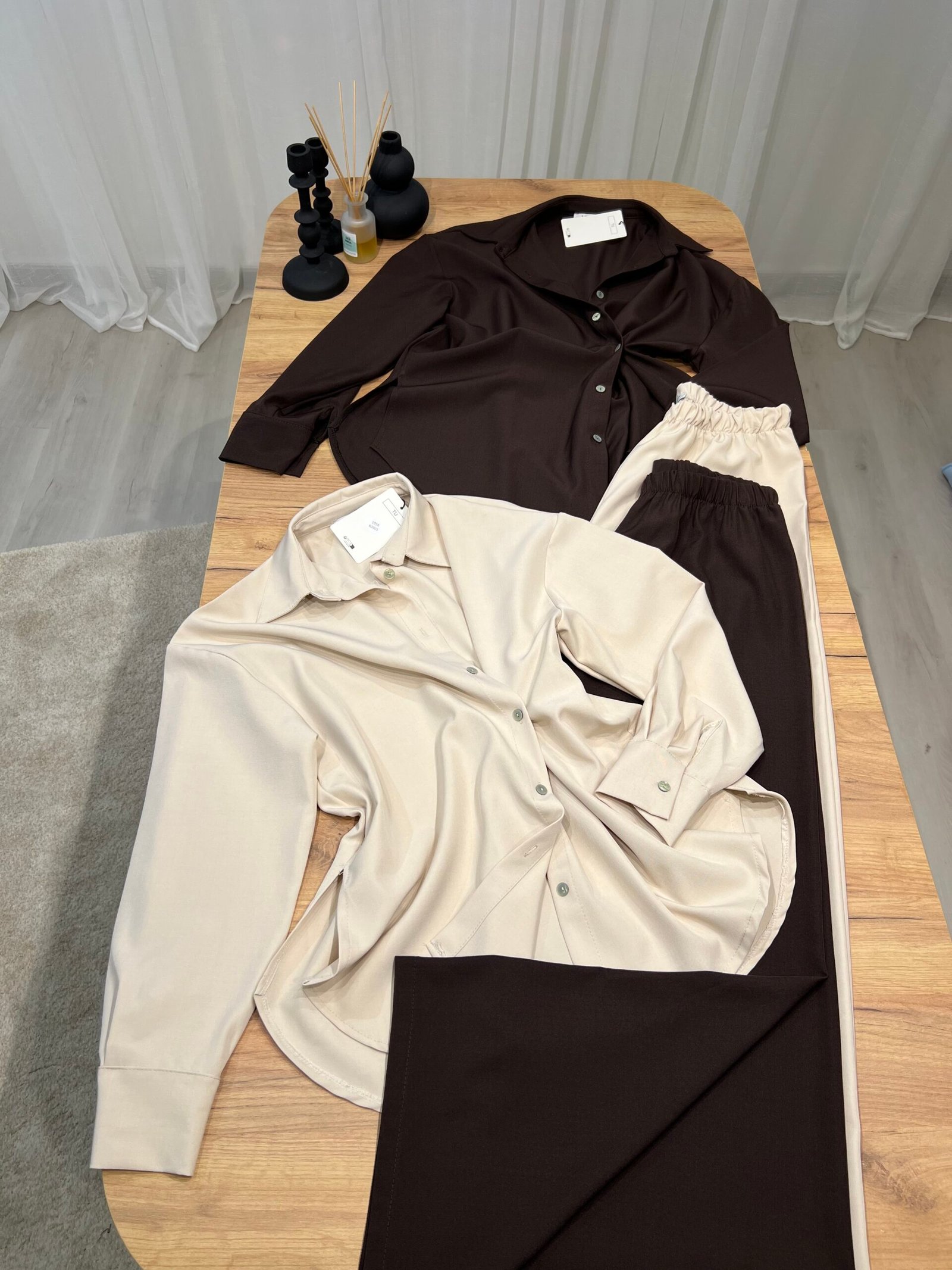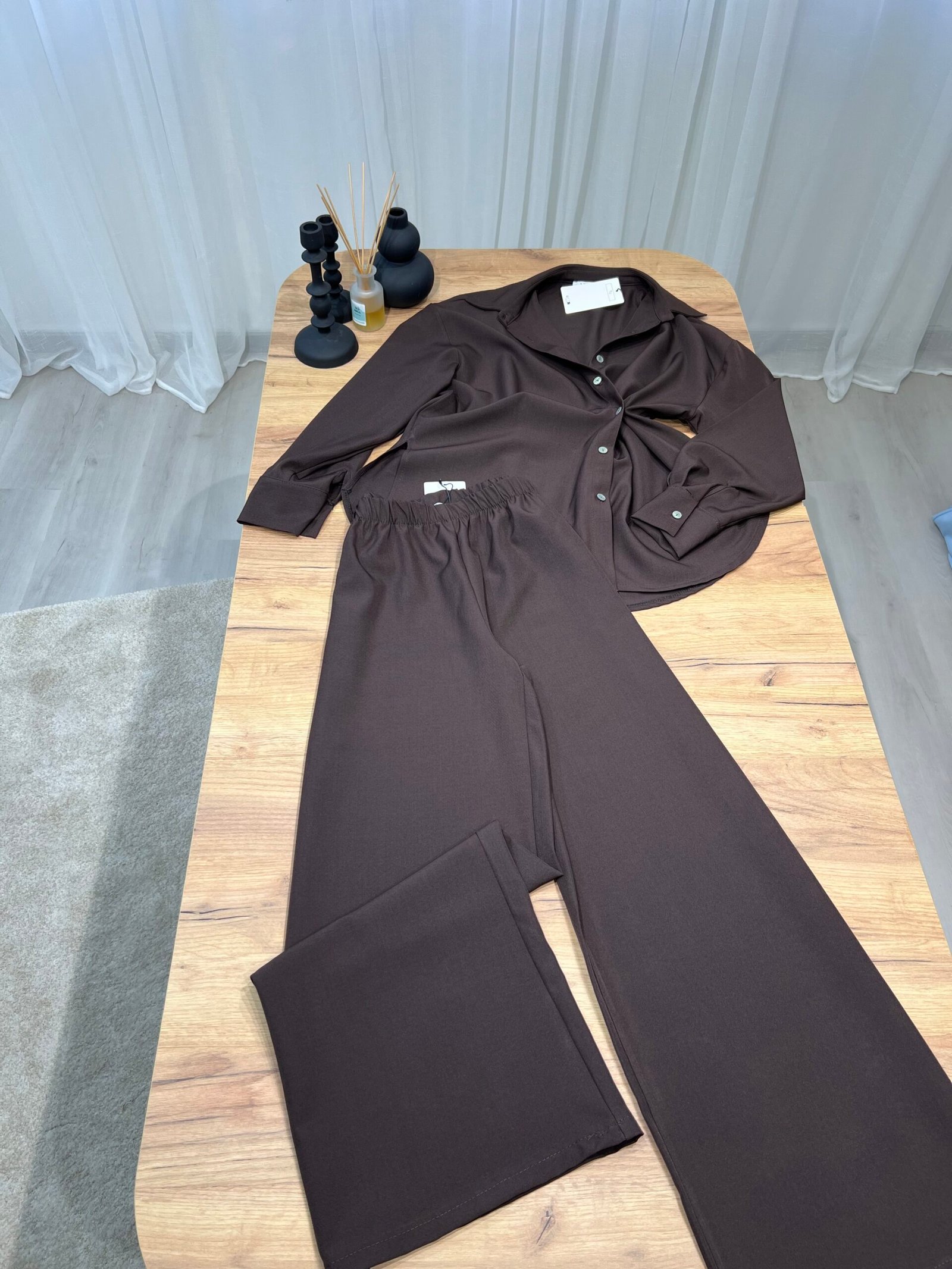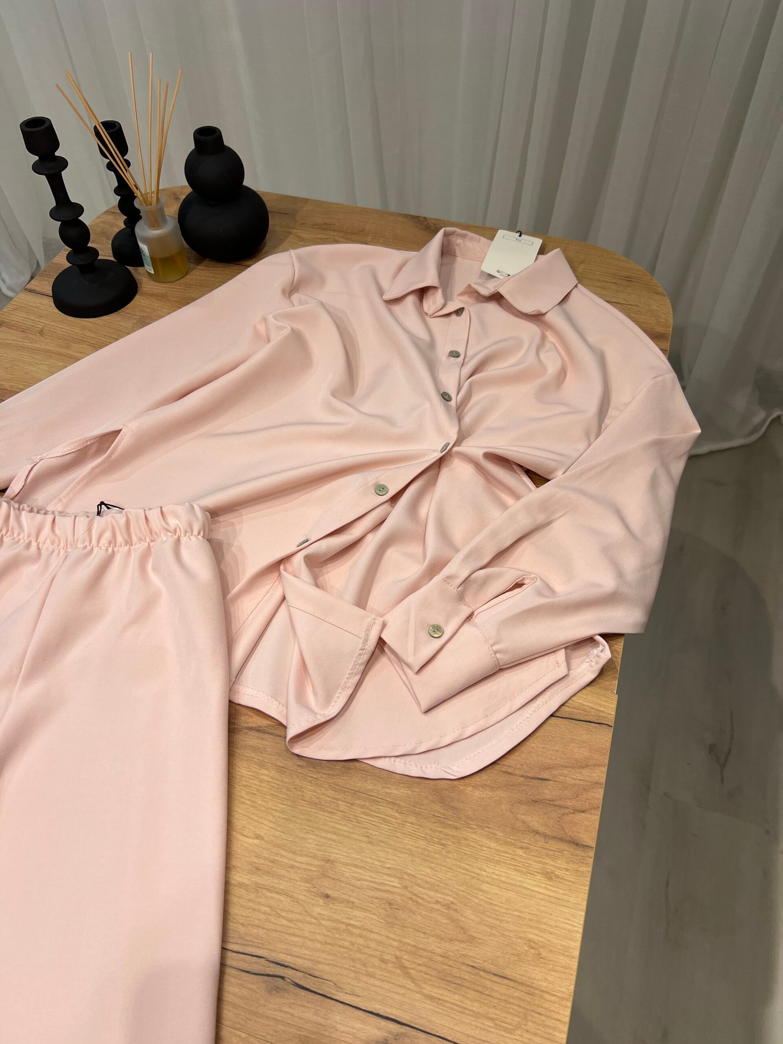 Set elegant me këmishë oversize me kopsa dhe pantallona wide-leg me bel elastik. Material i butë, me rënie fluide që jep pamje minimaliste dhe classy. Ideal për look office-chic, dalje casual elegante apo kombinime smart minimal.
