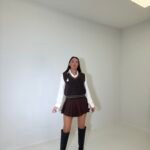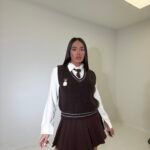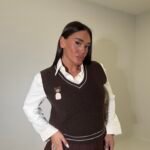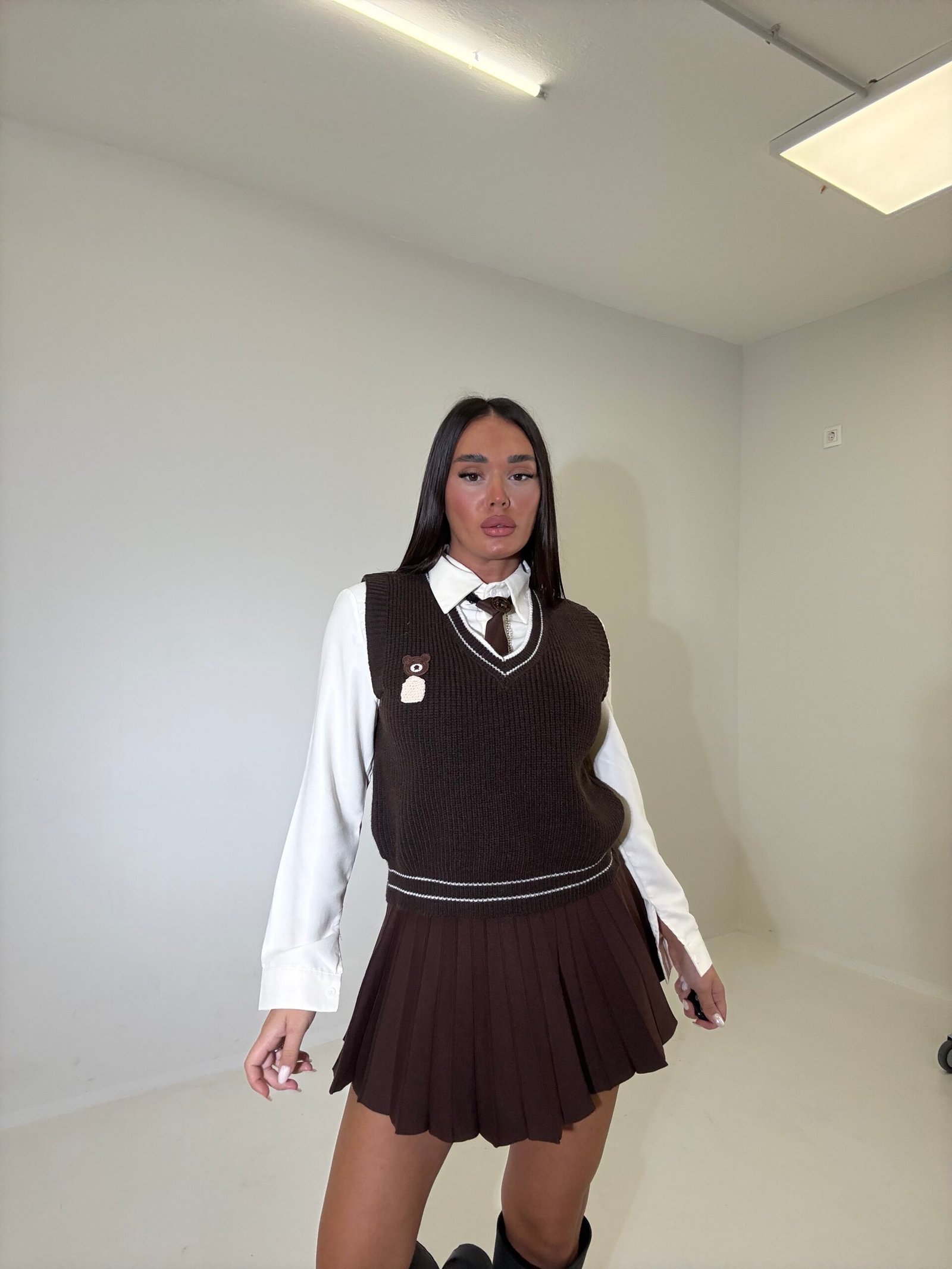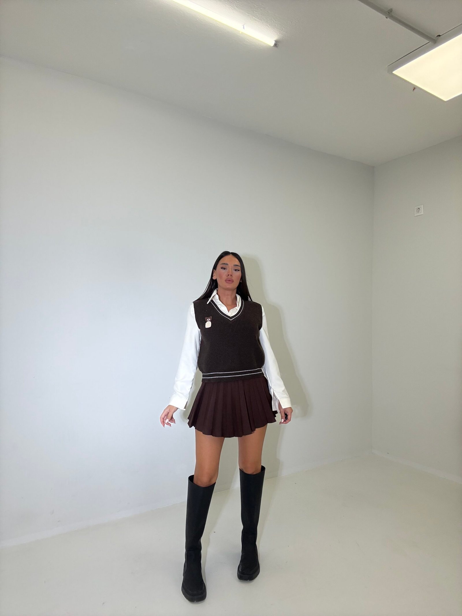 Set modern që përfshin këmishë , jelek triko në ngjyrë çokollatë me detaj vija kontrasti dhe kollare të koordinuar. Një pamje e sofistikuar dhe trendi “college style”, perfekte për ditët kur dëshiron të dukesh elegante, por me një prekje rinore.