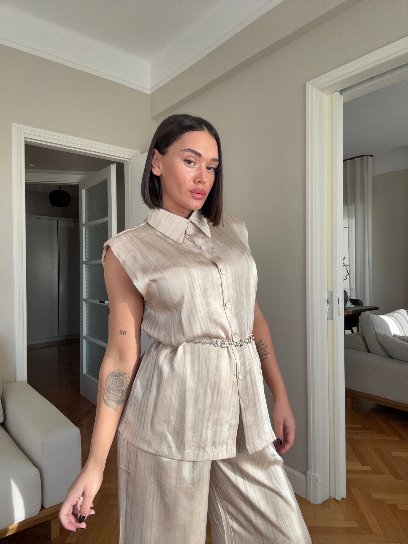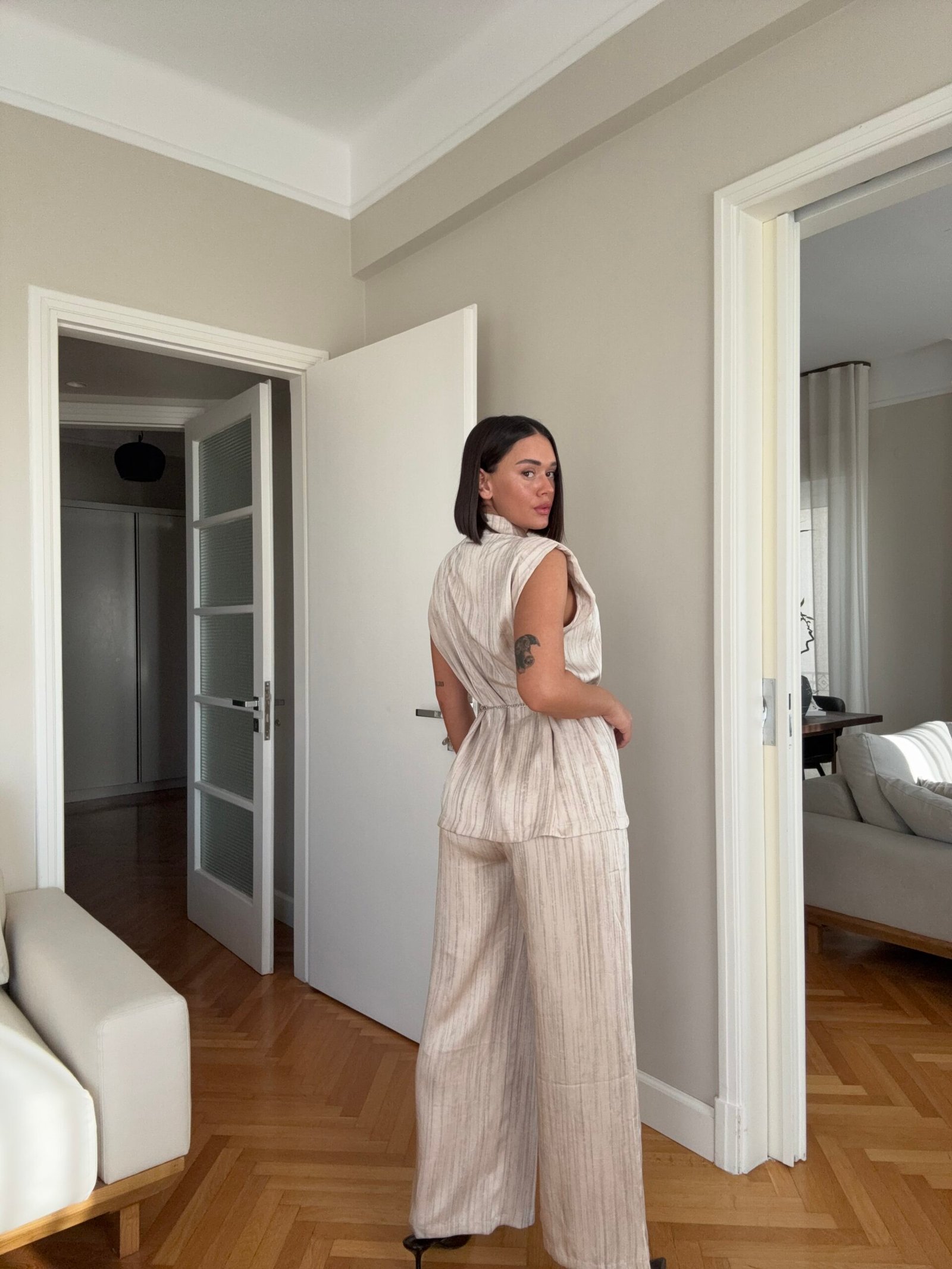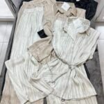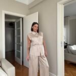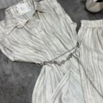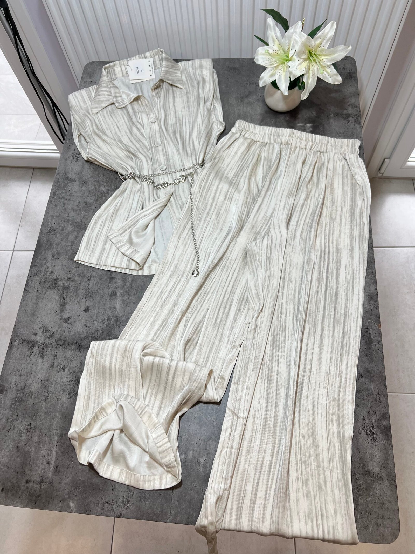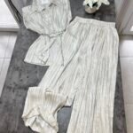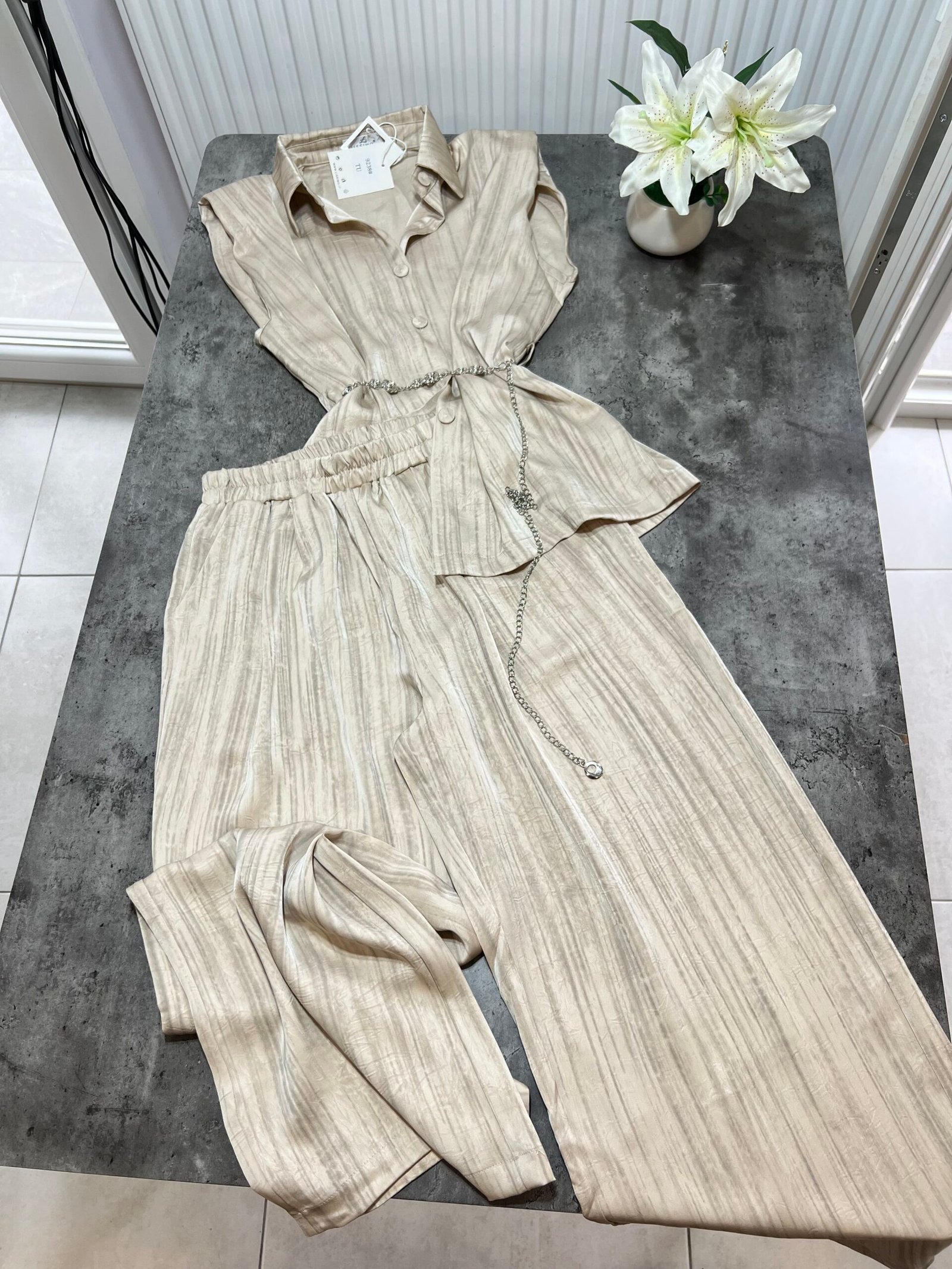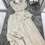 Pantallona të gjata të lirshme në prerje paralel. Me xhepa funksionale dhe llastik në bel. Këmishe pa krahe, në gjatësi poshtë vitheve.