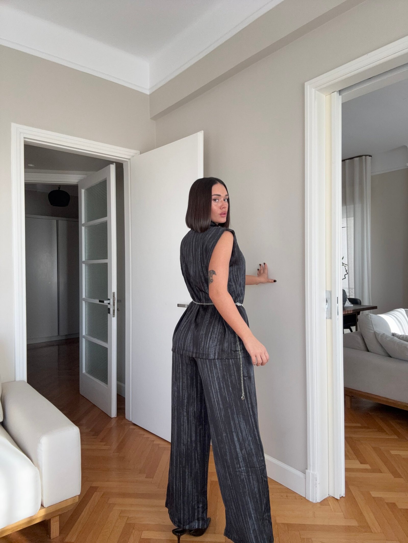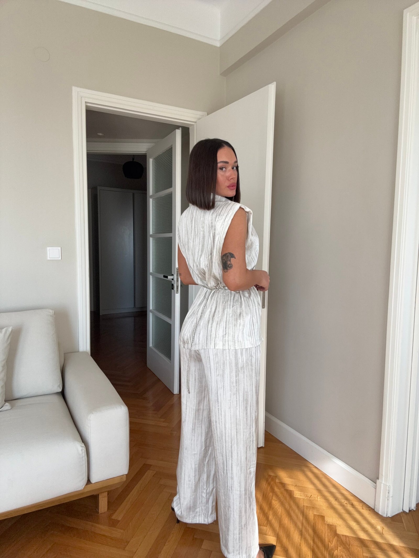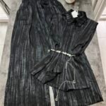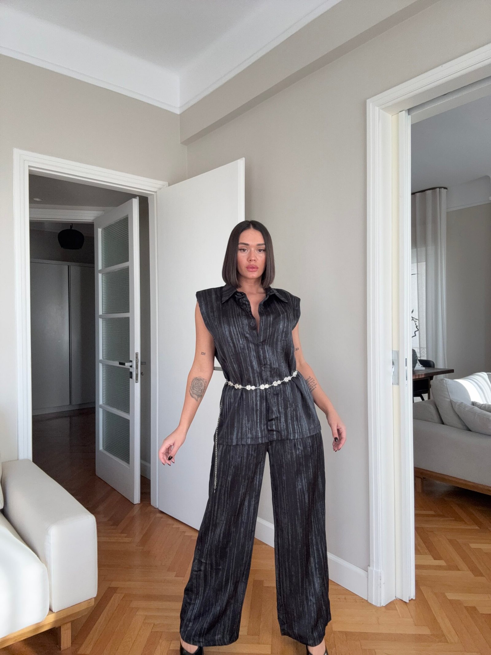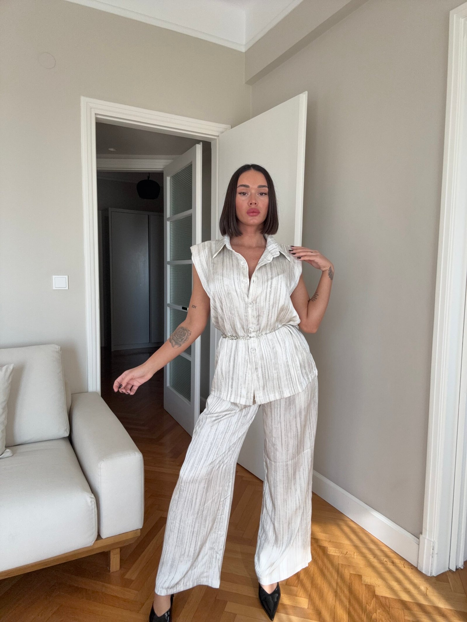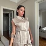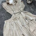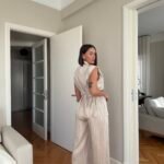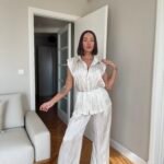 Pantallona të gjata të lirshme në prerje paralel. Me xhepa funksionale dhe llastik në bel. Këmishe pa krahe, në gjatësi poshtë vitheve.