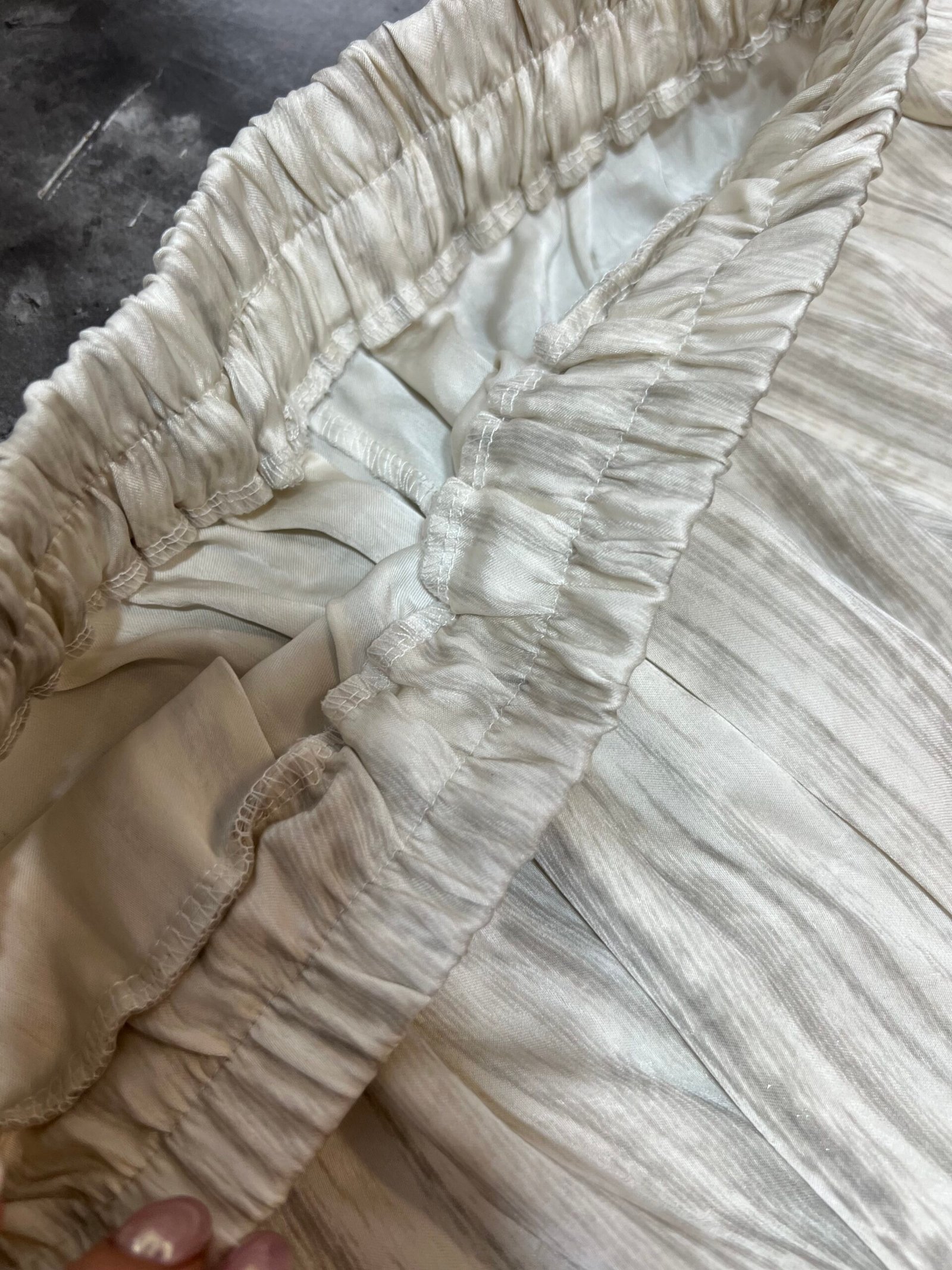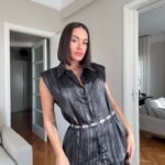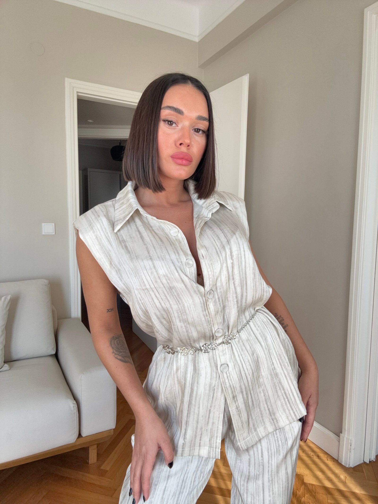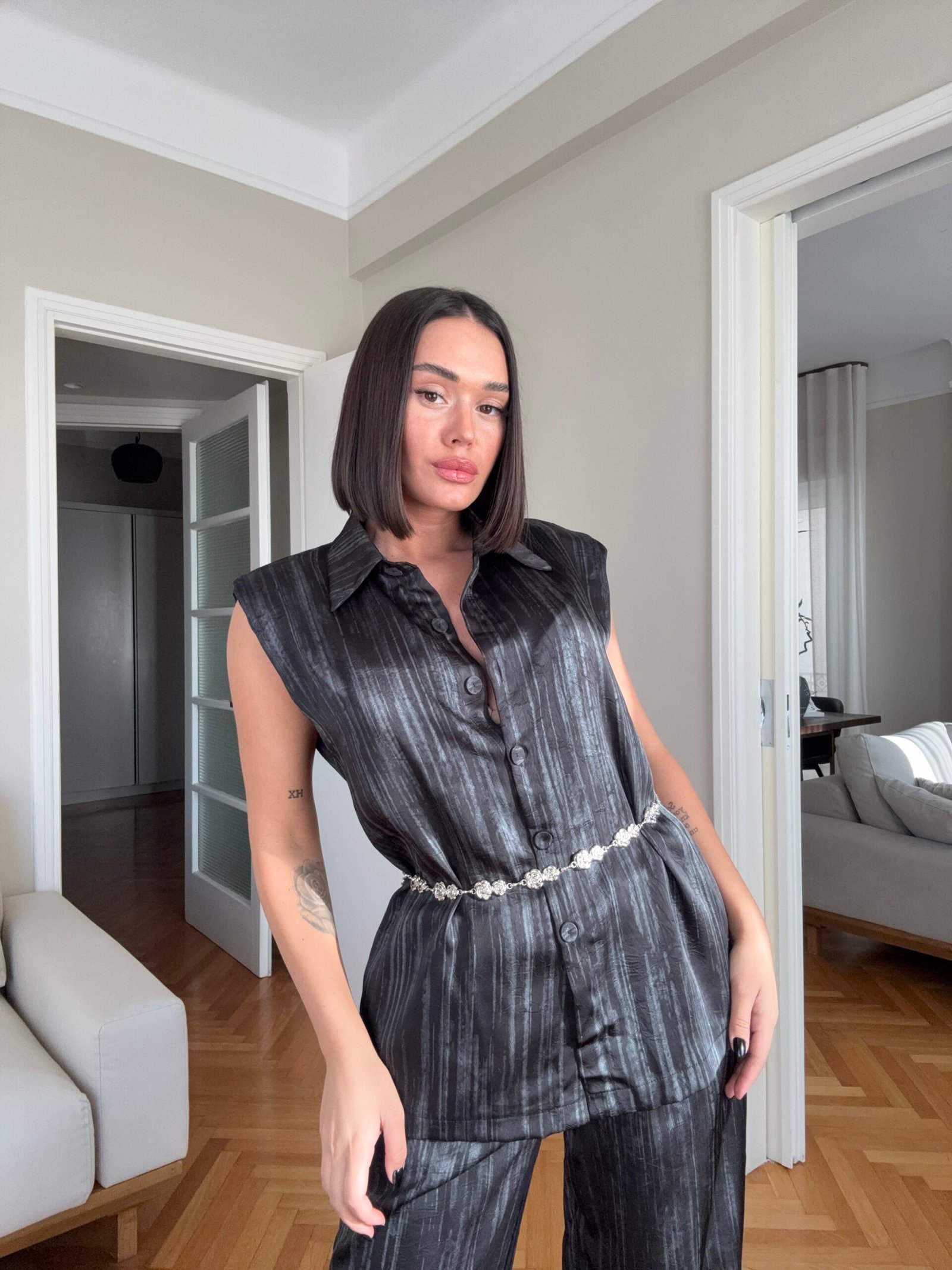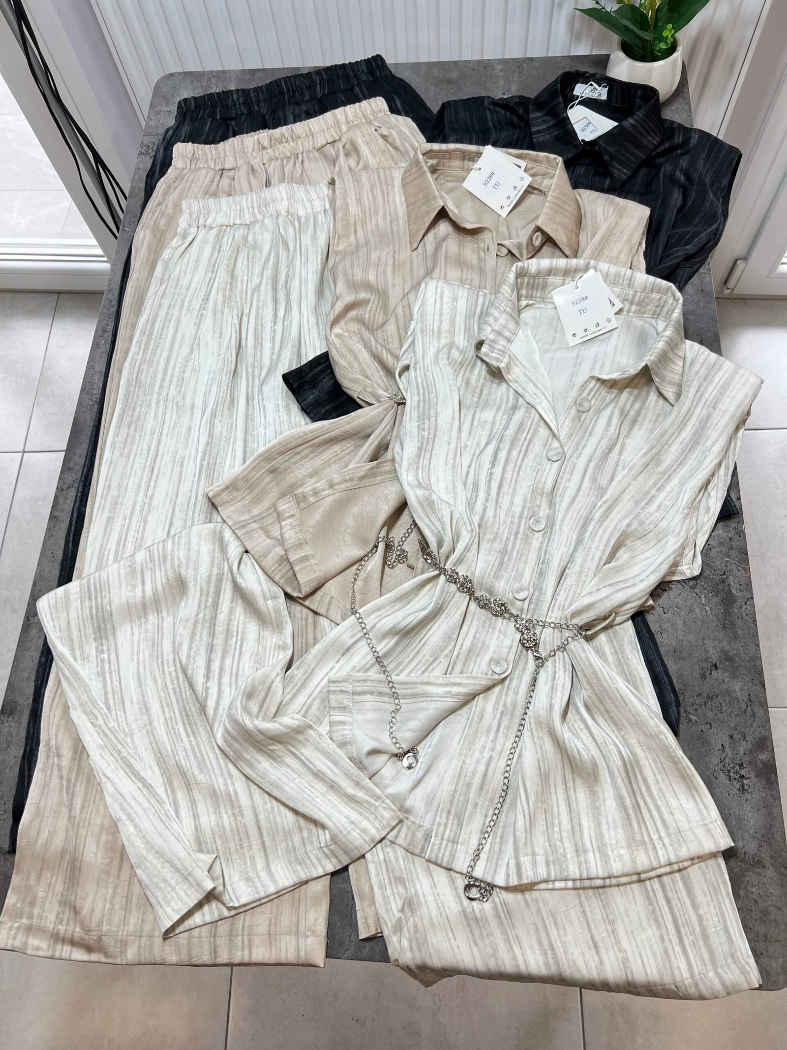 Pantallona të gjata të lirshme në prerje paralel. Me xhepa funksionale dhe llastik në bel. Këmishe pa krahe, në gjatësi poshtë vitheve.
