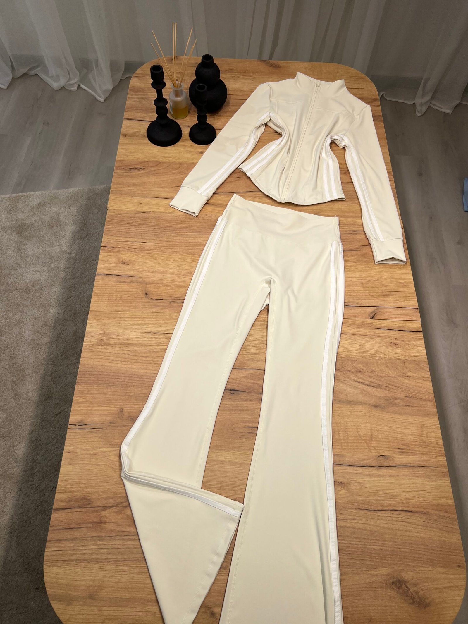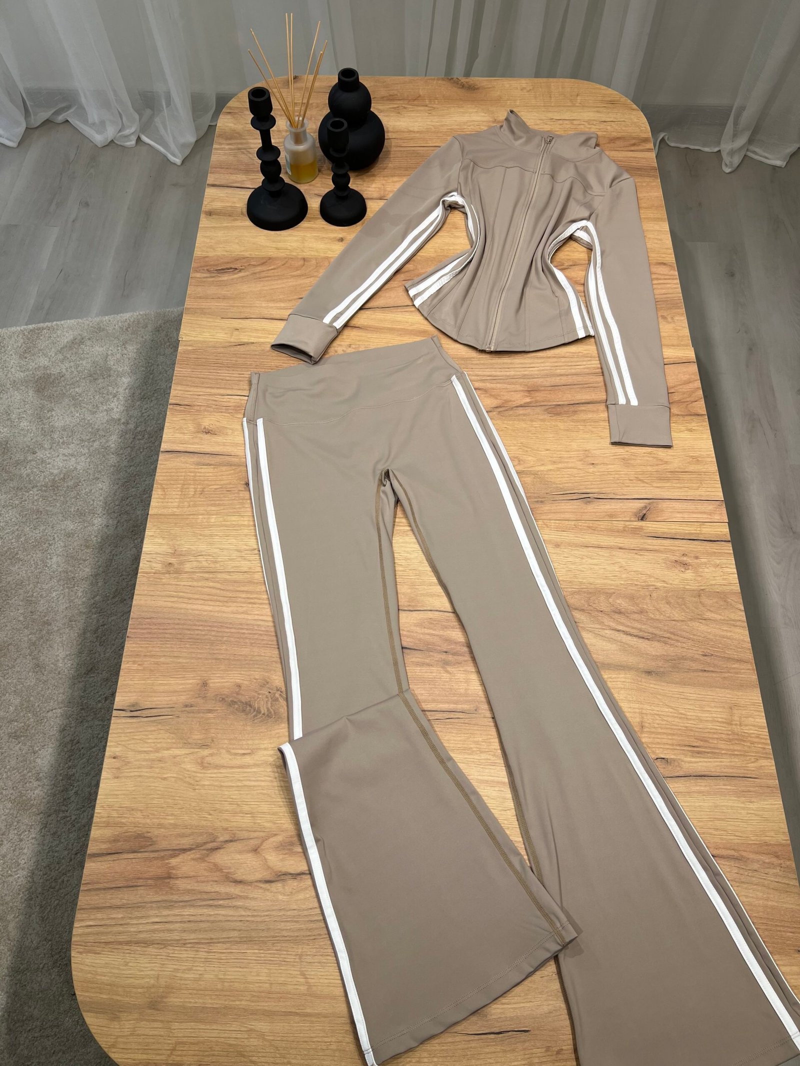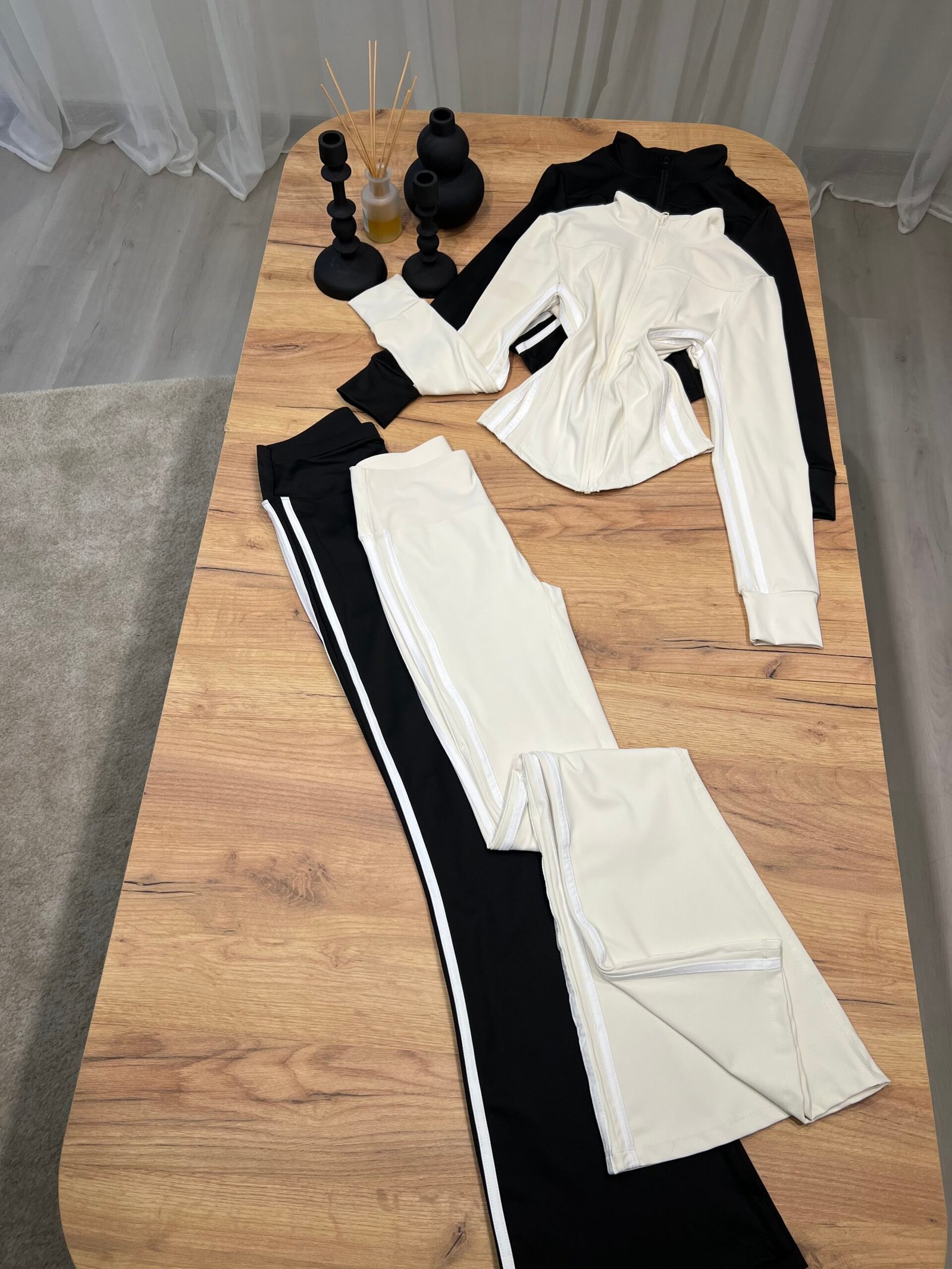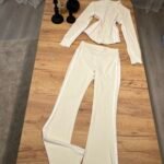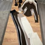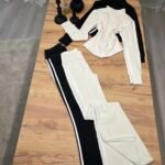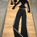Set sportiv me dizajn modern dhe efekt formues, i përbërë nga xhaketë me zinxhir dhe streçe flared high waist me vija anësore kontrast. Model që thekson siluetën, zgjat trupin dhe krijon efekt më të hollë falë vijave vertikale.