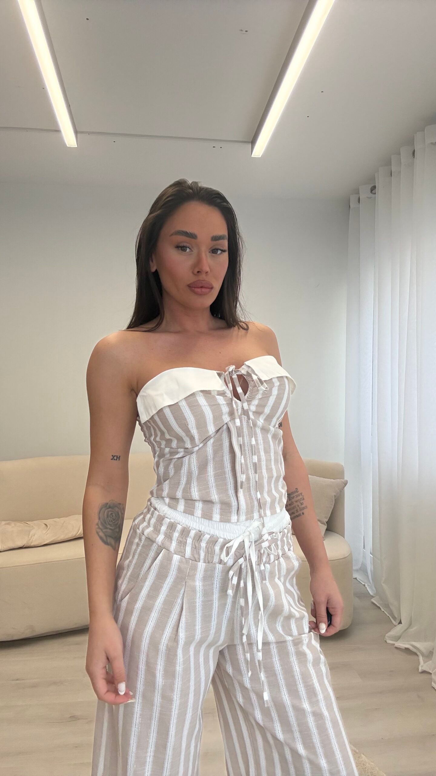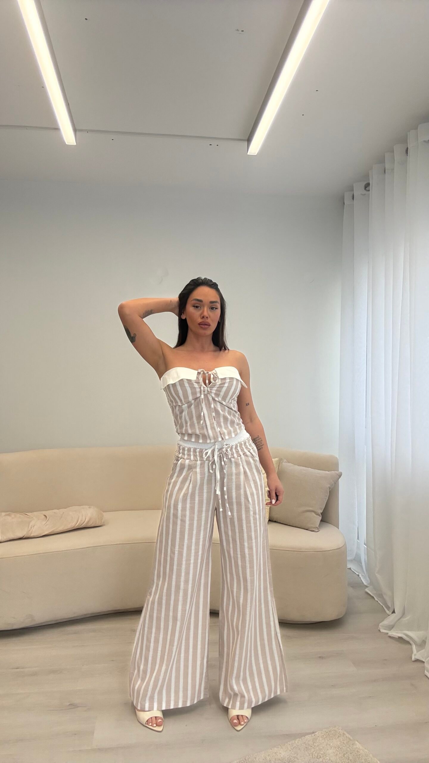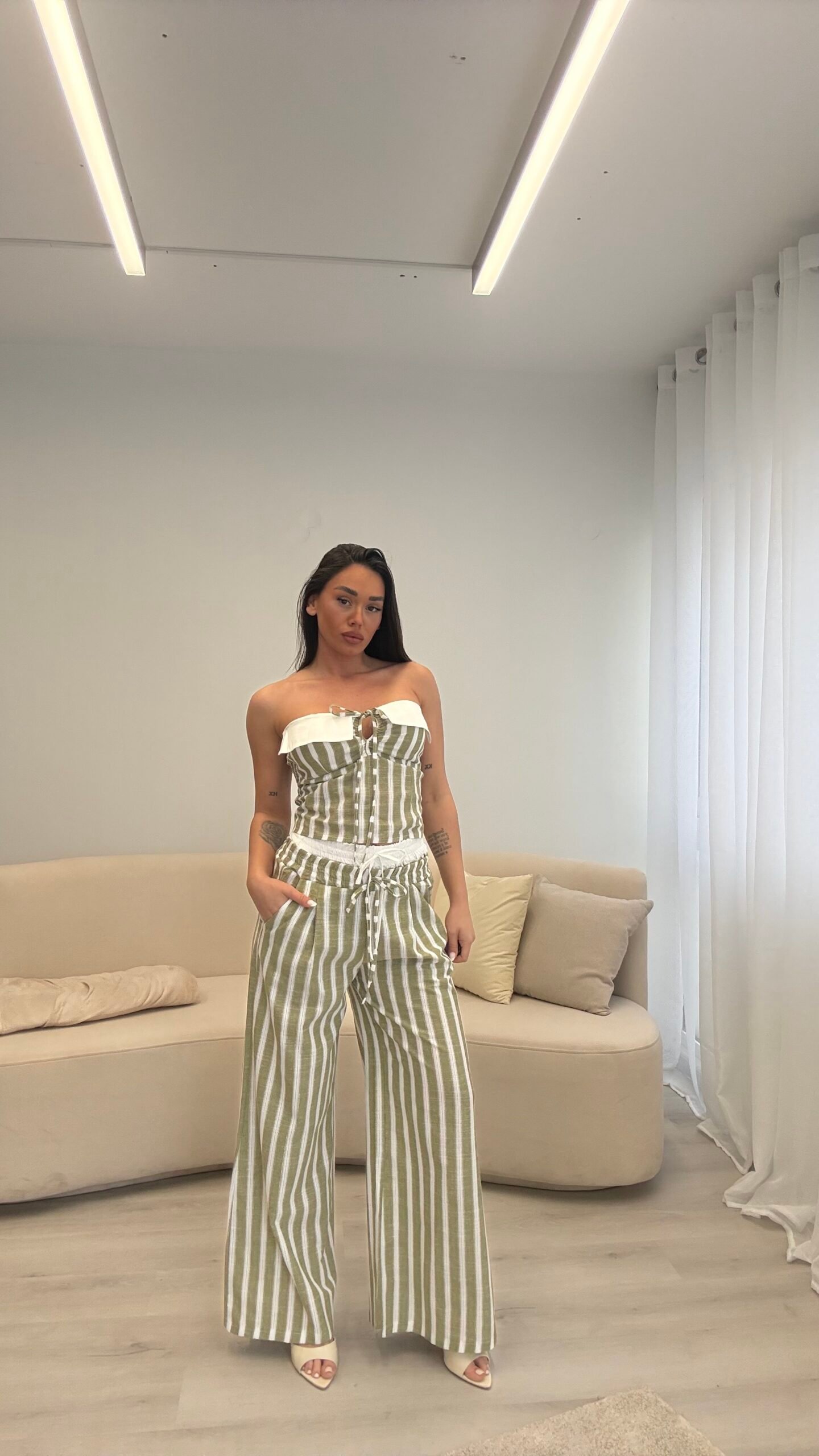 Set veror me pantallona wide leg dhe crop top me lidhje përpara. Material i lehtë me efekt linen, bel elastik dhe prerje e lirshme për rehati dhe siluetë të zgjatur. Ideal për pushime, city look dhe kombinime casual chic