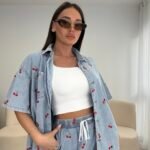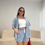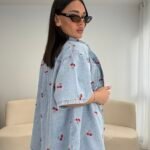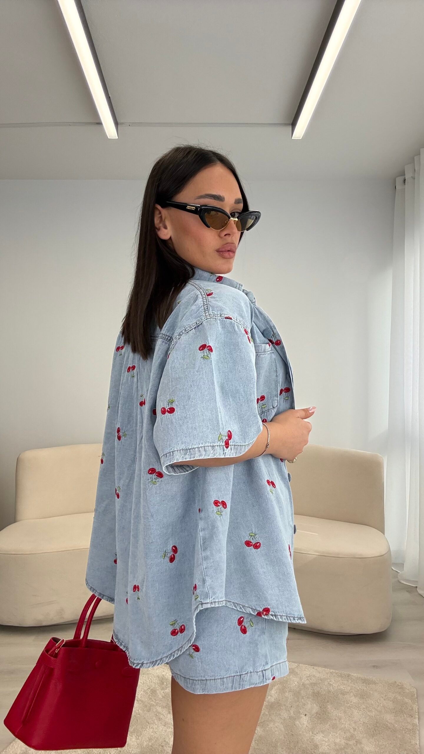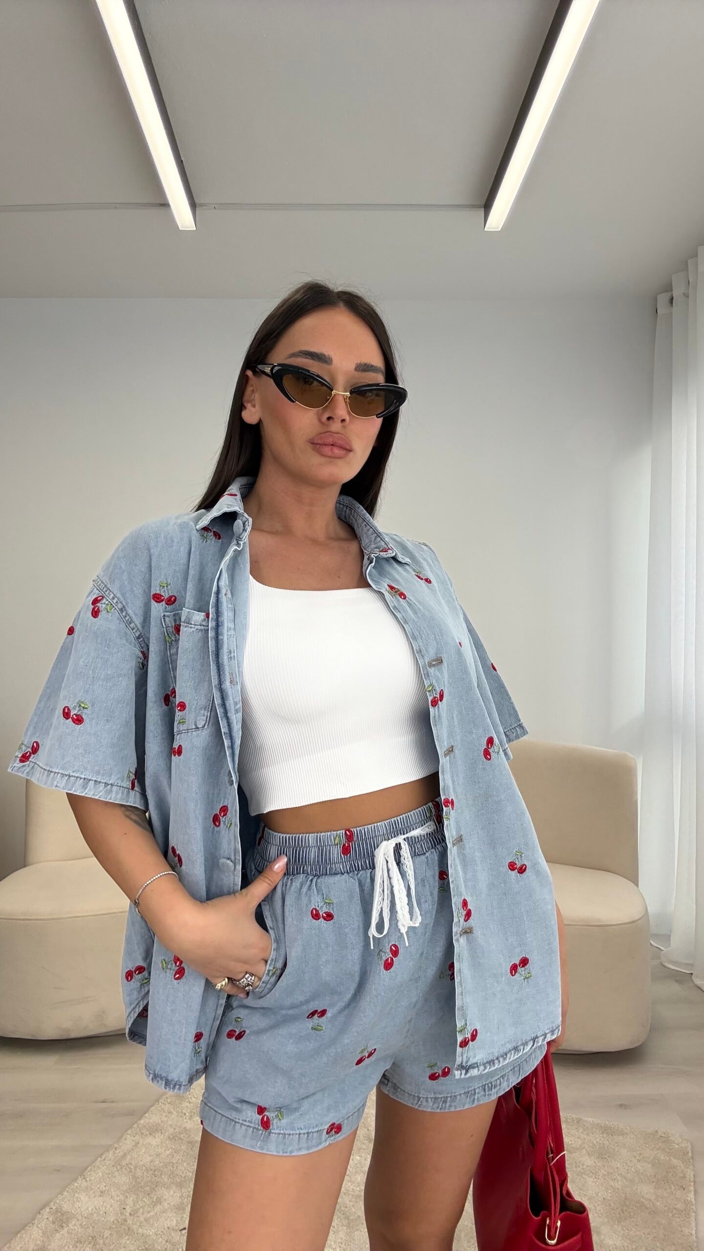 Set veror xhins me qëndisje qershie që sjell një vibe playful dhe fresh. Përfshin këmishë oversize dhe short me bel elastik për rehati maksimale. Ideal për outfit-e casual chic dhe kombinime të lehta gjatë ditës.