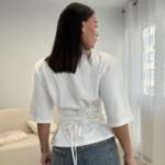 T-shirt i realizuar nga pambuk cilësor për rehati maksimale gjatë gjithë ditës. Modeli dallohet për vata të strukturuara në supe që japin formë elegante dhe për lidhësen në shpinë në stil corseti, e cila thekson siluetën dhe krijon një look të veçantë. I përshtatshëm për kombinime casual dhe chic, nga dita në mbrëmje.