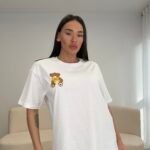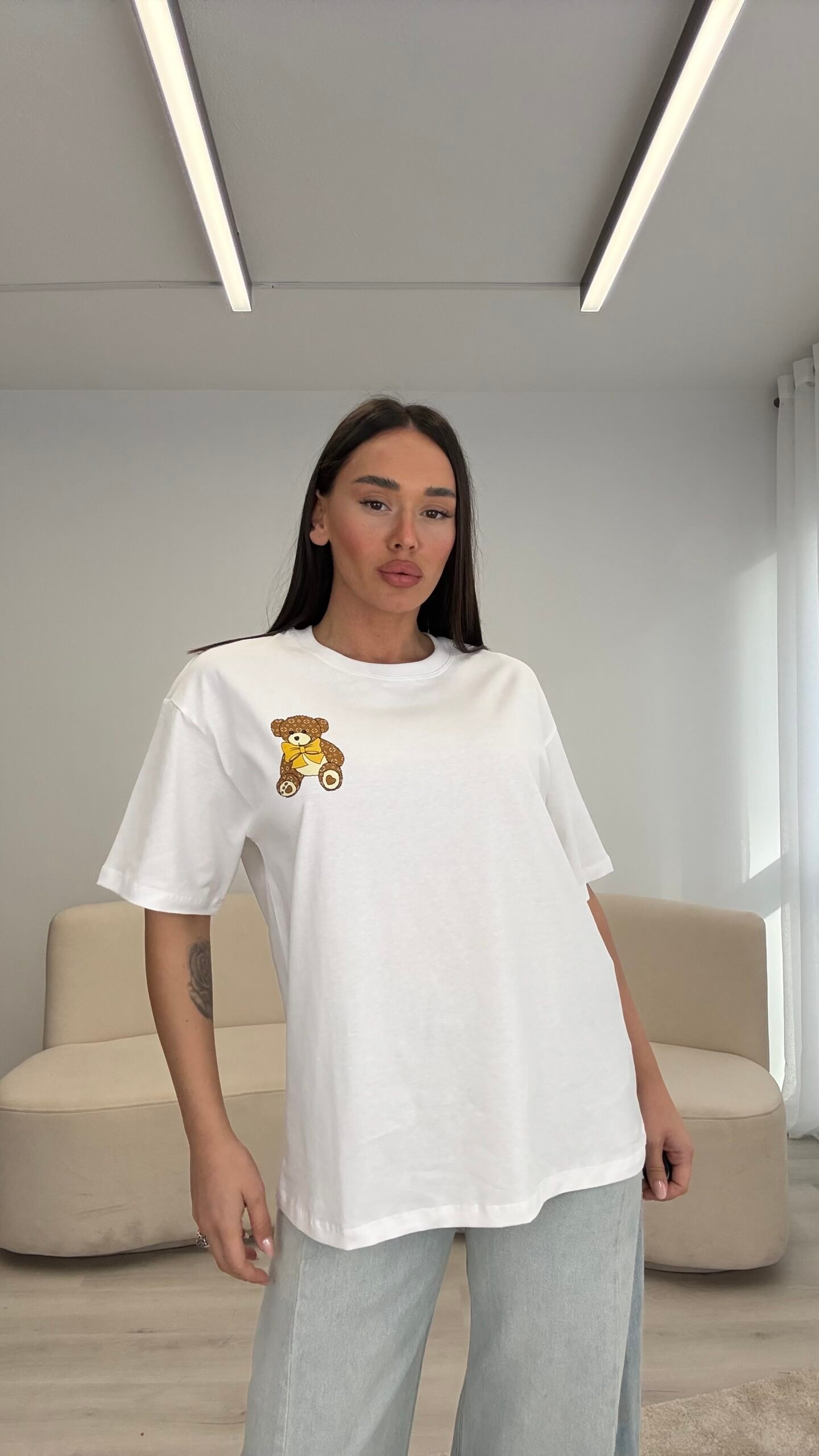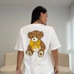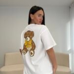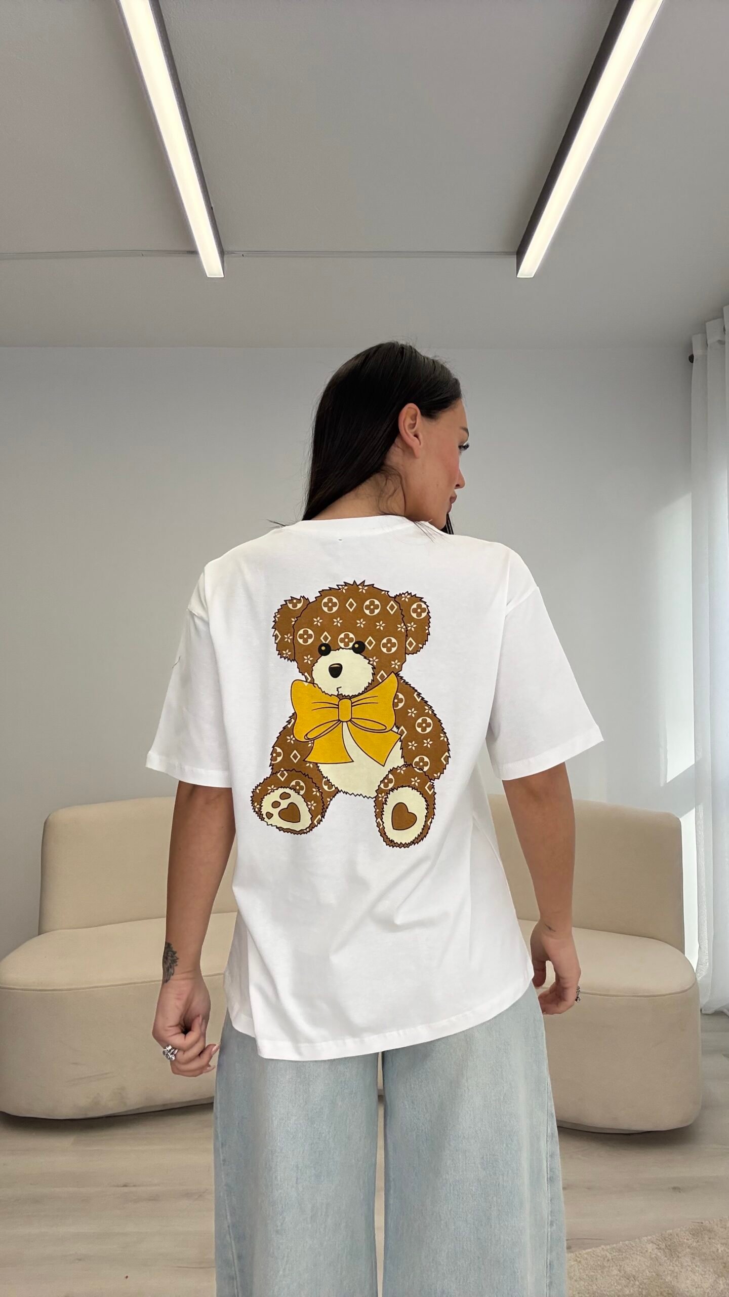 T-shirt oversize prej pambuku të butë, me print unik arushi në pjesën e përparme dhe të pasme që i jep outfit-it një vibe playful por stil. Prerja e lirshme krijon komoditet maksimal dhe e bën perfekte për kombinime casual me xhinse ose pantallona të gjera.