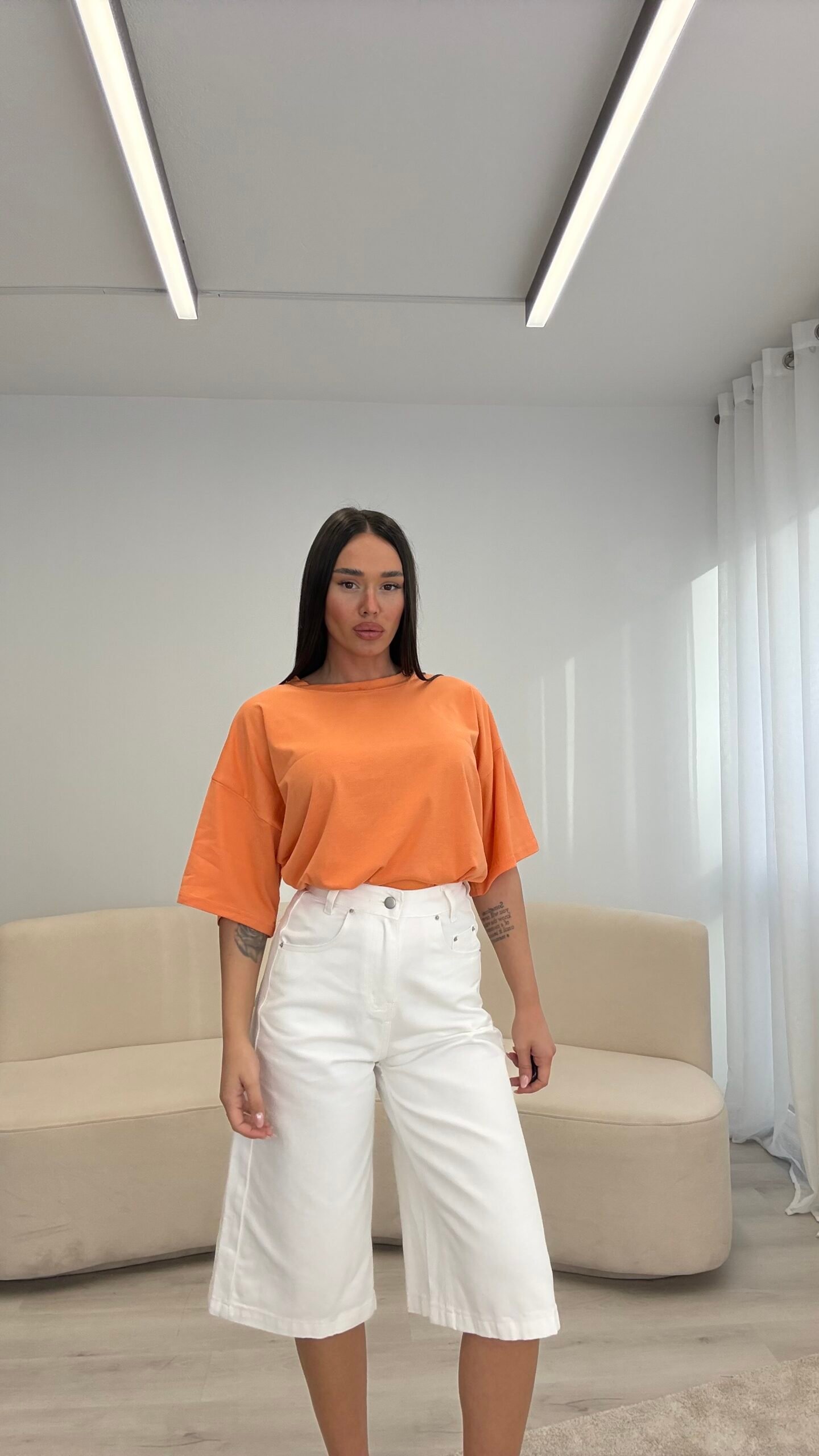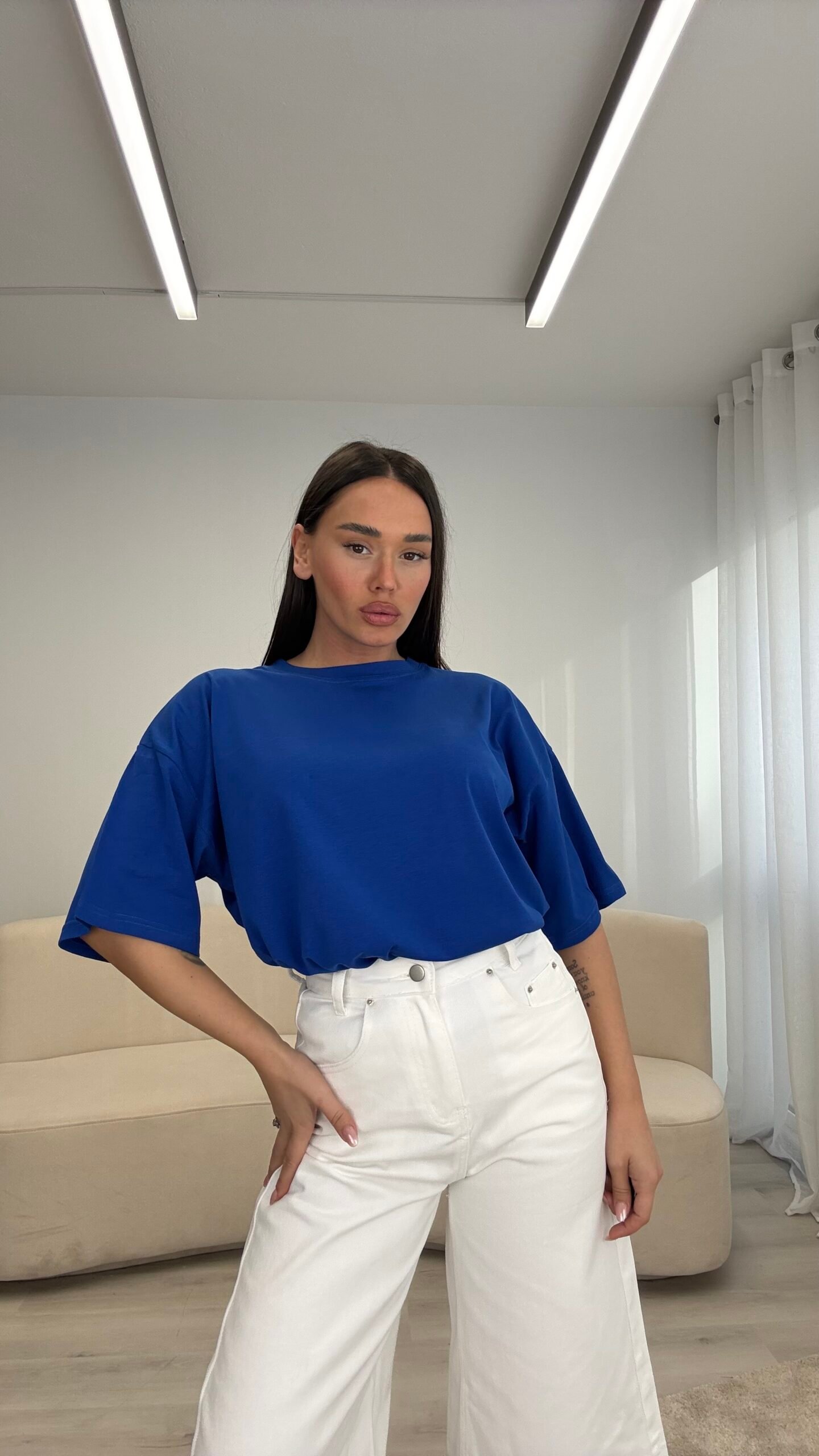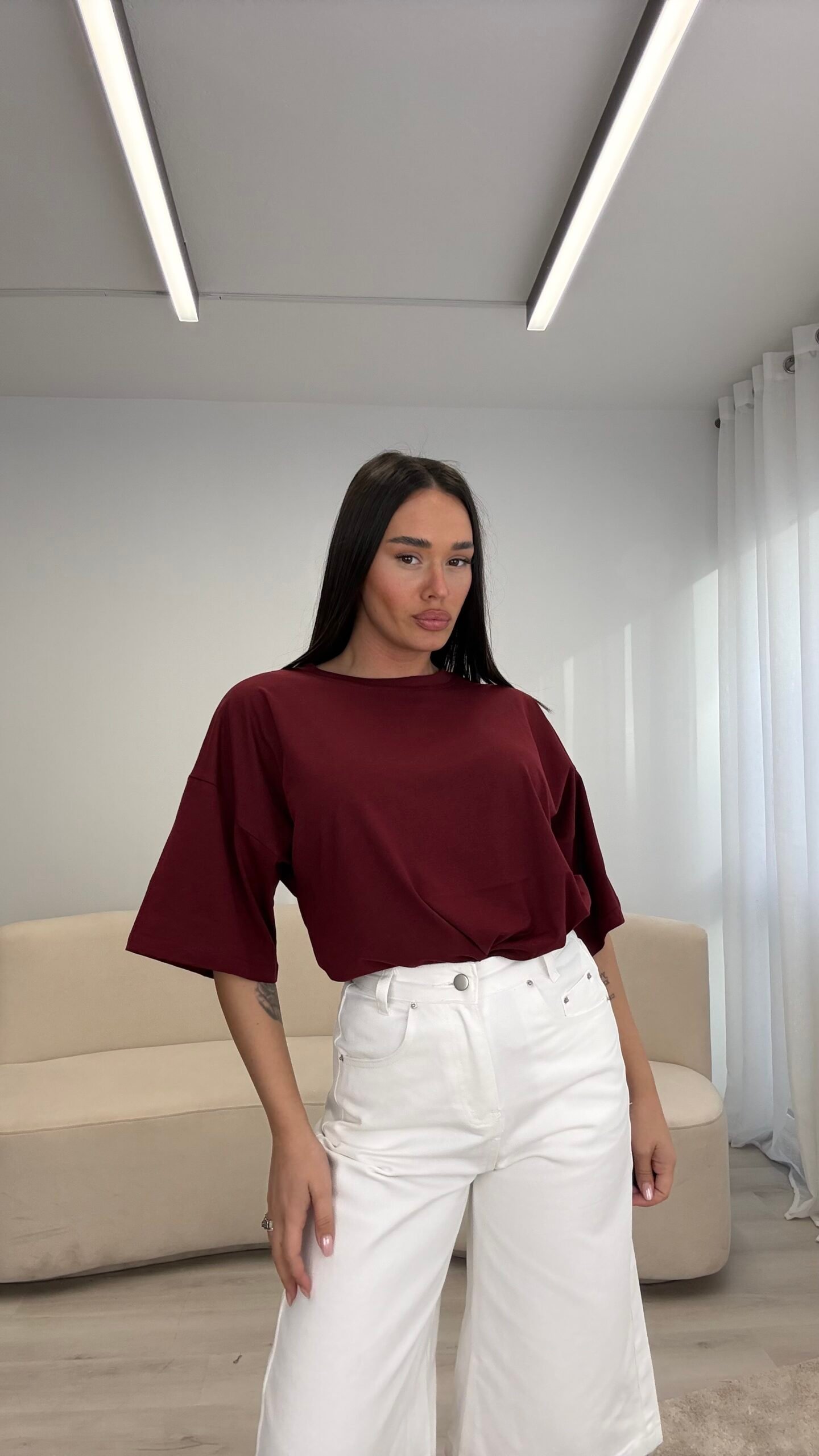 T-shirt me prerje oversize dhe formë të lirshme që krijon një look modern dhe effortless. Material i butë dhe komod për përdorim të përditshëm, i lehtë për t’u kombinuar nga casual deri te outfit-et më të kuruara.