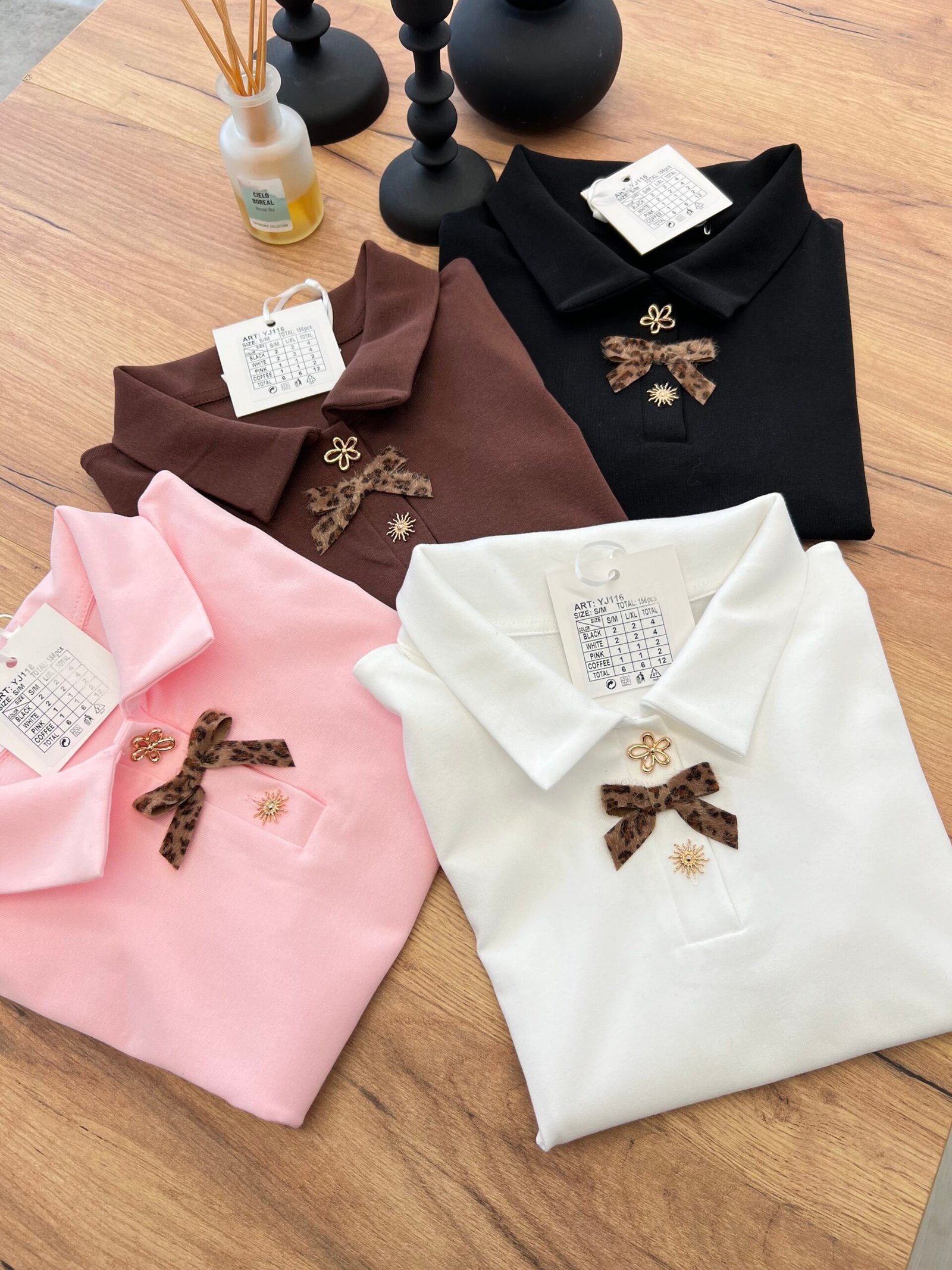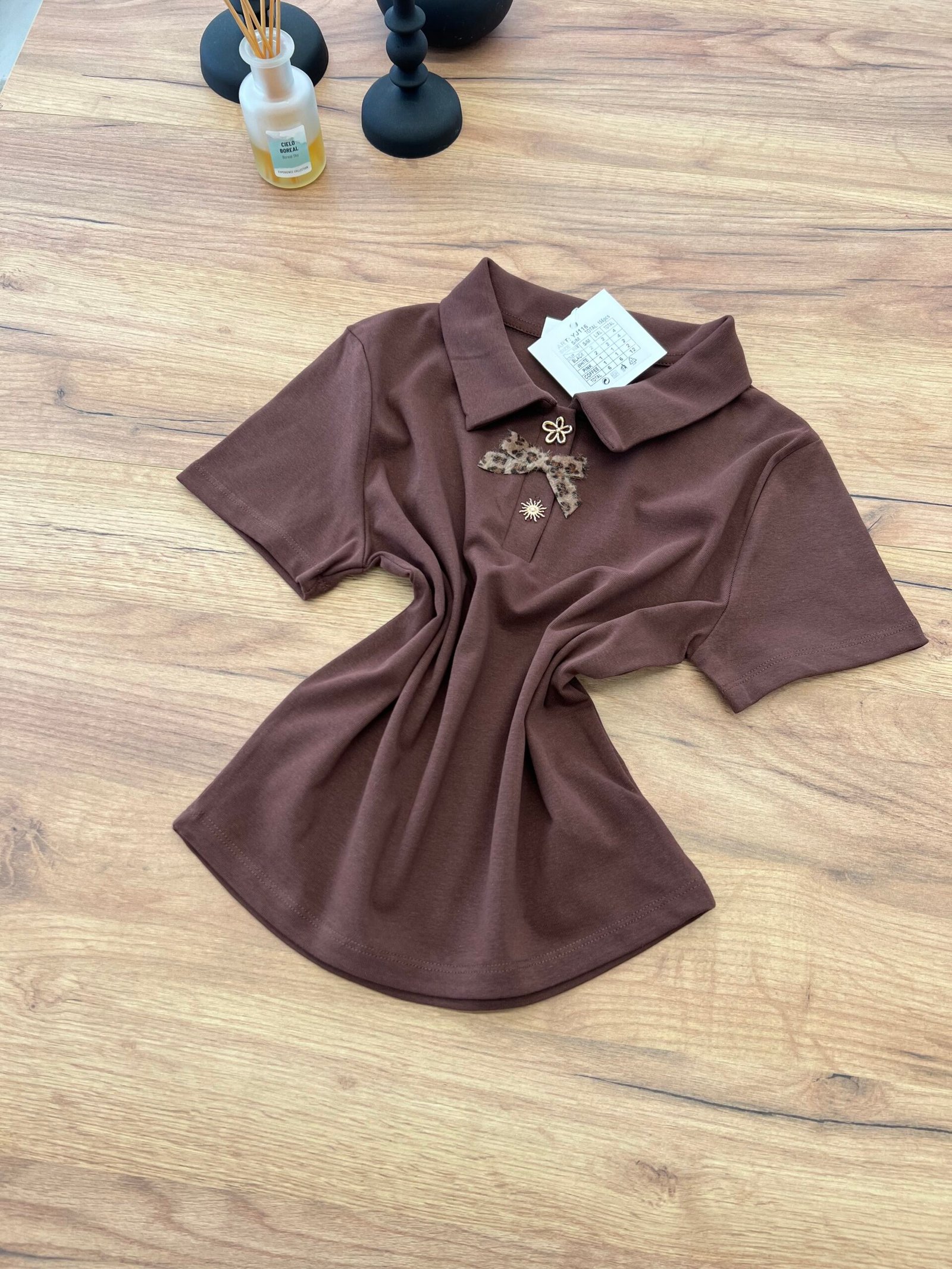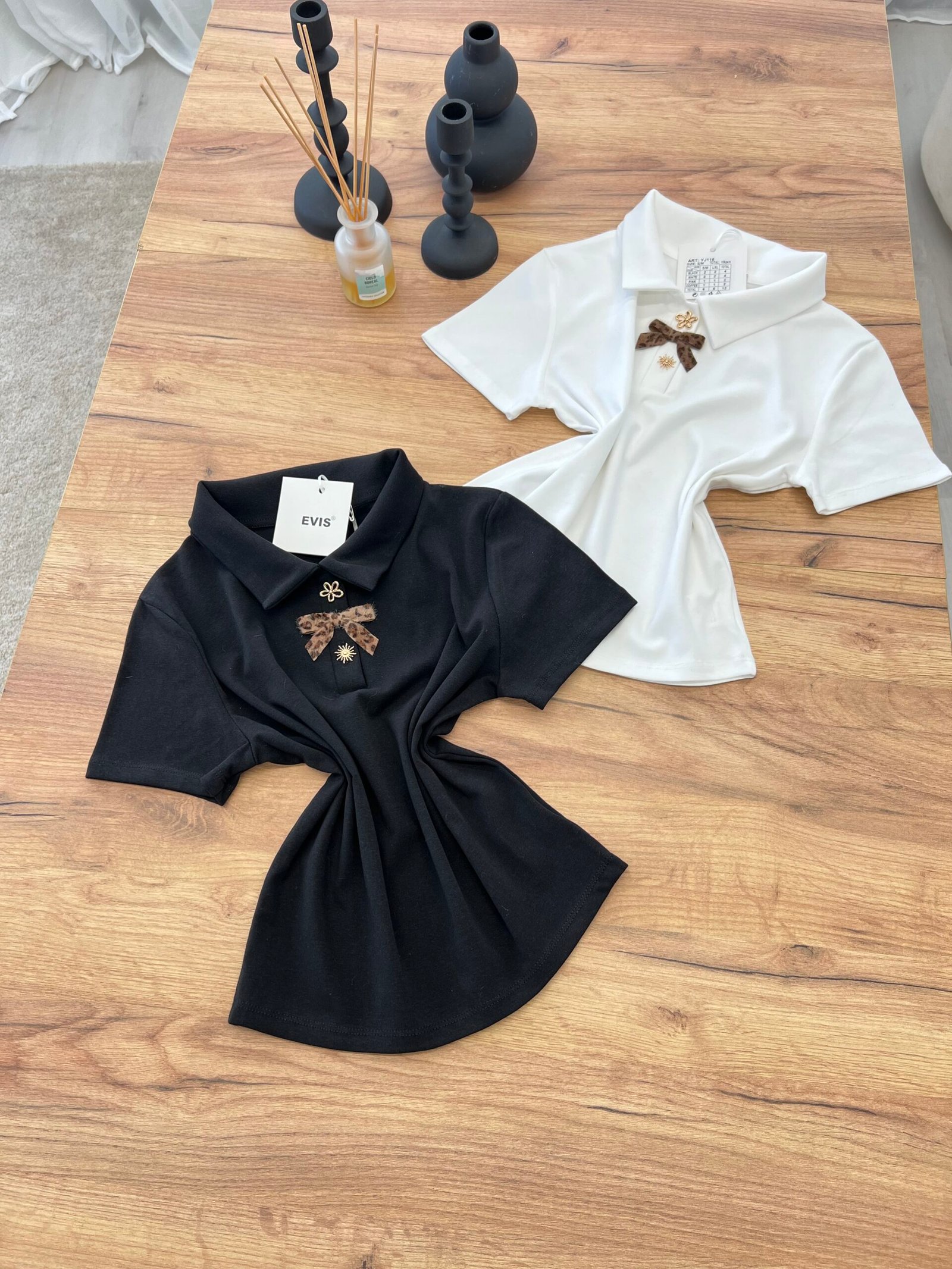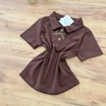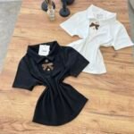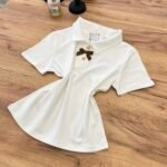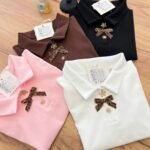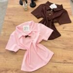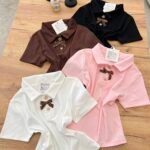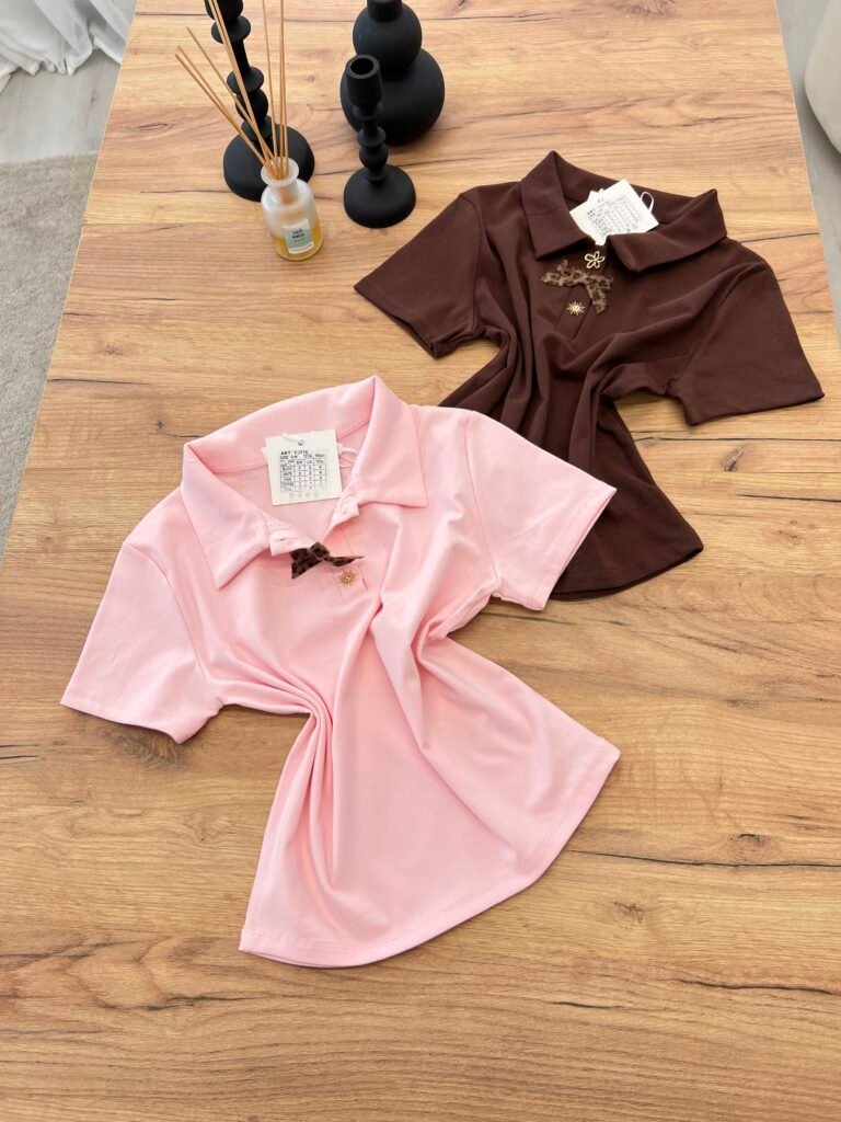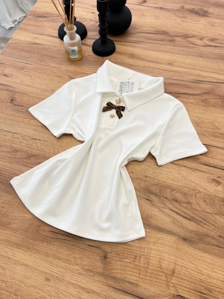Top elegant me jakë polo dhe detaj dekorativ me fjongo në pjesën e përparme që i jep një prekje feminine dhe chic. Dizajni minimalist me elemente dekorative krijon një look të rafinuar që kombinon stilin klasik me trendet moderne.