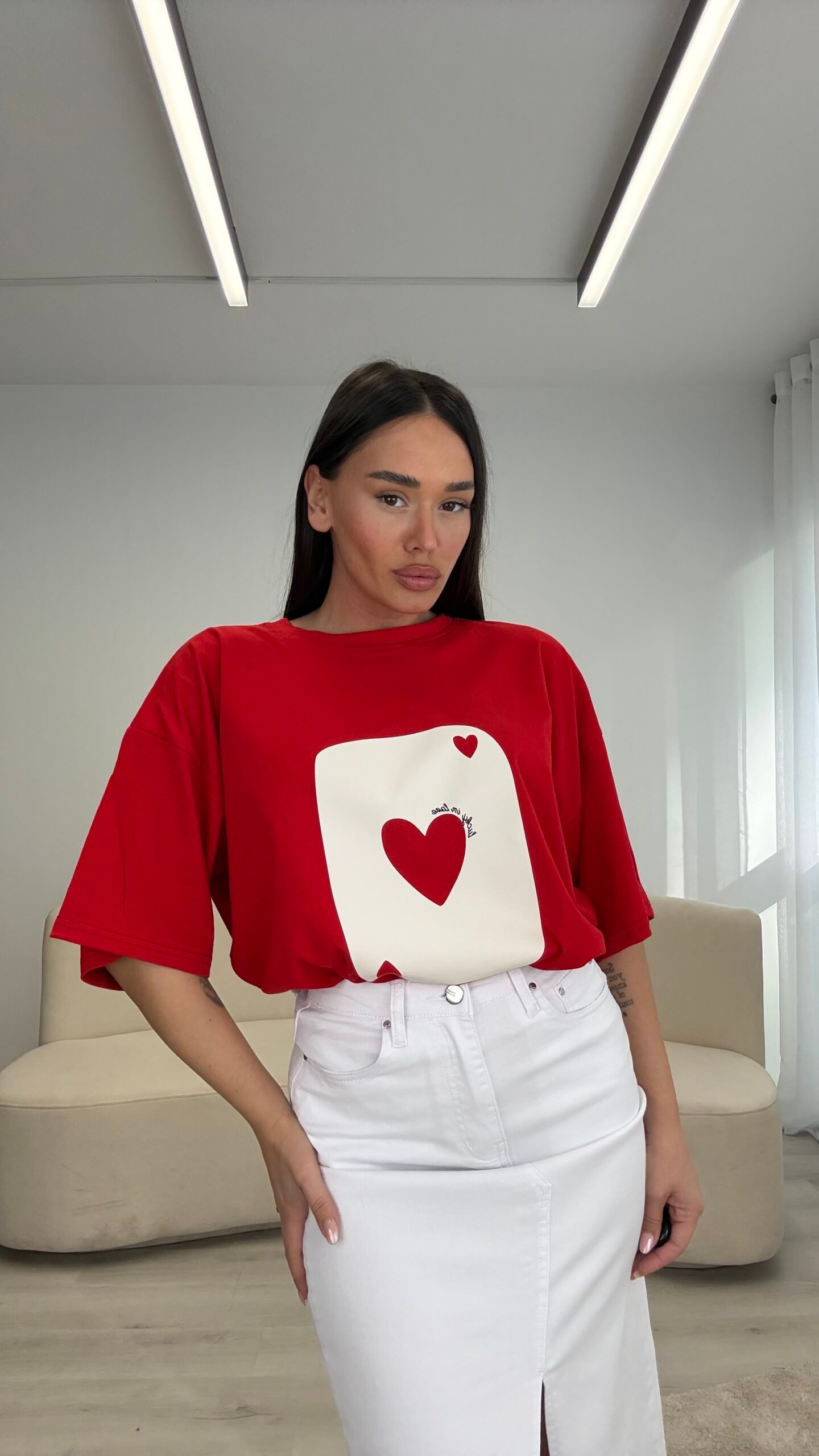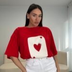 T-shirt me prerje oversize dhe print grafik në pjesën e përparme që i jep look-ut karakter dhe stil. Material i butë dhe komod për përdorim të përditshëm, i lehtë për t’u kombinuar në outfit-e casual ose statement.
