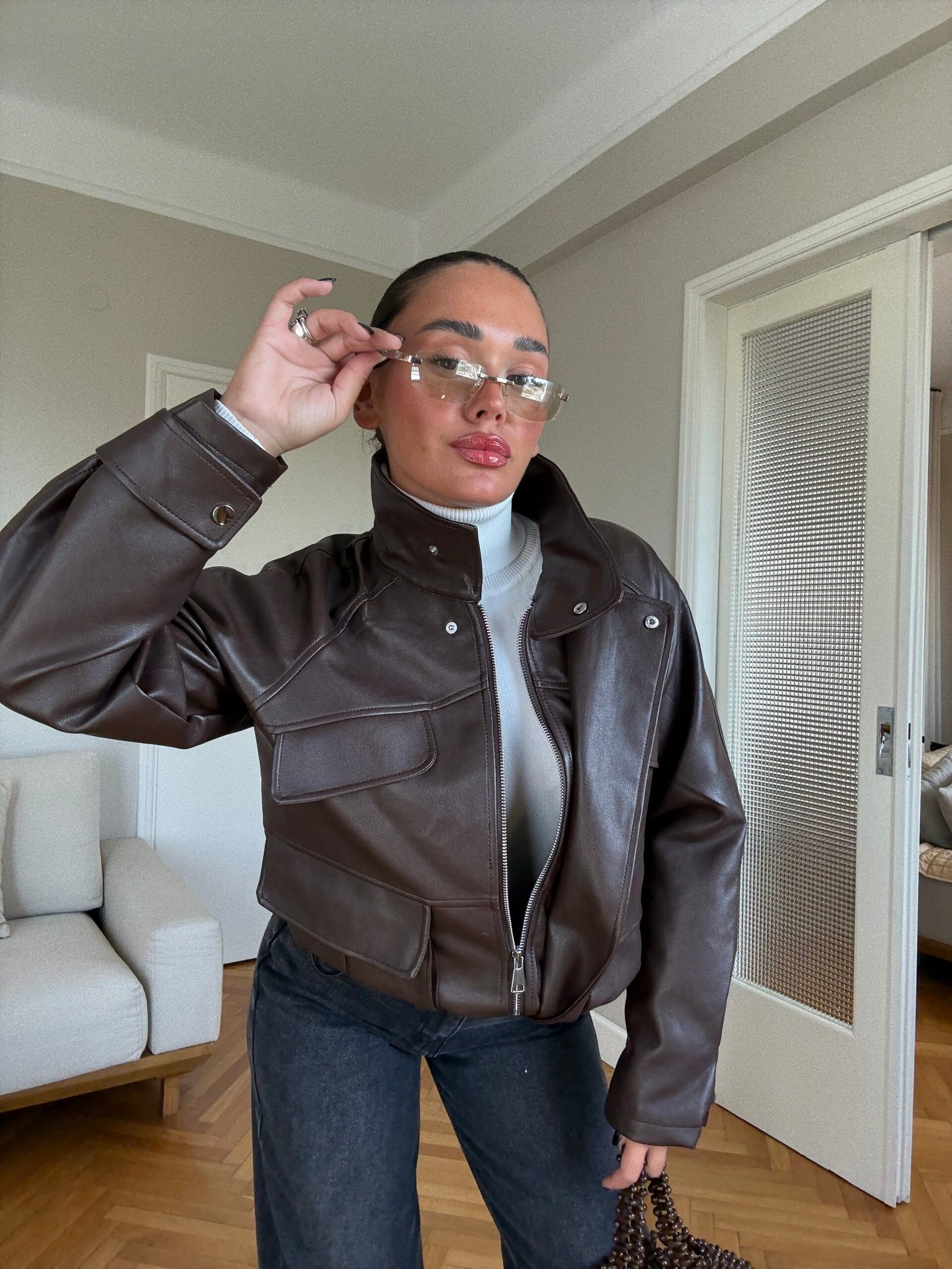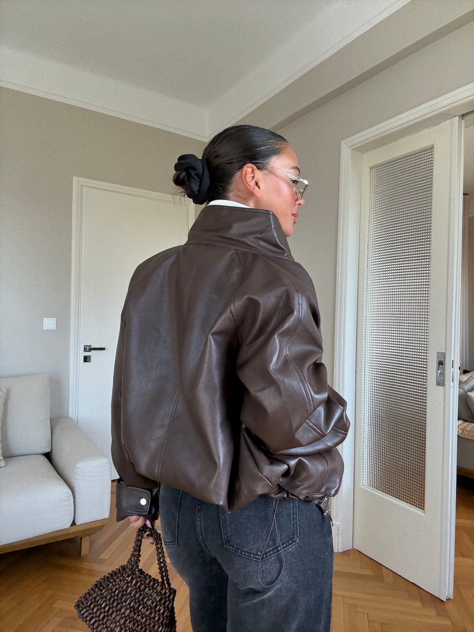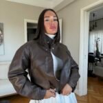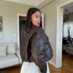 Xhaketë prej lëkure eco në ngjyrë kafe të errët, një must-have për garderobën e këtij sezoni. Me prerje moderne, mëngë pak të fryra dhe dizajn me xhepa, vjen me llastikë funksionalë fundorë për të zgjeruar/ngushtuar sipas dëshirës.Material i cilësisë së lartë ofron komoditet dhe stil, duke e bërë një zgjedhje ideale për veshje të përditshme apo për dalje elegante.