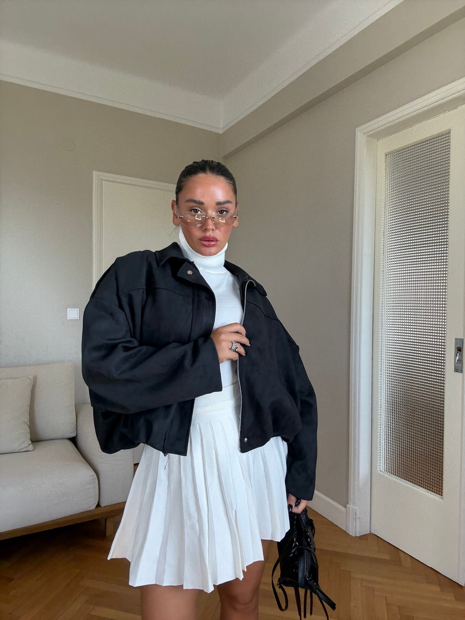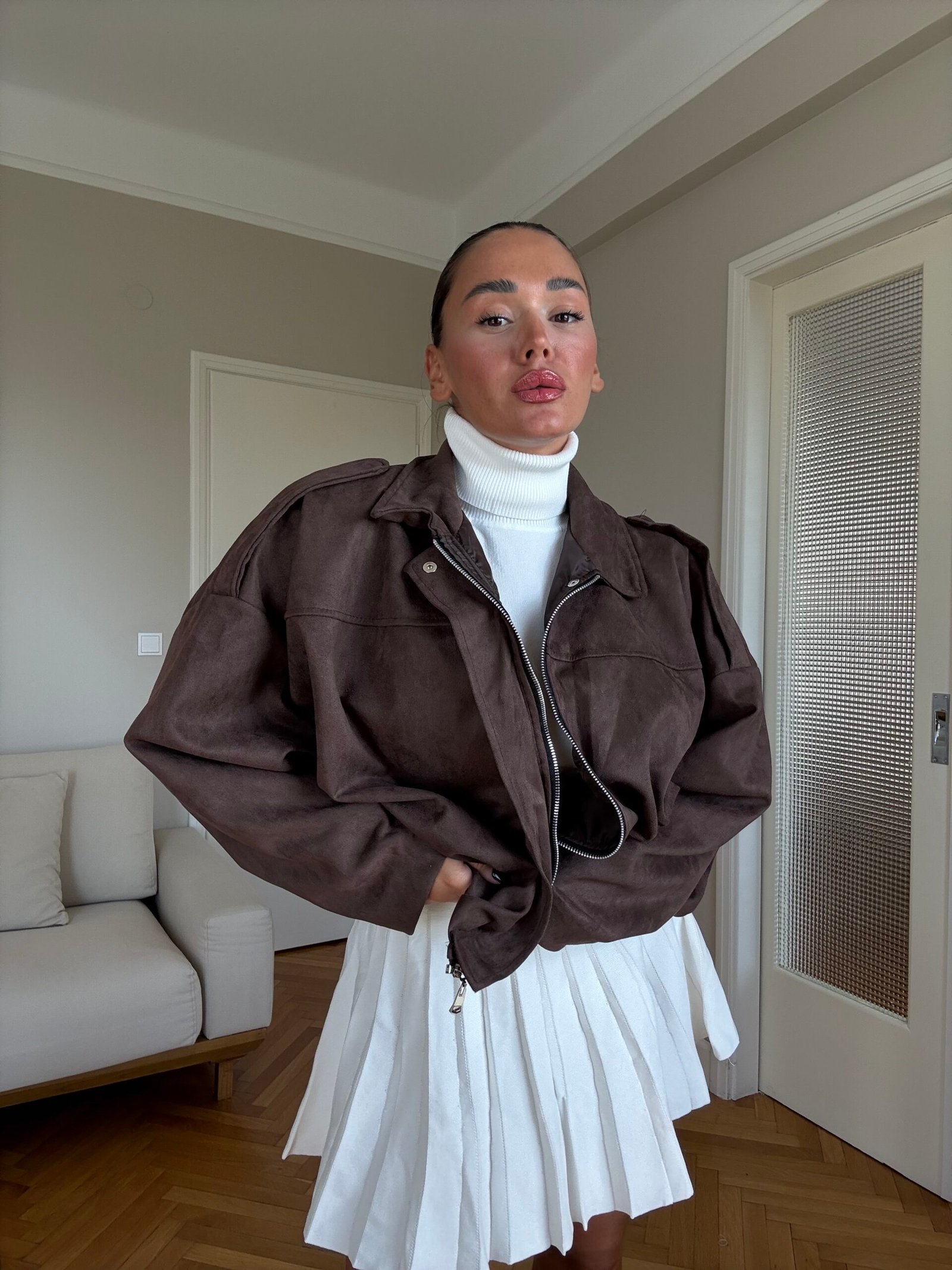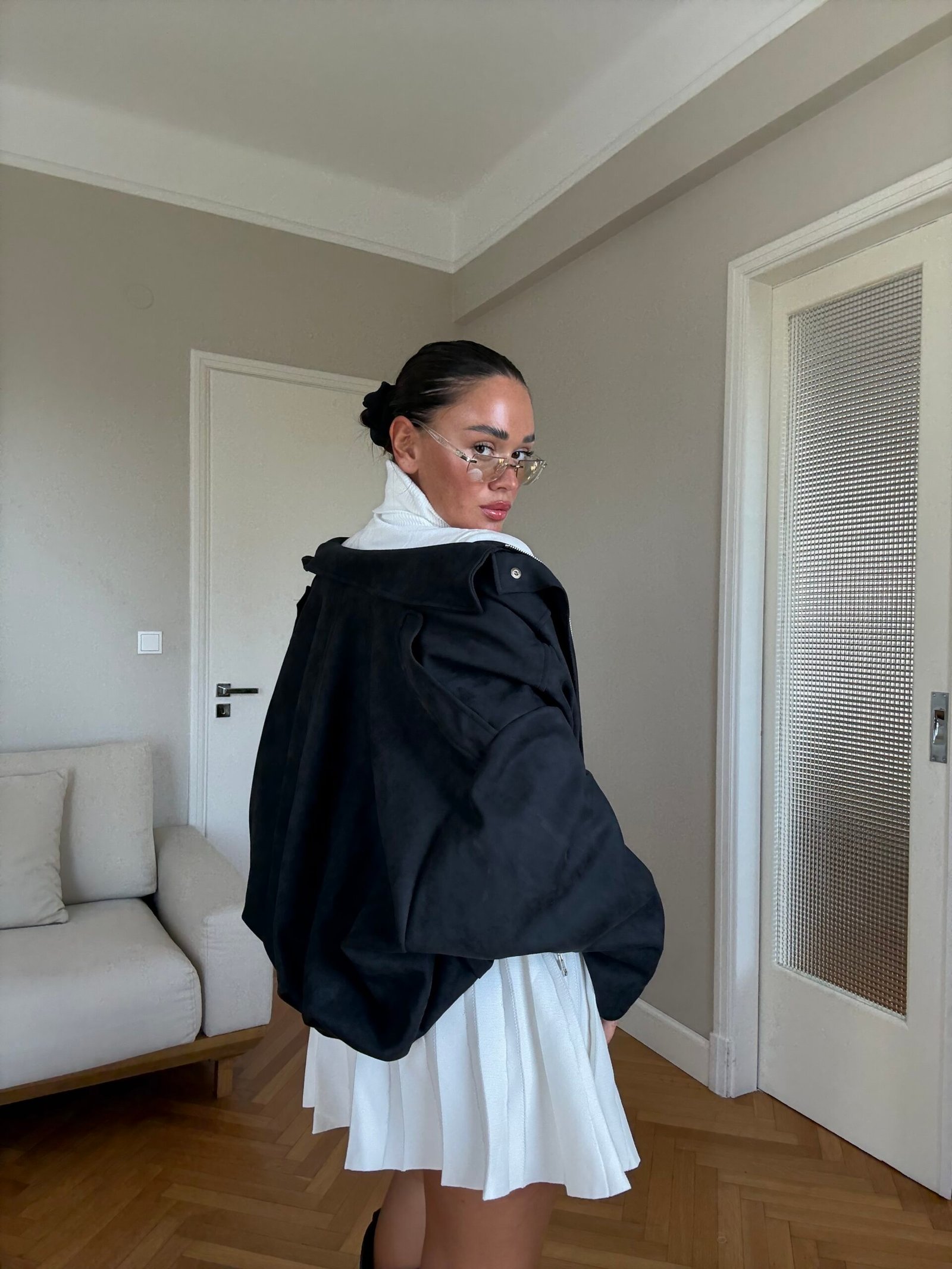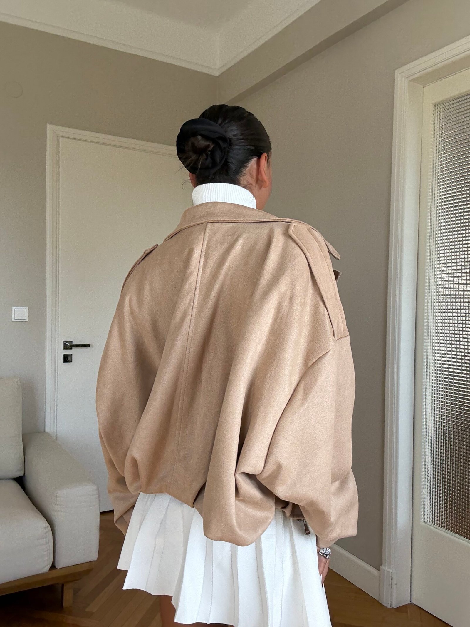 Kjo xhaketë oversize në material suede look është zgjedhja perfekte për një look modern dhe të rehatshëm. Prerja e lirshme dhe mbyllja me zinxhir i japin stil urban dhe chic. Ideale për vjeshtë-dimër për një pamje minimaliste dhe elegante..
