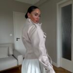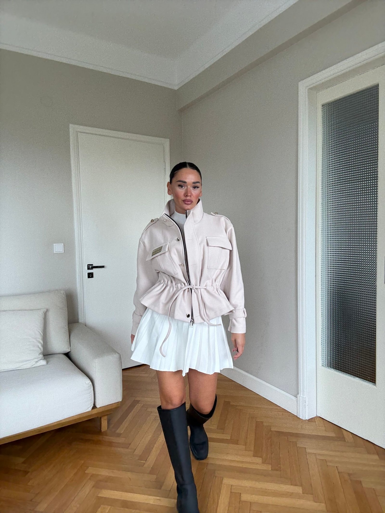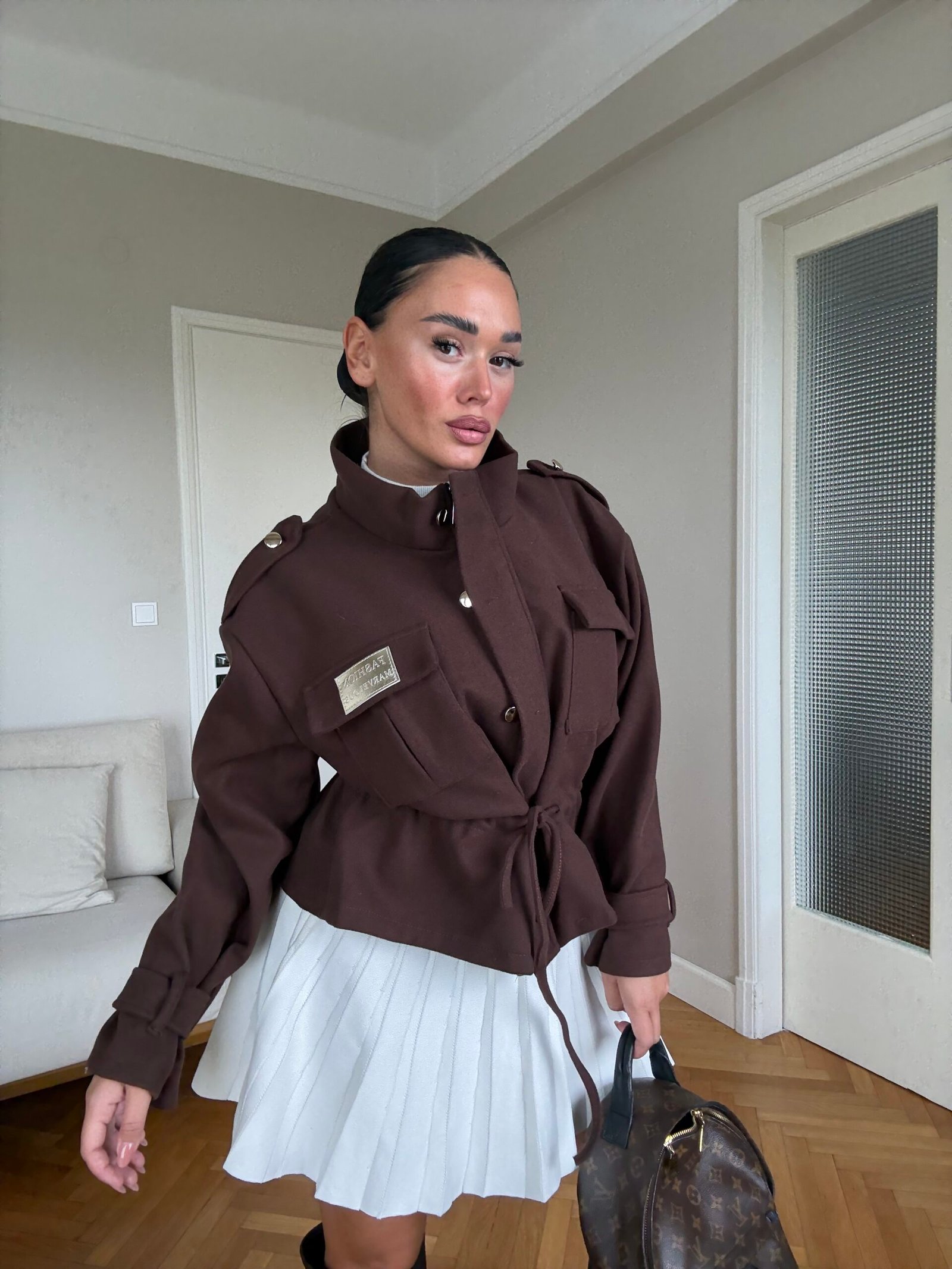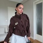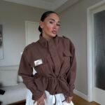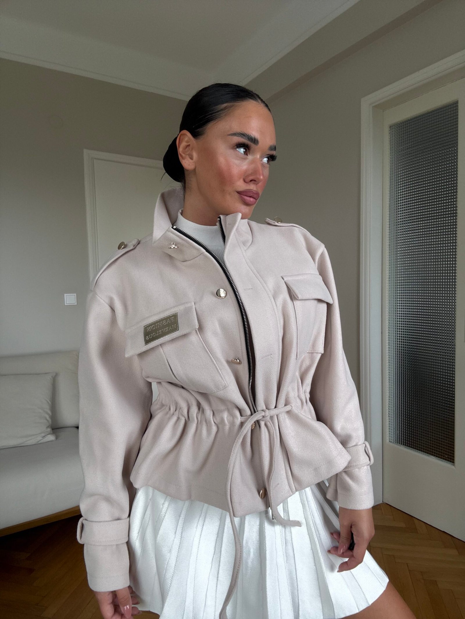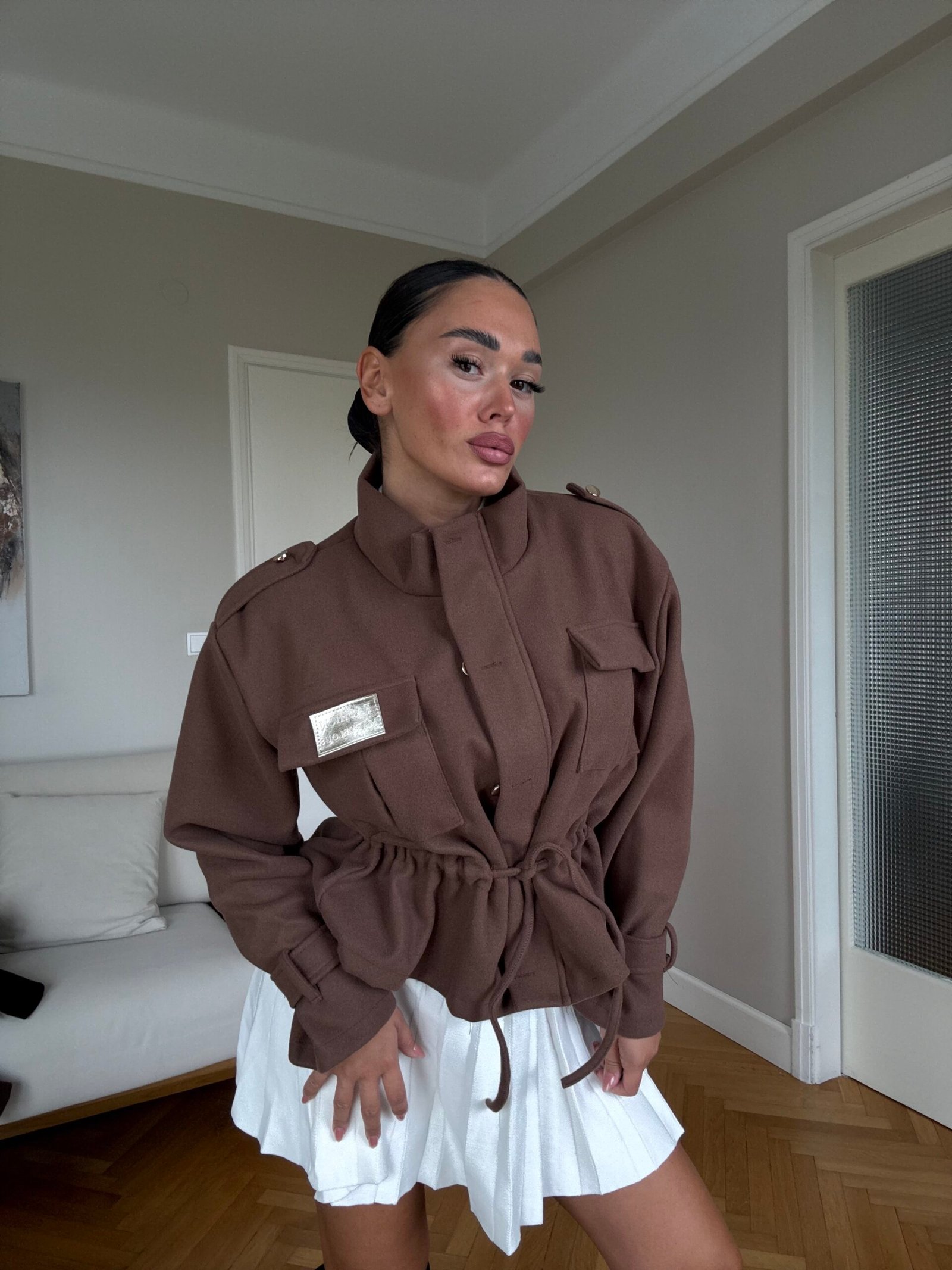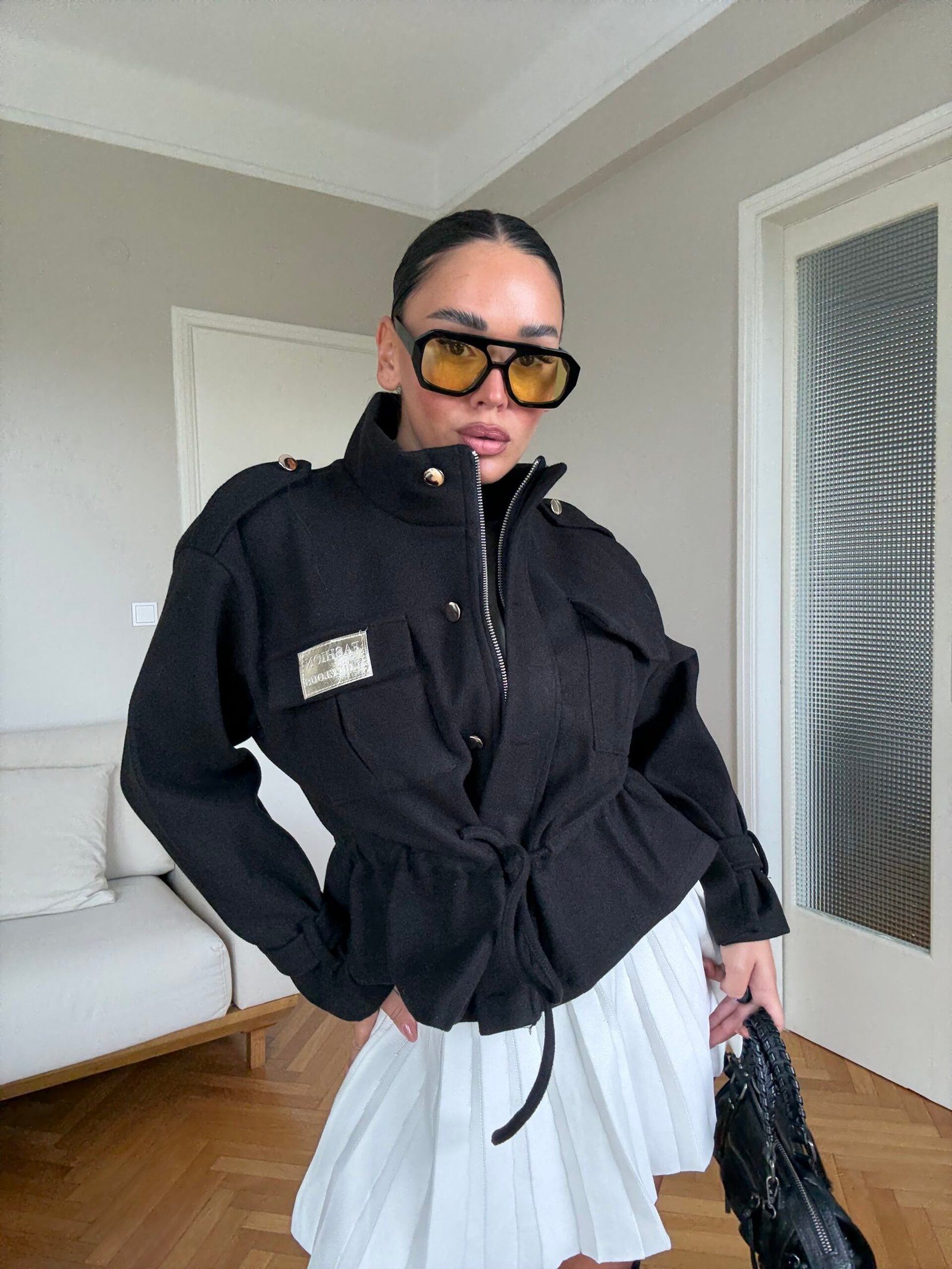 Kjo xhaketë me prerje moderne dhe rrip në bel është një zgjedhje elegante që kombinon stilin urban me komoditetin e përditshëm. Dizajni me jakë të lartë dhe detaje unike sjell një pamje të sofistikuar, ndërsa materiali i lehtë e bën të përshtatshme për sezonin vjeshtë-dimër. Perfekte për një look modern dhe chic.