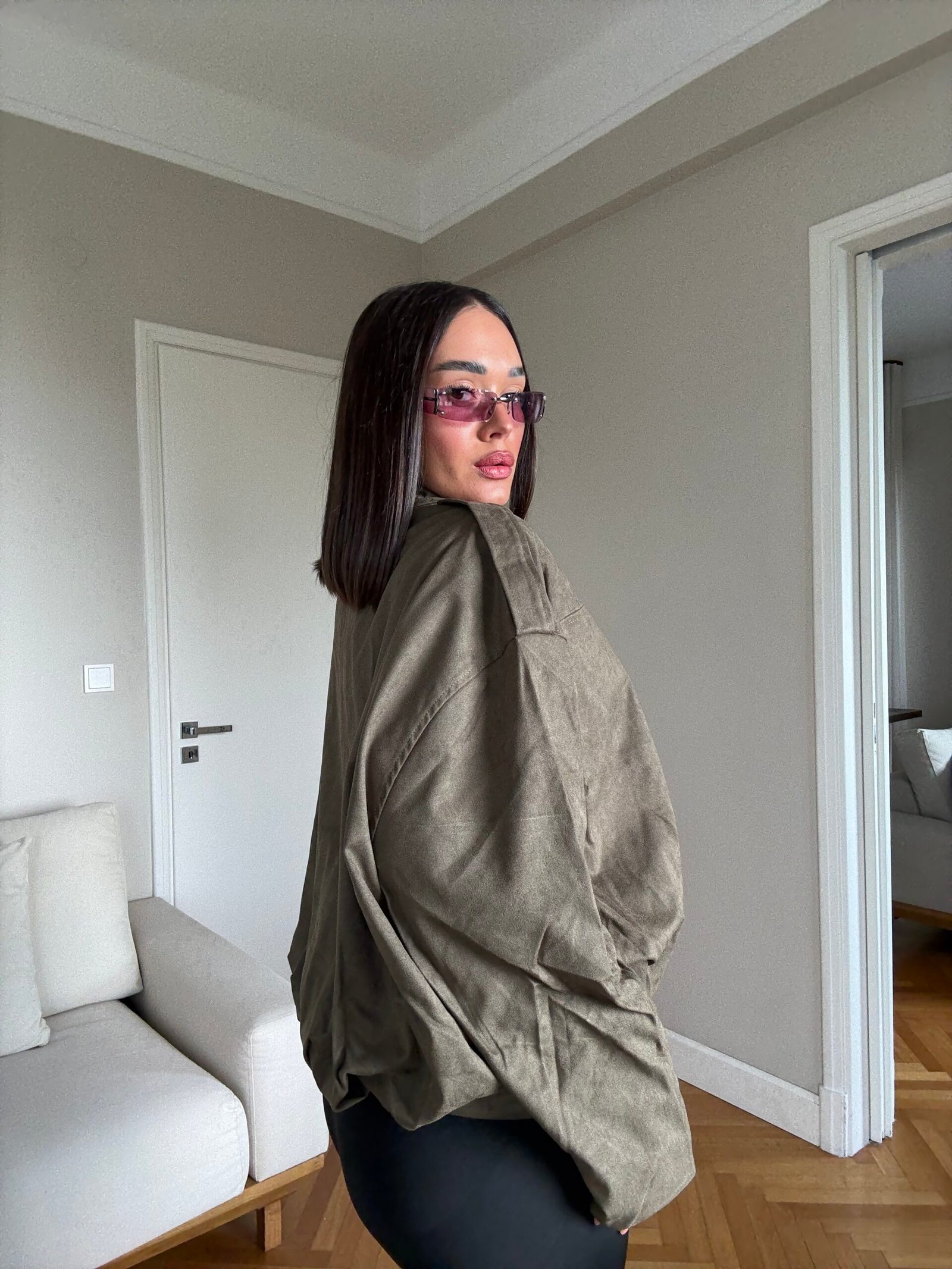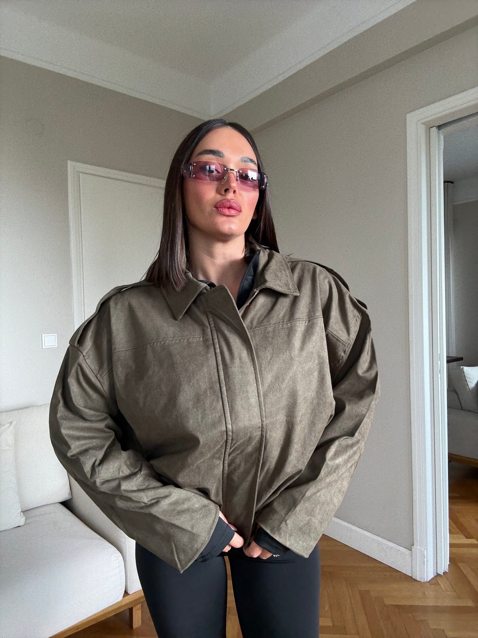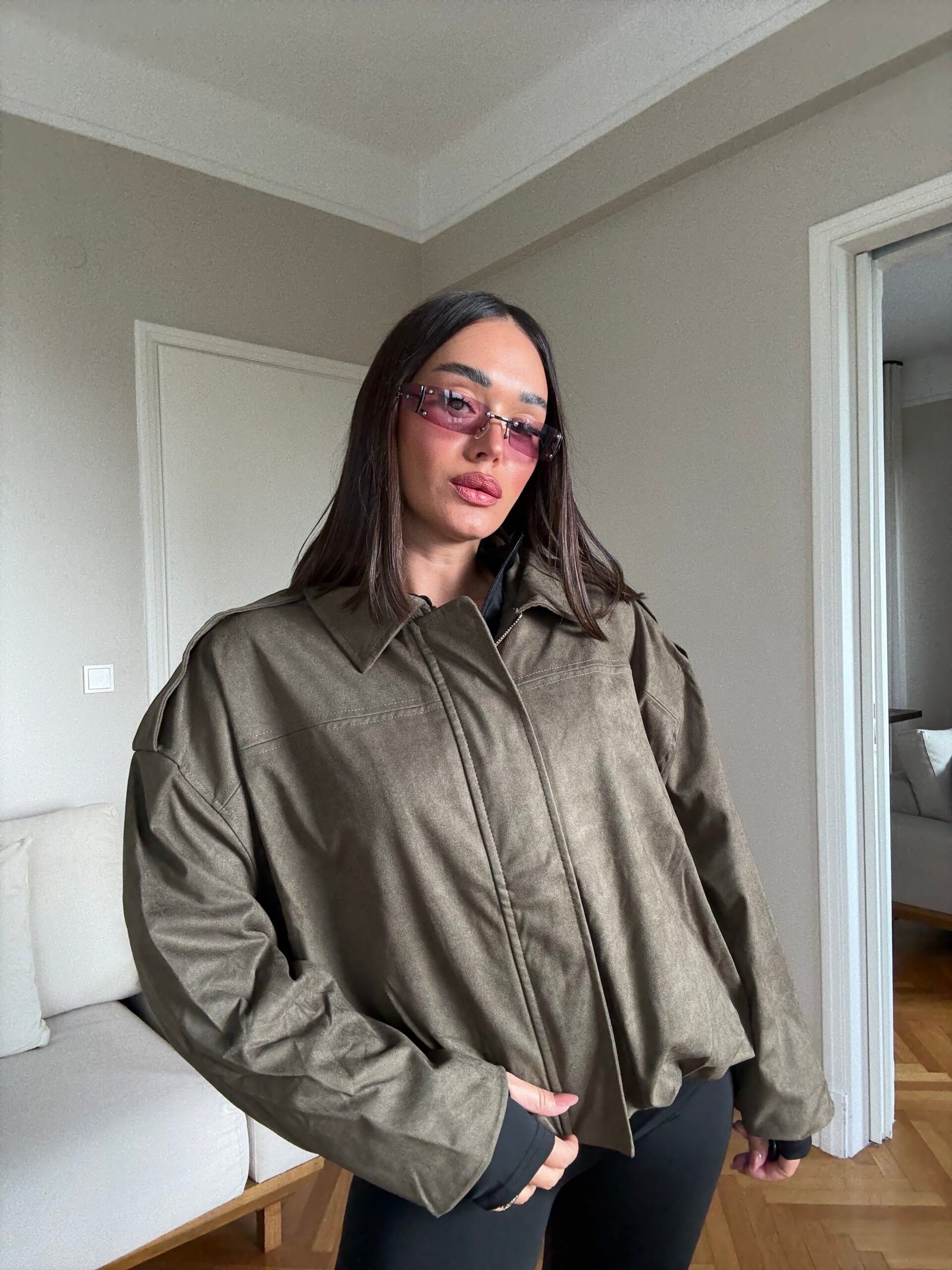 Kjo xhaketë suede me prerje të lirshme dhe gjatësi të shkurtër sjell një pamje urbane me prekje elegante. Me material të butë që jep efekt modern dhe me dizajn minimalist pa detaje të tepërta, është një veshje që bie në sy për thjeshtësinë e saj të sofistikuar.