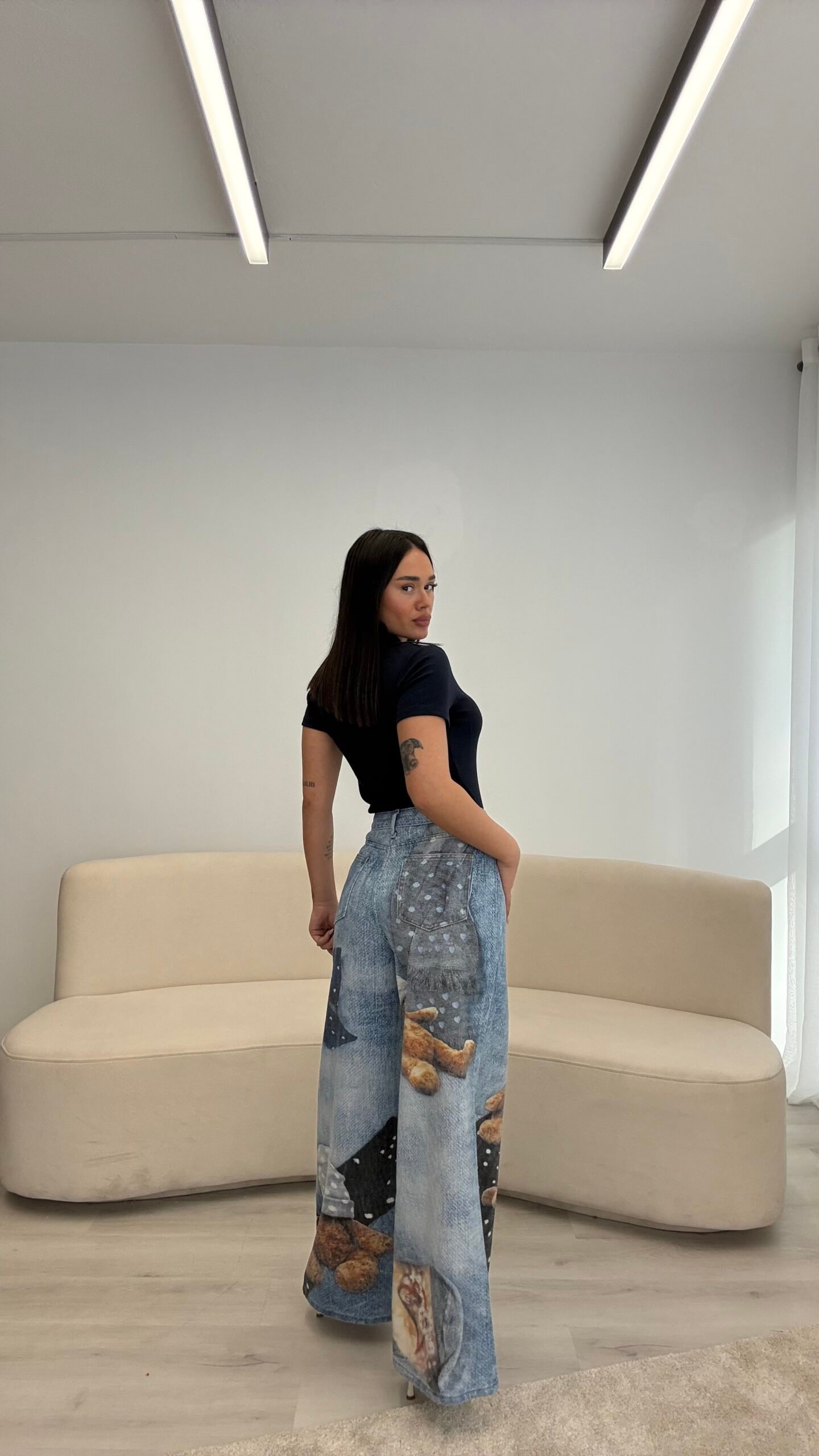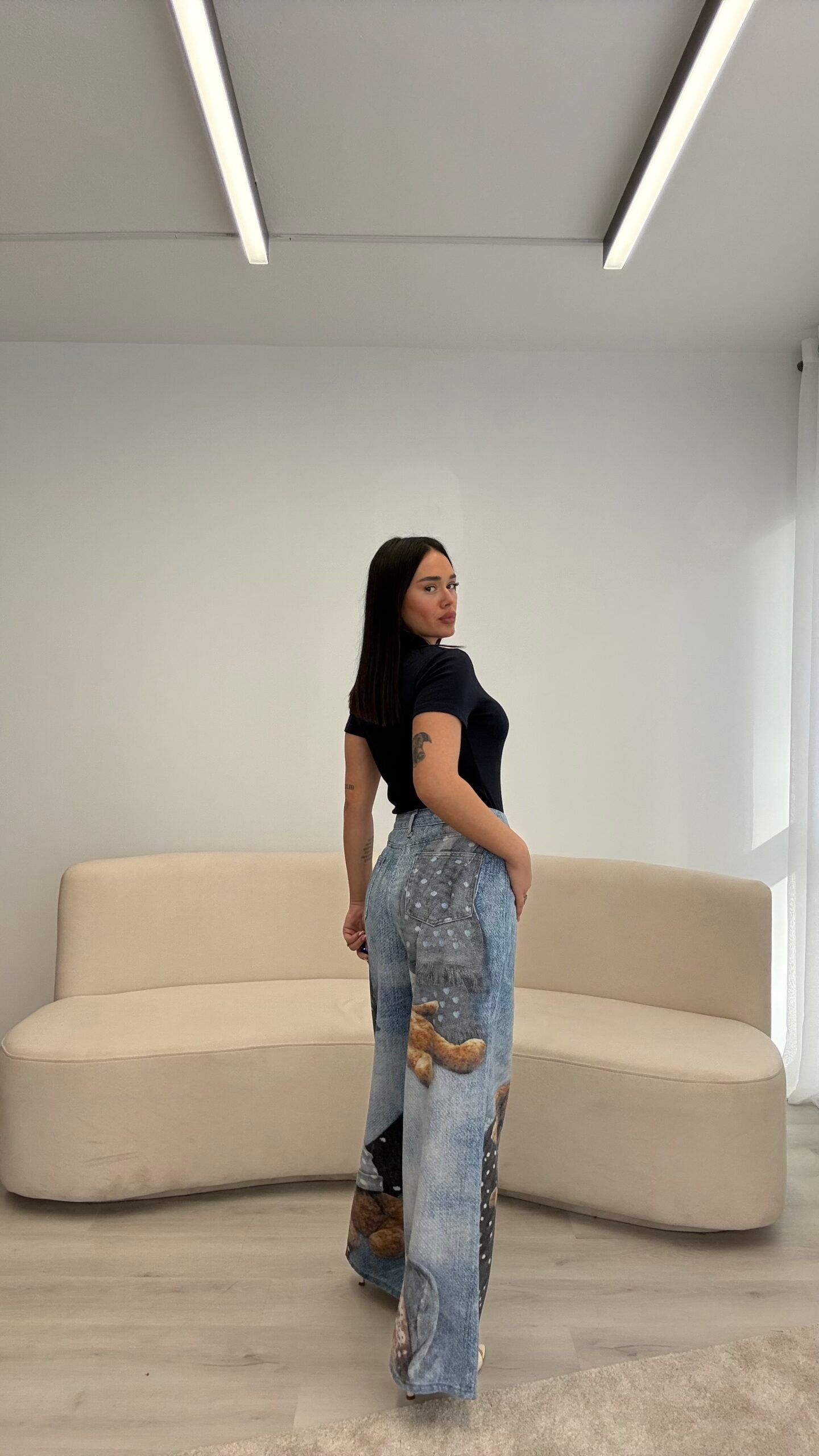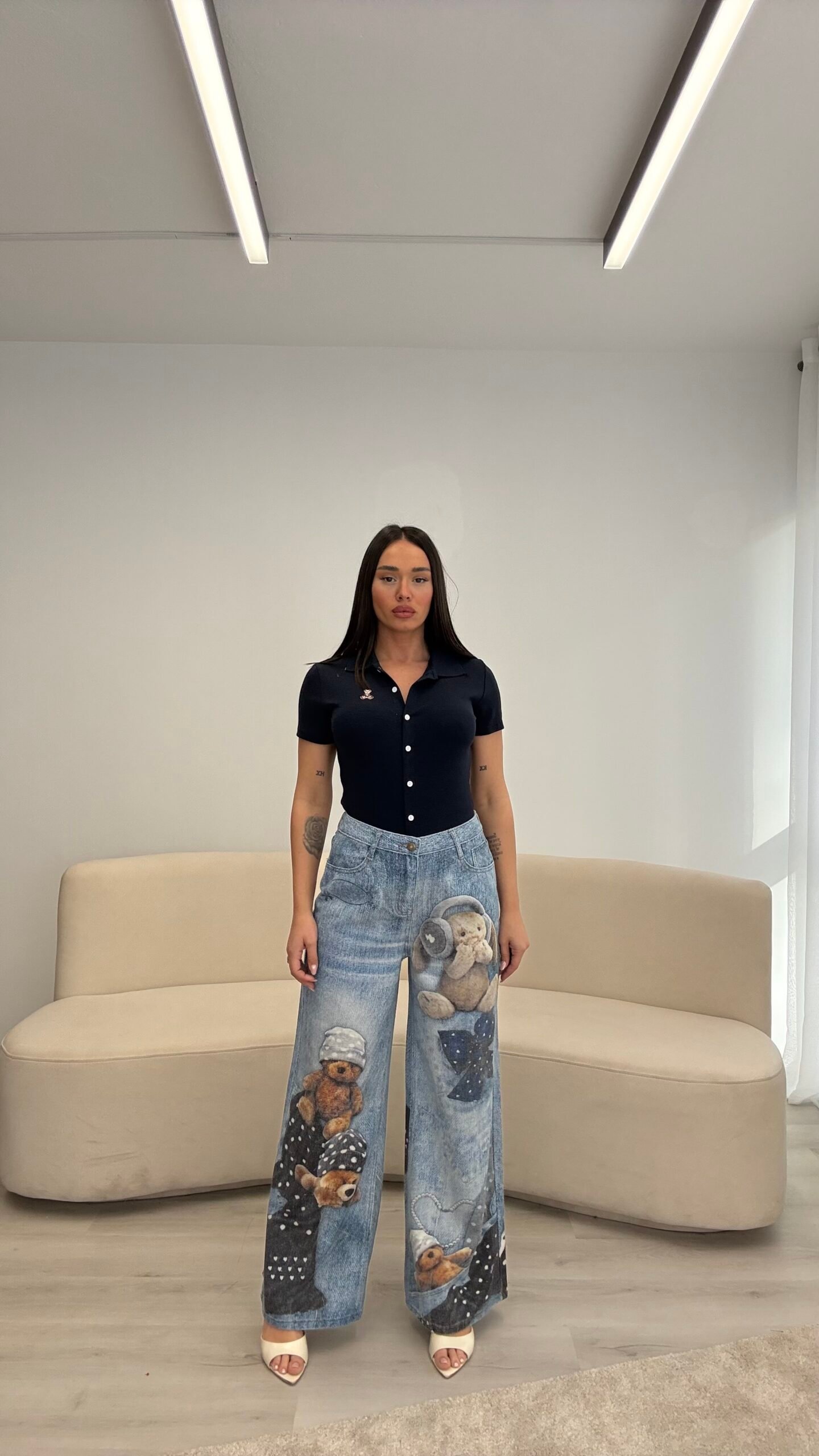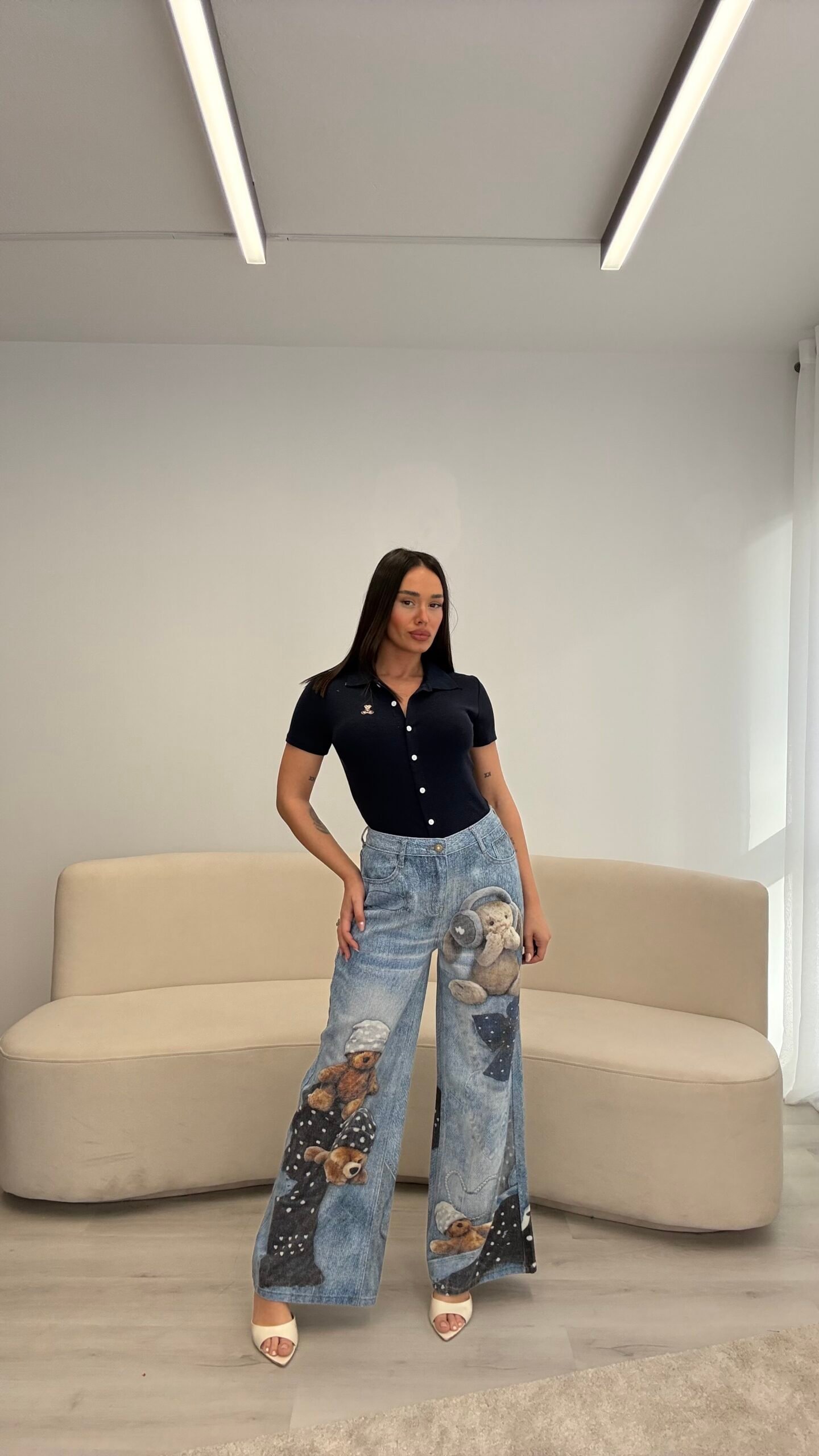 Xhinse me prerje wide leg dhe bel të lartë, që krijojnë një siluetë të pastër dhe të zgjatur. Detaji unik me print teddy në të gjithë sipërfaqen i jep një vibe playful dhe të veçantë, duke i kthyer në një statement piece.
