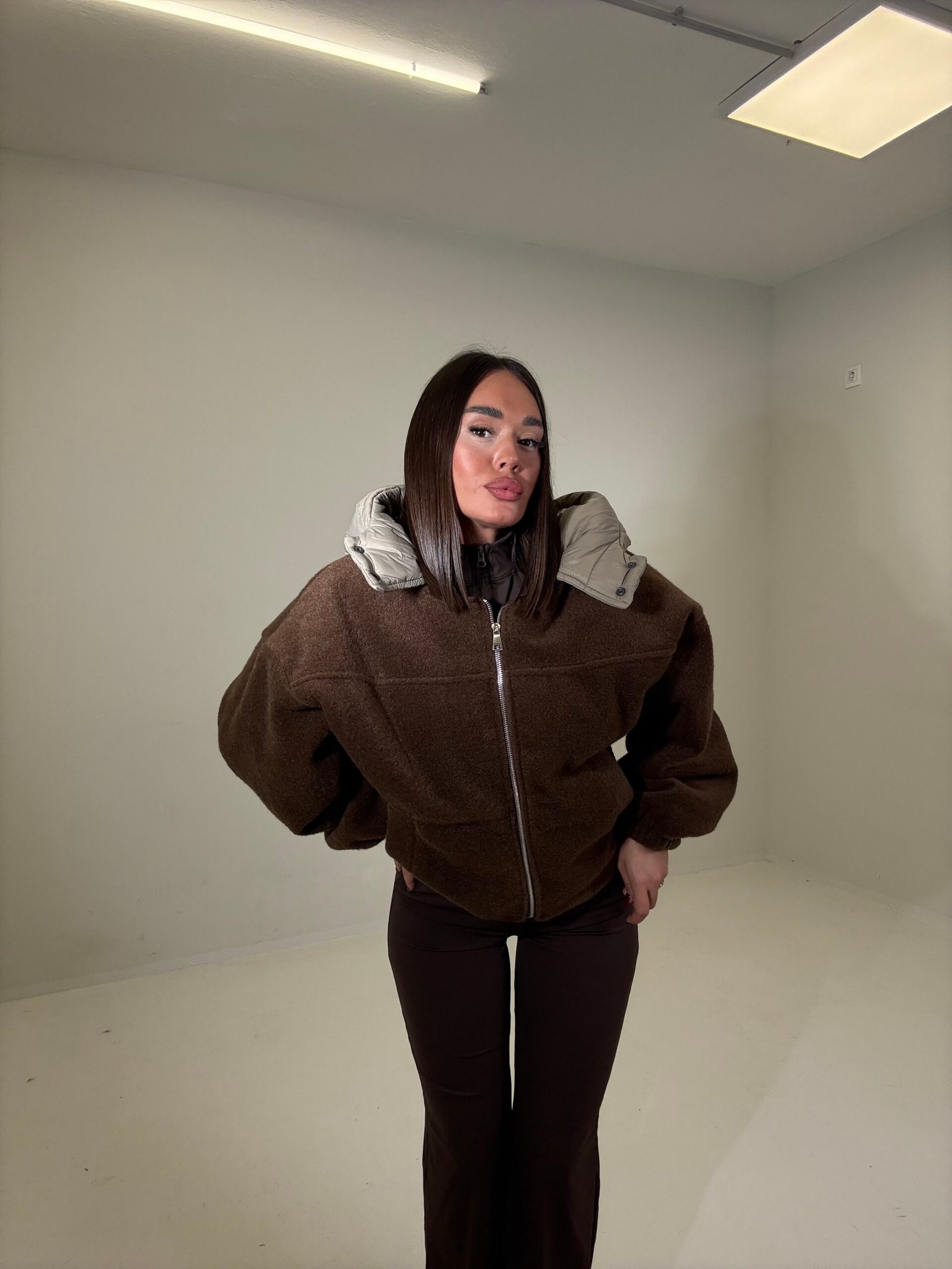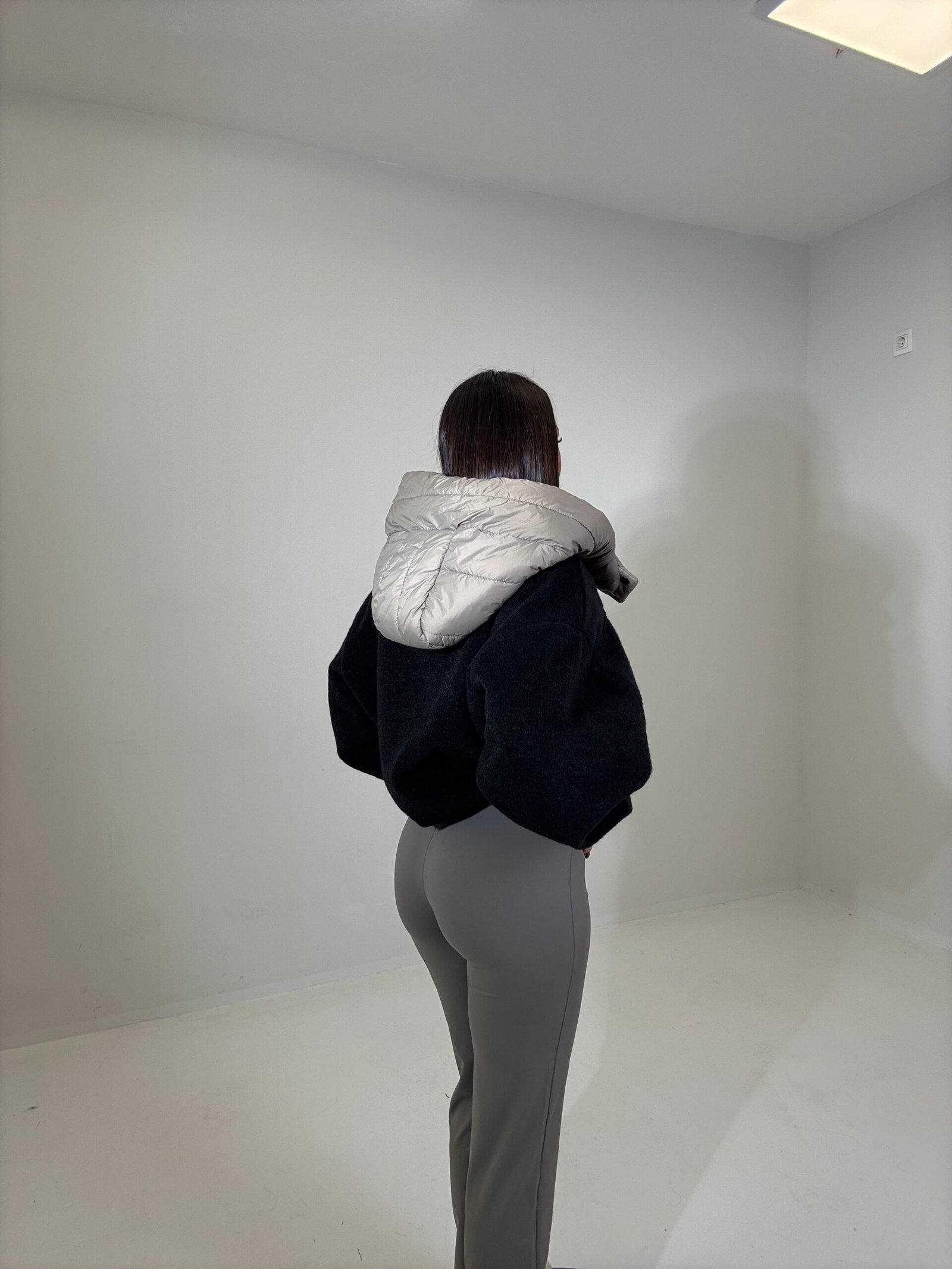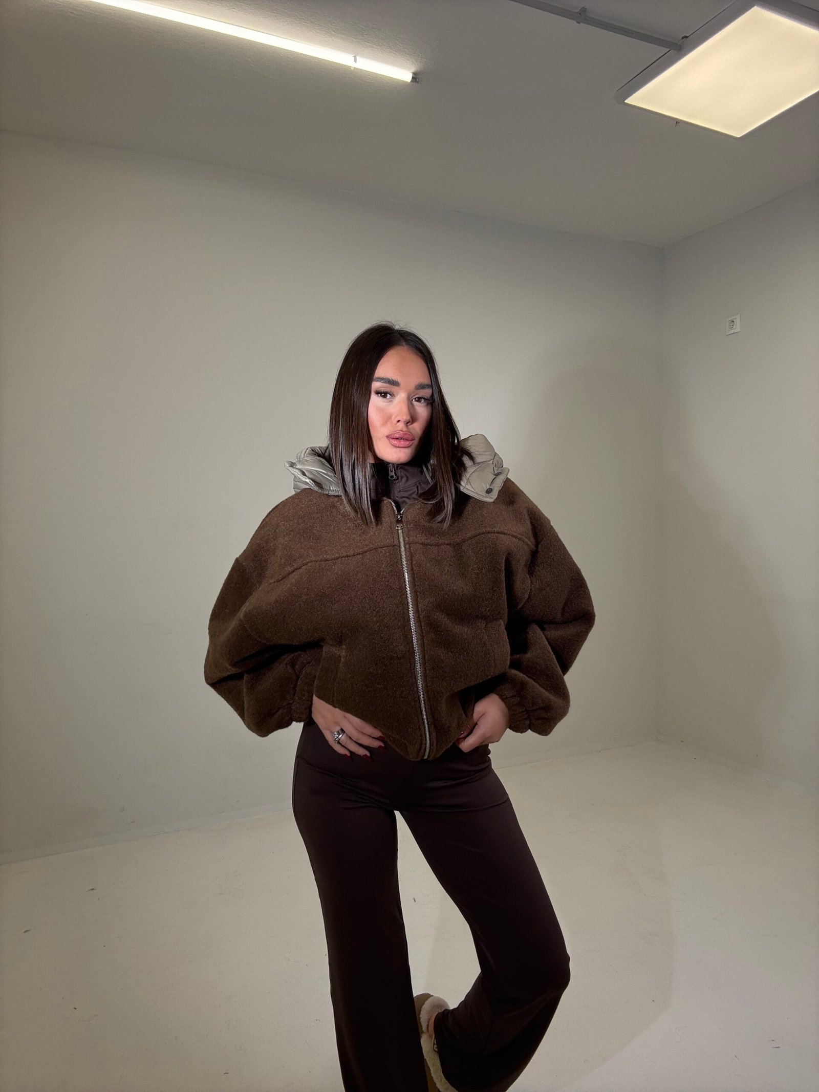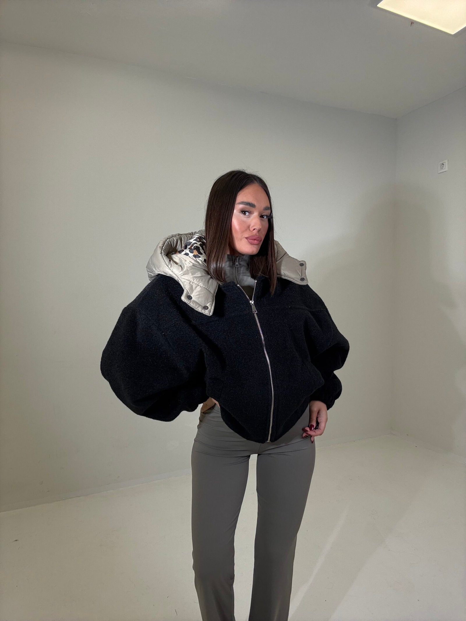 Xhup i shkurtër me teksturë teddy, i kombinuar me kapuc  në material fësh për efekt dyngjyrësh. Ka mbyllje me zinxhir, jakë të lartë dhe kapuç të fryrë të zhvendosshëm për mbrojtje maksimale nga i ftohti. I rehatshëm dhe modern për ditët e ftohta të sezonit.